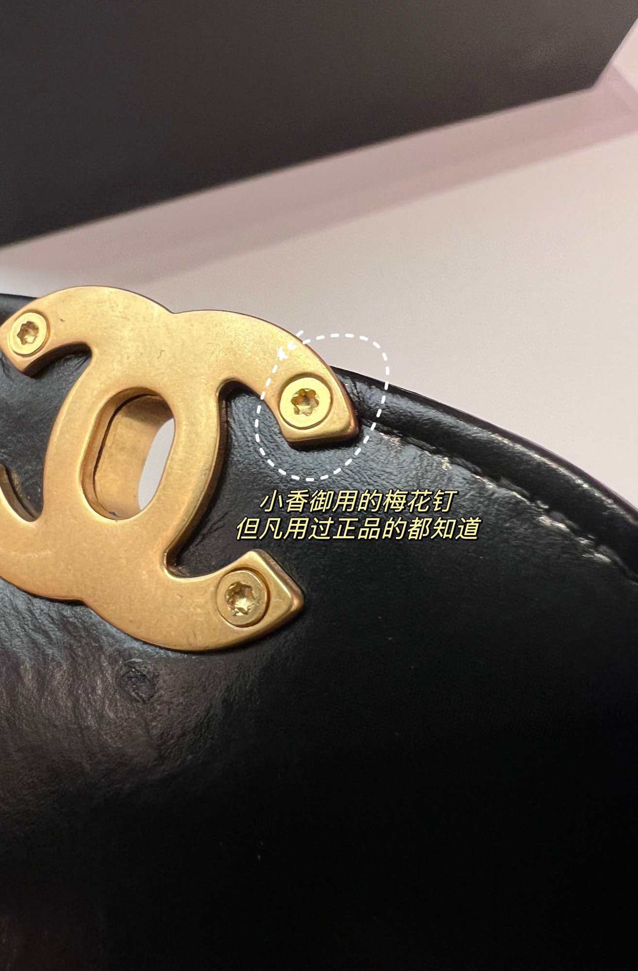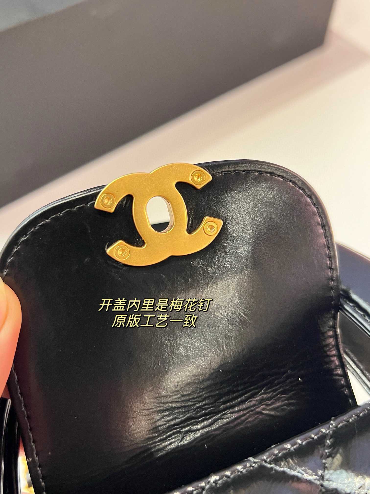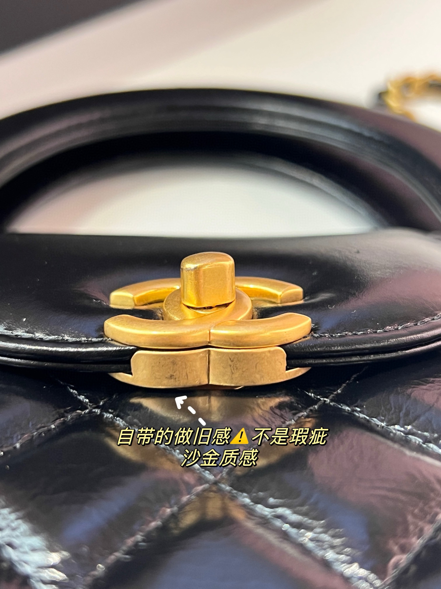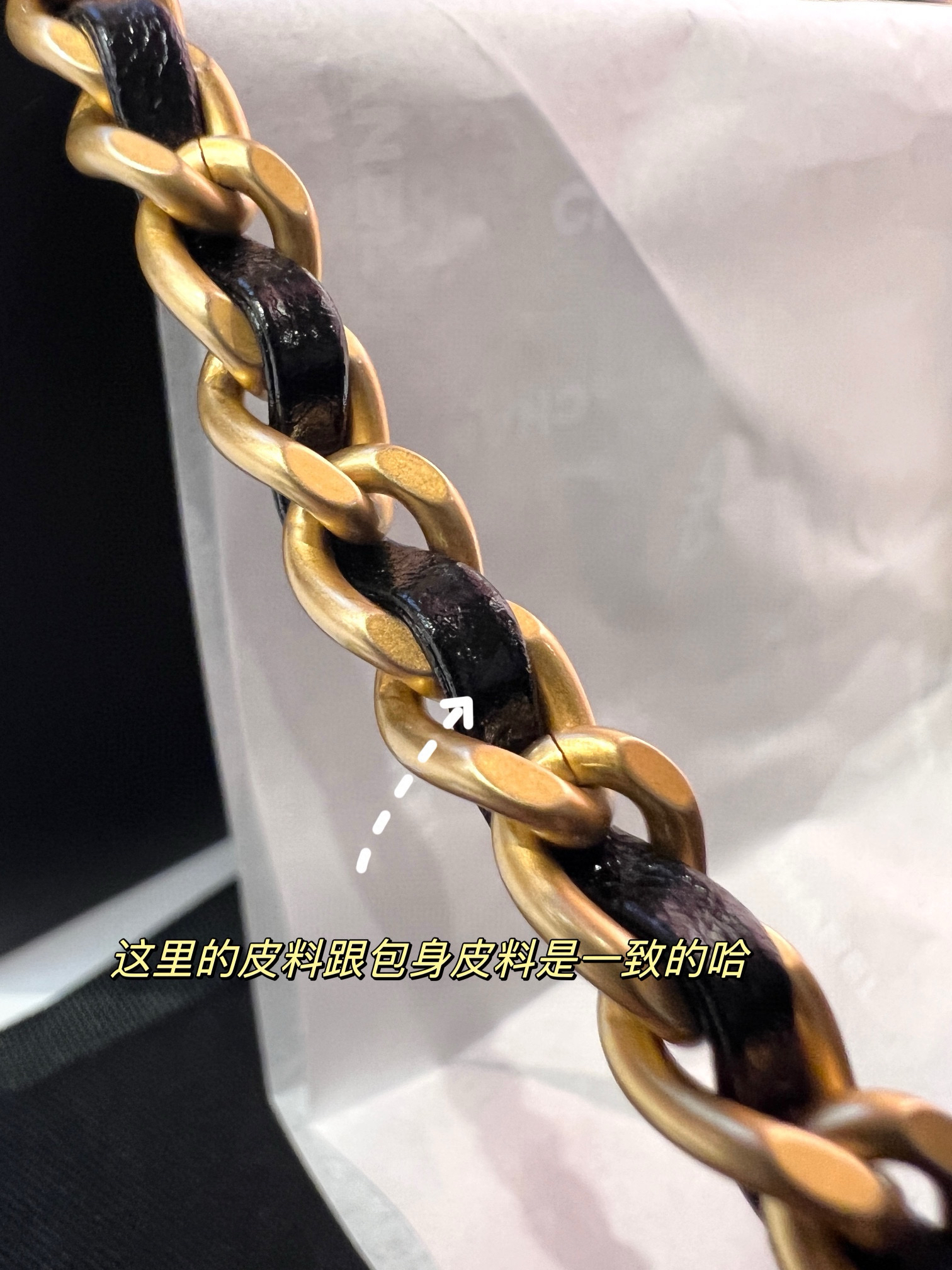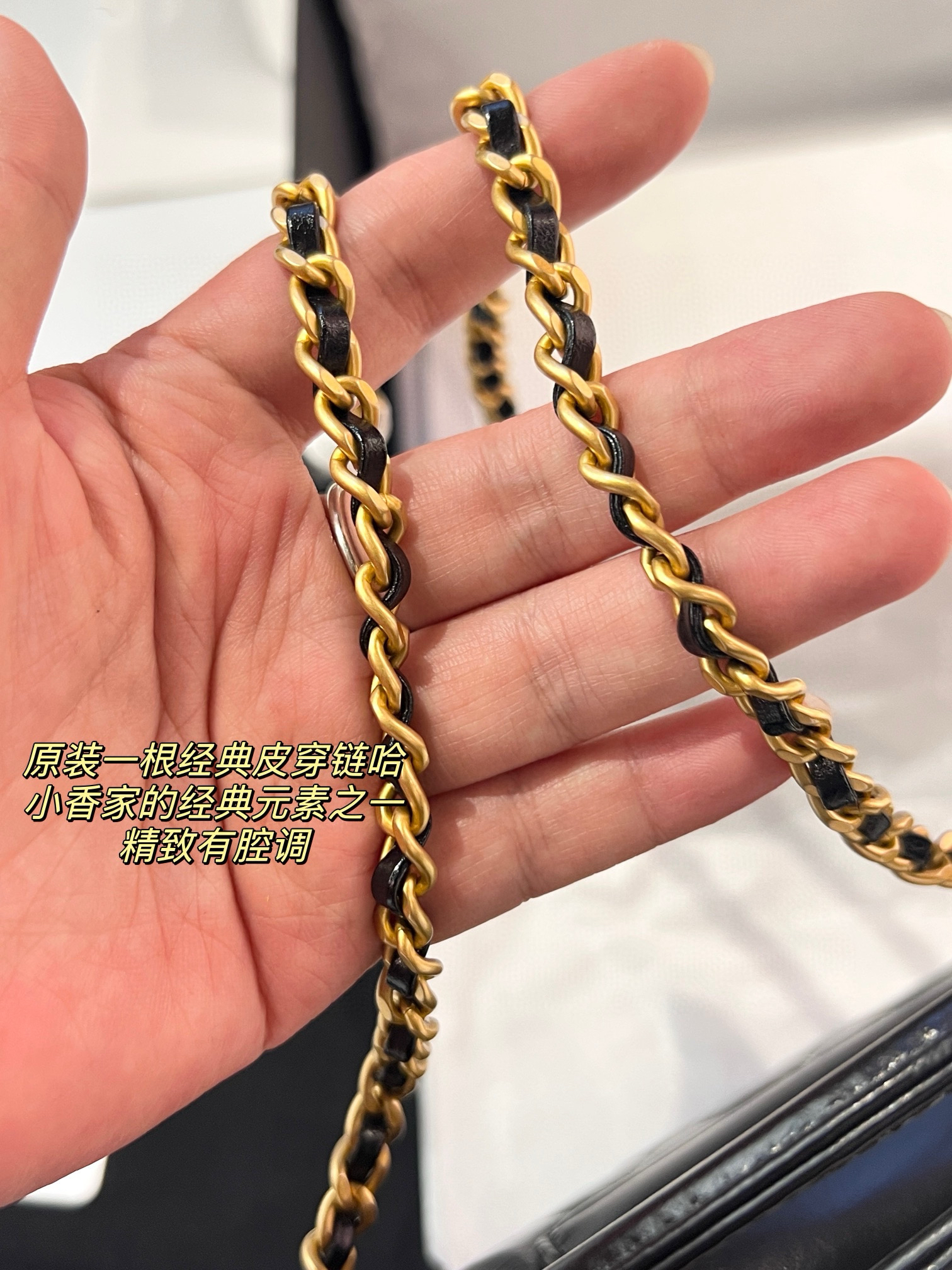 ➡️五金是全钢五金,做旧的复古感,质感特别有腔调,23k包身是小翻盖设计的,盖口是经典双C旋扣设计,开合质感非常好。包身还配有一条皮穿链哈,也是香家经典元素的,链条细节一环一环打磨光滑细致,大家回去可以拿着放大镜看🔍,品相绝对完美。
