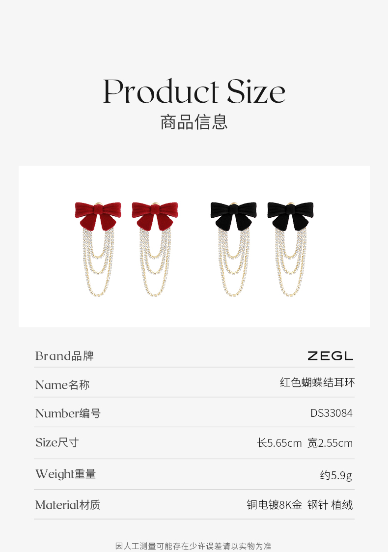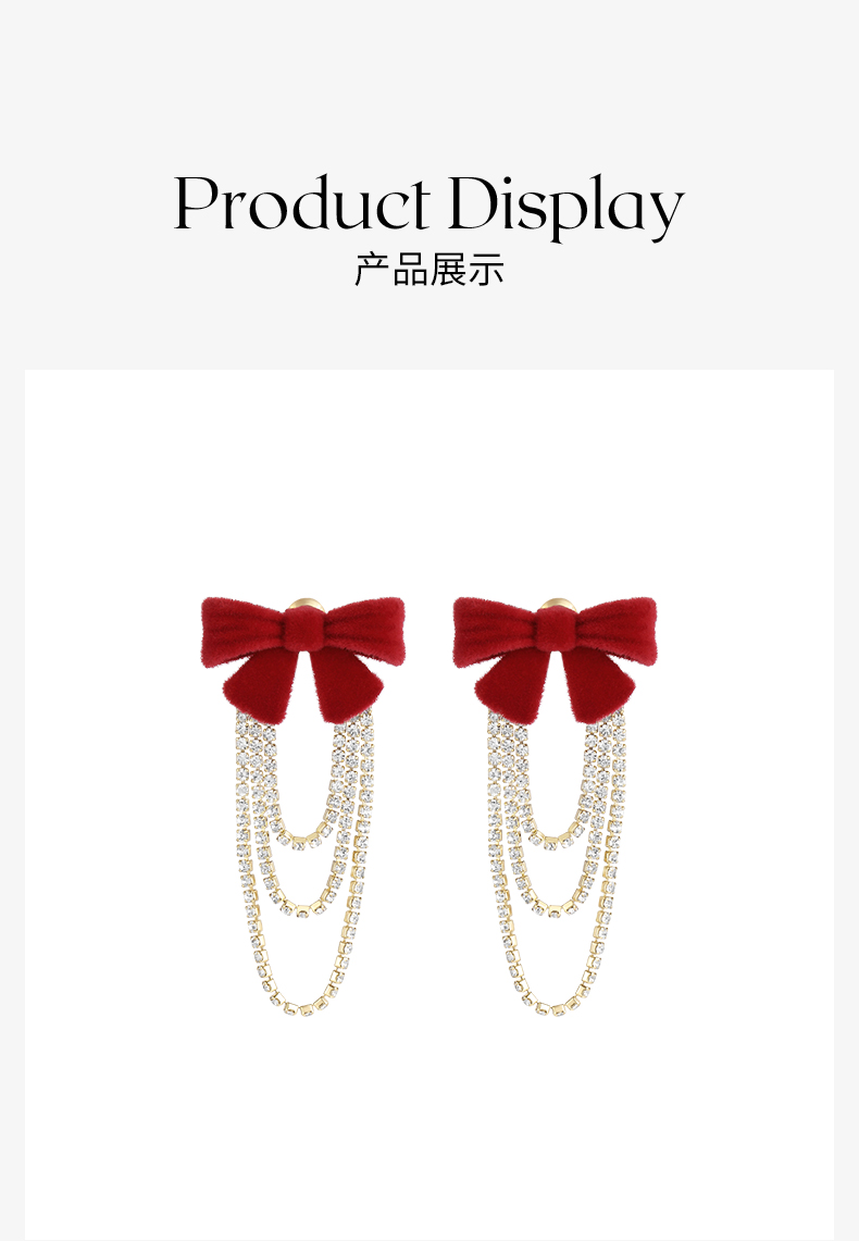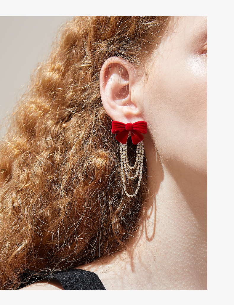 ZEGL红色丝绒蝴蝶结耳环女小众设计感高级流苏耳钉秋冬新年耳饰品