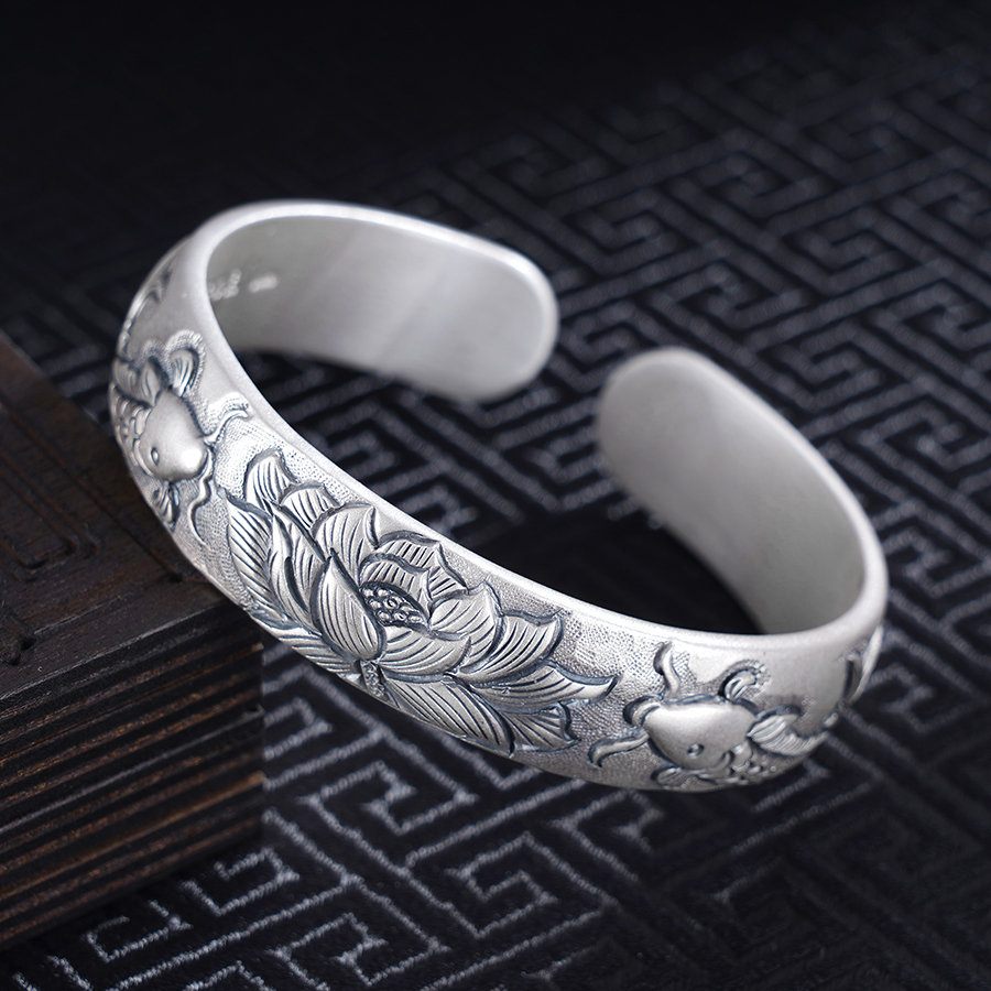 【寓意】:手镯表面施以錾刻工艺,绘就花鱼谐趣之景。鱼戏荷间,相得益彰,象征阴阳调和之哲思,衍生出花鱼相恋、美好相伴的深远意蕴。