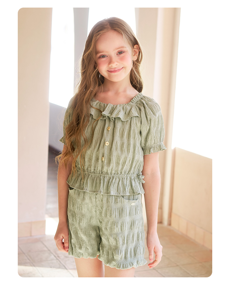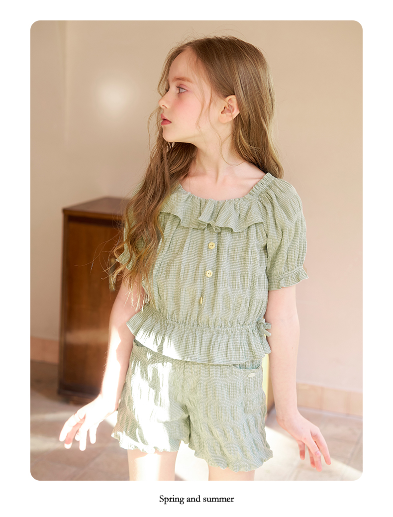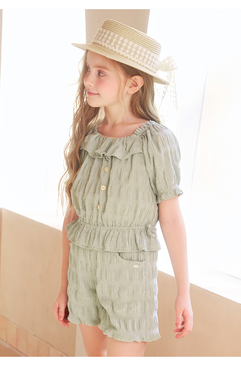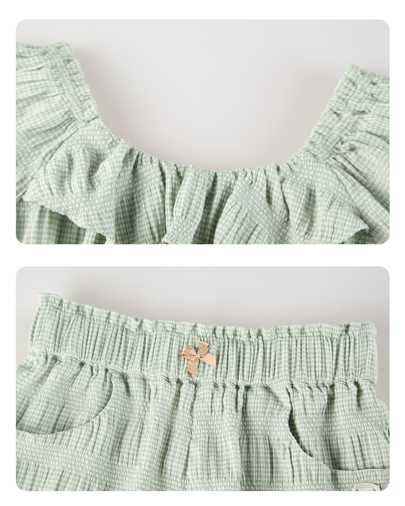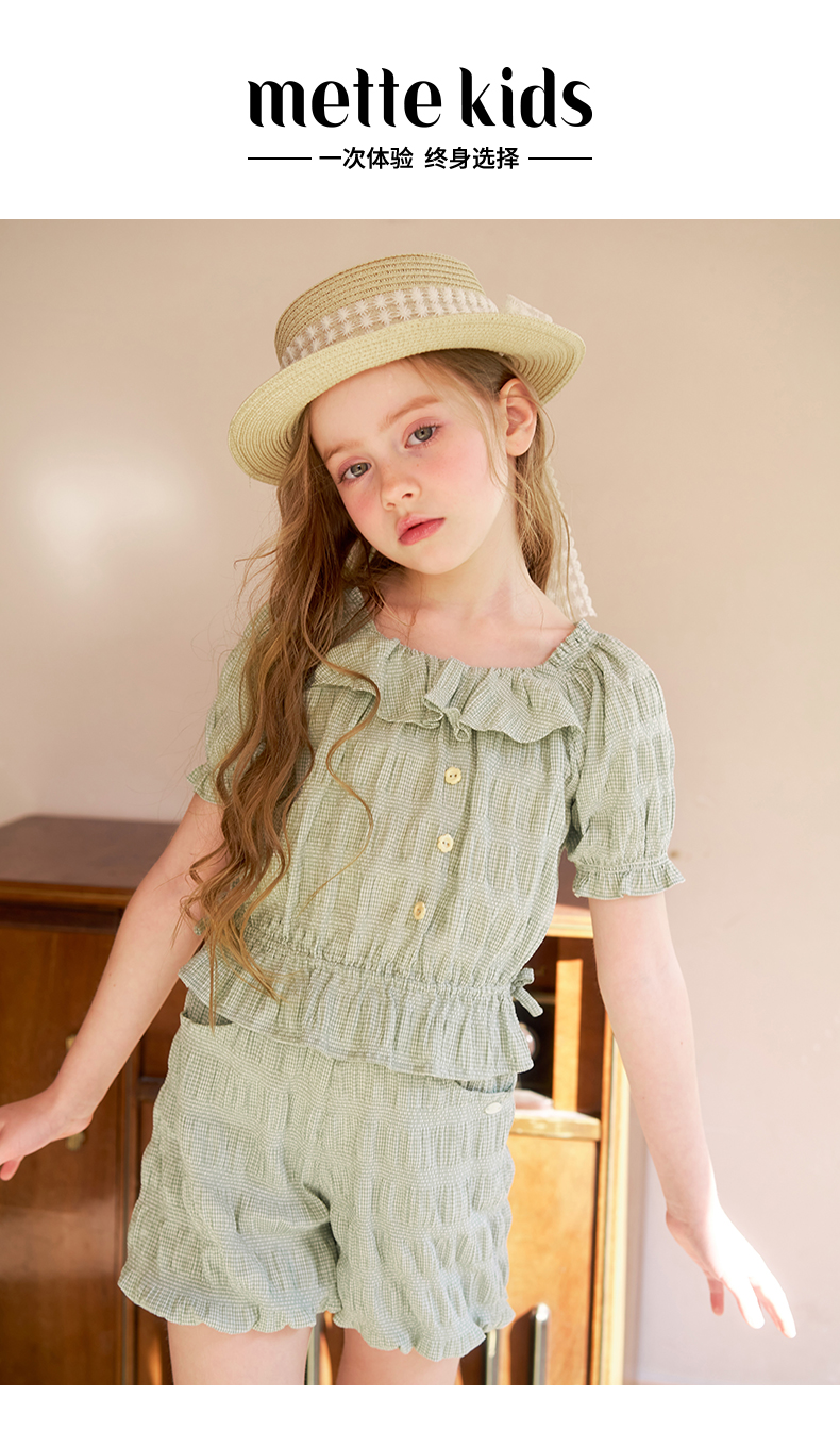 mettekids女童套装夏季女孩绿色格纹短袖t恤上衣儿童休闲短裤童装