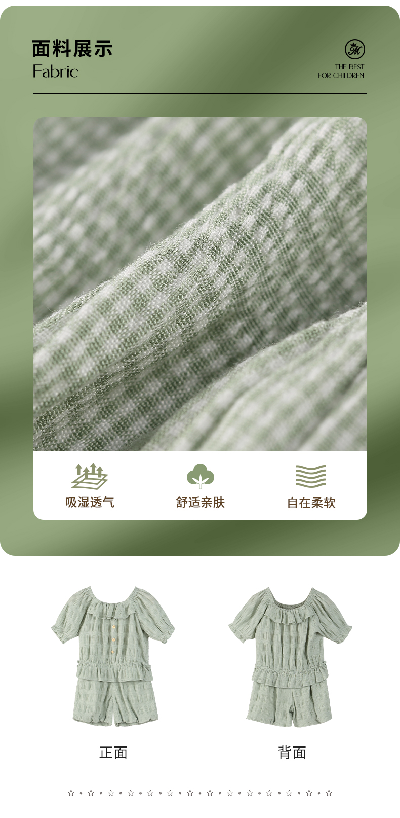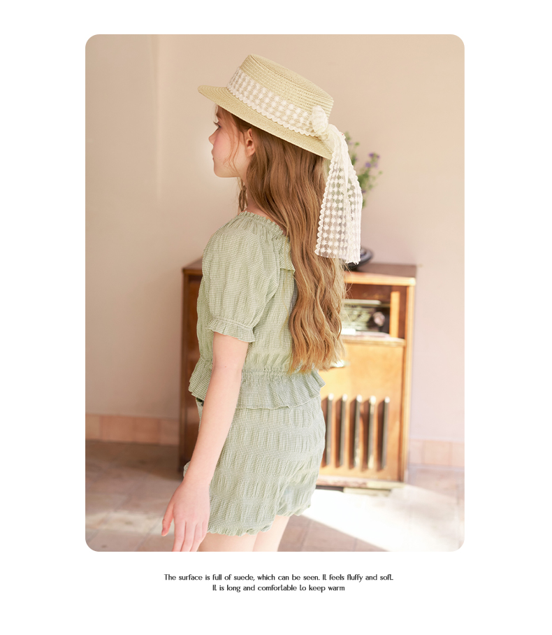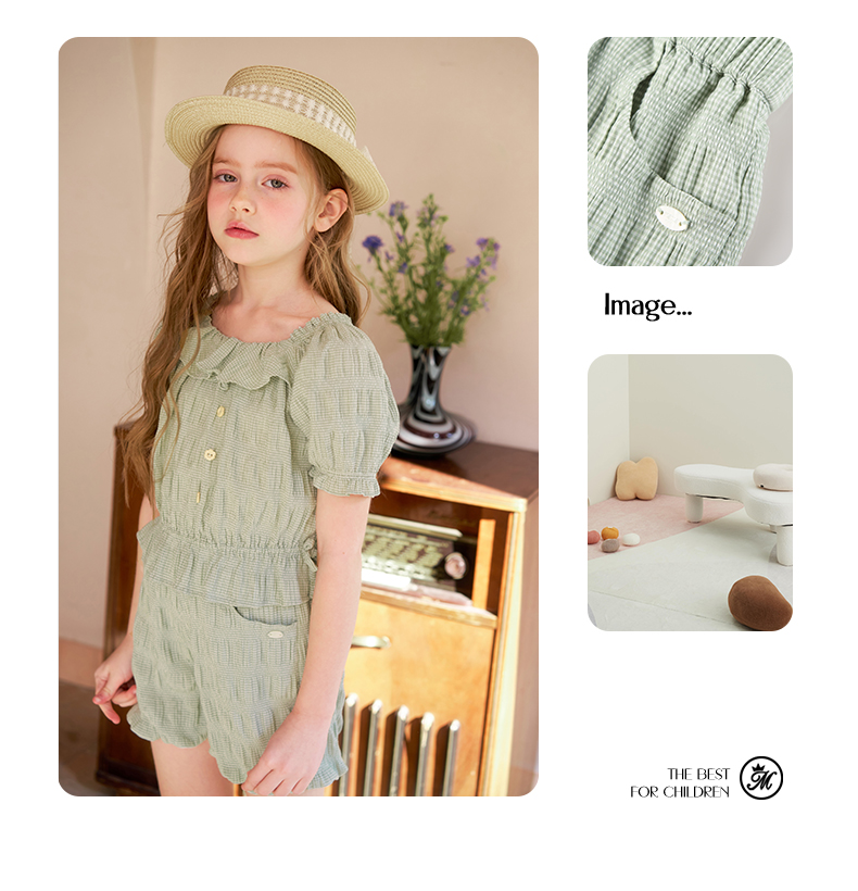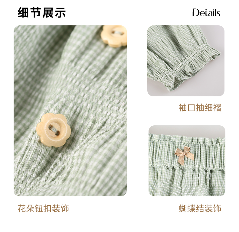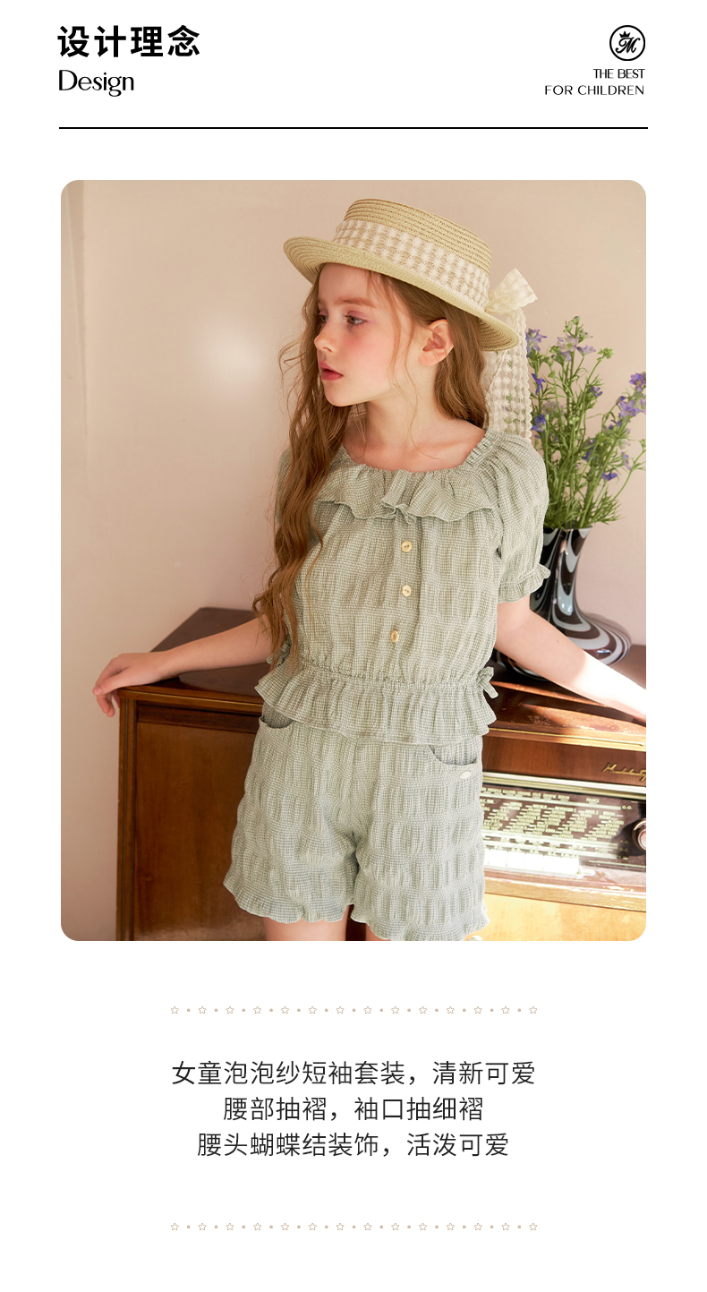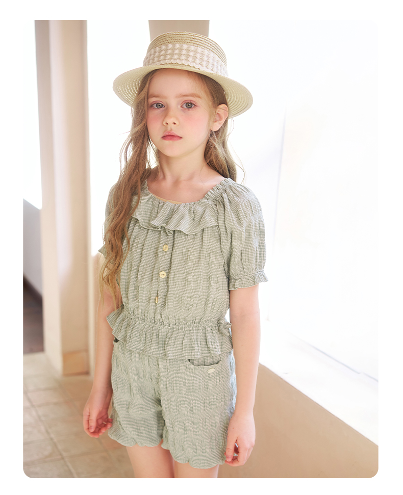 mettekids女童套装夏季女孩绿色格纹短袖t恤上衣儿童休闲短裤童装