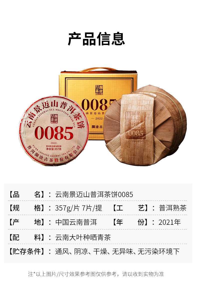 澜沧古茶2022年景迈0085大饼提客装普洱茶熟茶饼茶357g*7片