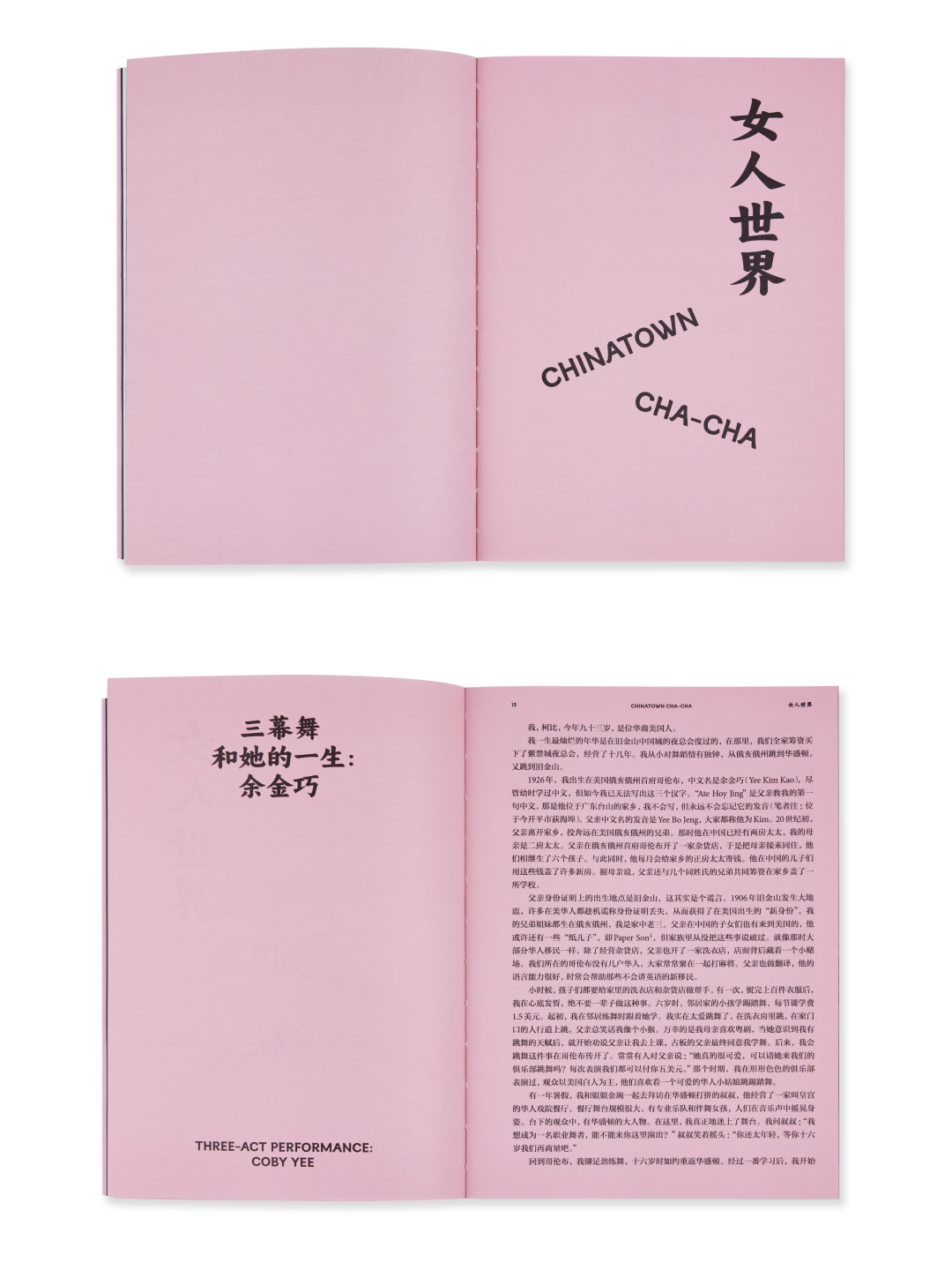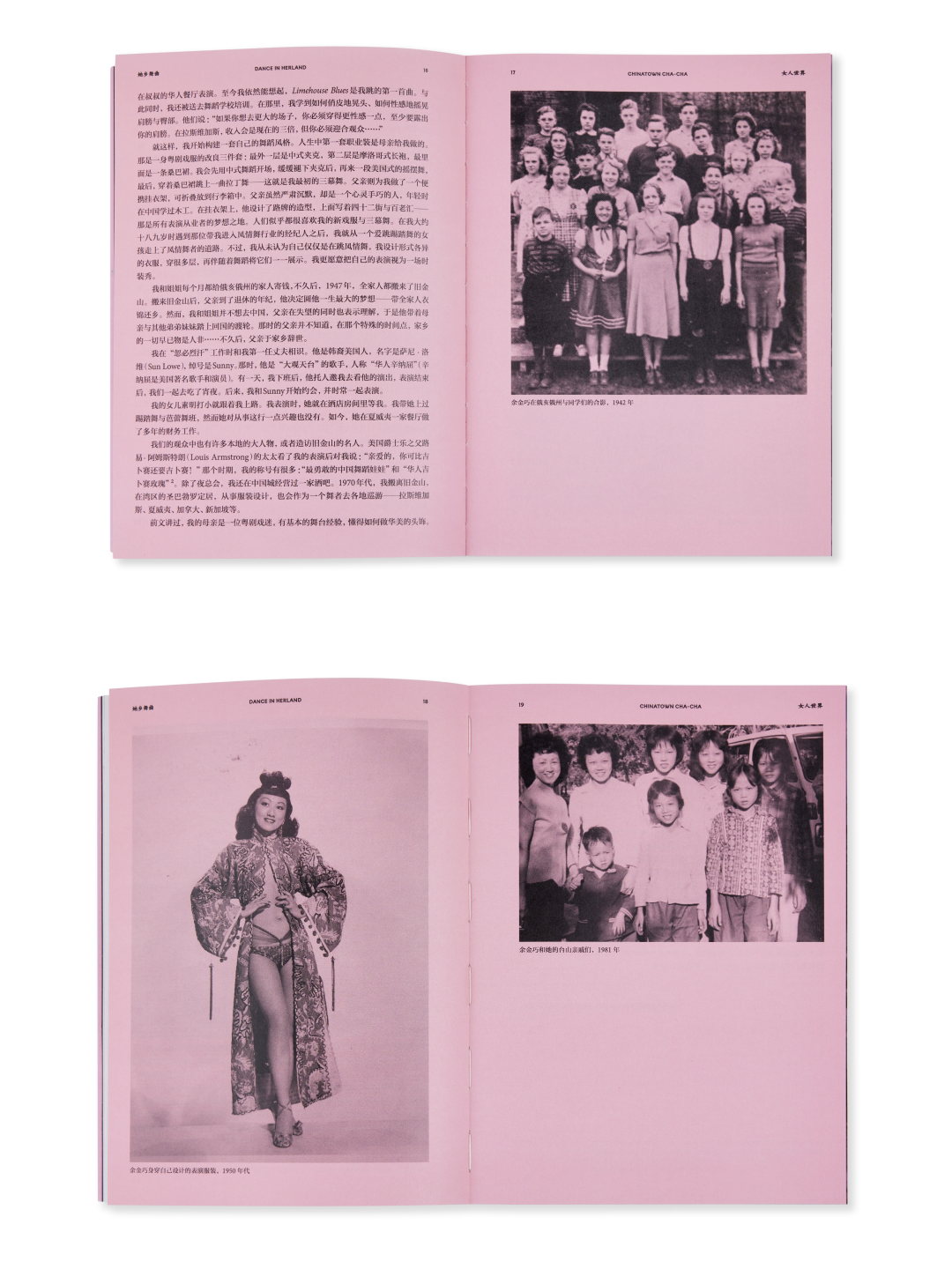 本书主要分为两个章节。第一章《女人世界》通过六位舞者对昔日唐人街的口述缓缓拉开历史帷幕,引领读者跨时空感受由盛转衰的夜总会。圆圆采访了已过世的唐人街传奇舞者和紫禁城夜总会老板余金巧,以及下一代舞者方美仙和其参与创办的都板街舞团,后者至今仍在美国各地的社群和公益项目中演出。本章特邀艺术史学家兼策展人王辛探讨华裔舞者在表演中如何应对被西方世界塑造的“东方主义”印象,以及如何重新理解离散华人群体。