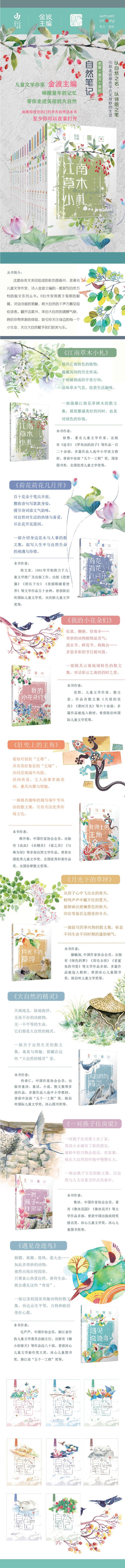 这套由美文美绘组成的彩色图文书,是著名儿童文学作家、诗人金波主编的一套叙写自然万物的散文系列丛书。8位作家用善于观察的眼睛、灵动诗意的笔触,将大自然的千声万籁呈现给读者。翻开这套书,来自大自然的清醇气息,将给你带来新的体验,吸引你关注身边的每一个小生命,关注大自然赋予我们的美与乐。