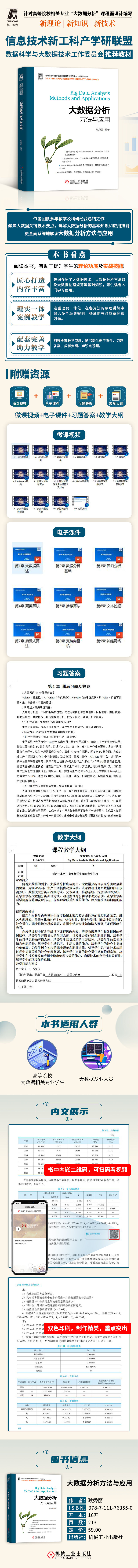 本书作为大数据公共通识课程的导论教材,为高校学生选修大数据课程编写,主要面向大数据应用型人才培养,也可供相关技术人员参考。