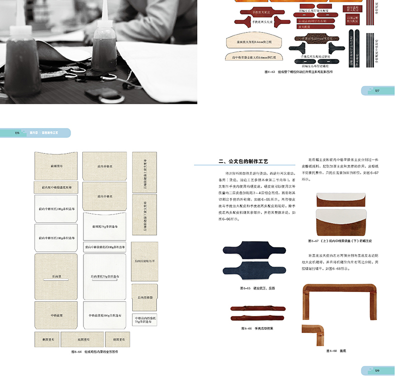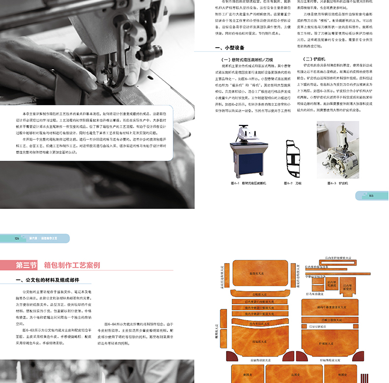第六章 箱包制作工艺 / 101第一节 常用机械设备 / 103一、小型设备 / 103二、机缝工具及耗材 / 108三、台面工具及耗材 / 110第二节 常用工艺简介及制作流程 / 112一、开料工艺技法 / 112二、铲皮工艺技法 / 113三、台面工艺技法 / 113四、机缝工艺 / 117五、制作工艺 / 120第三节 箱包制作工艺案例 / 126一、公文包的材料及组成部件 / 126二、公文包的制作工艺 / 129附录 / 139