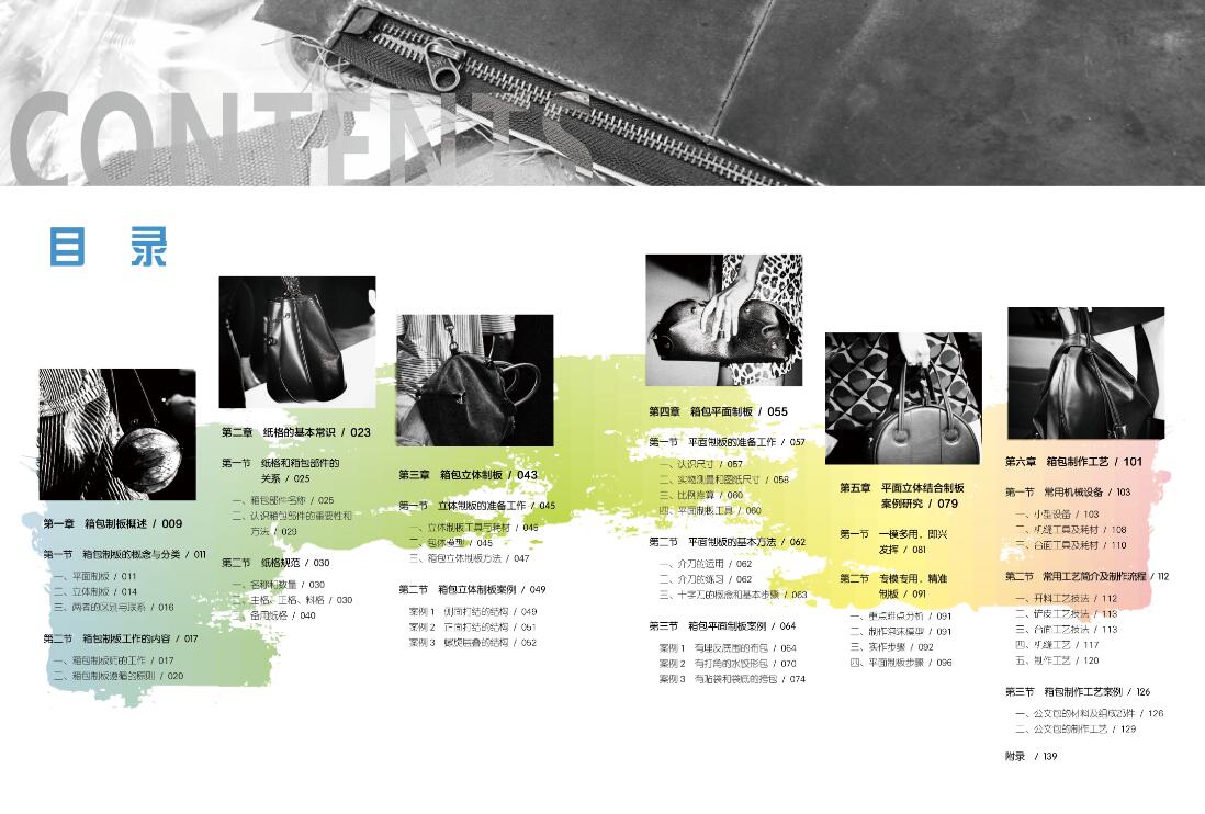 中国是一个箱包制造大国,但目前“大市场,小企业,弱品牌”的现状已促使我国的箱包行业面临新的产业转型。转型意味着创新,而创新则需要依托于大量能创新的设计师和孕育设计师的摇篮。在漫长的专业建设的探索道路上,恰逢箱包产业转型的时机,与此同时,我校艺术设计系于2011 年建立了平面与时尚专业,在此基础之上又诞生了重庆交通大学马蒂亚斯时尚创意孵化基地、时尚品研发与“双创”人才孵化基地、设计学类人才培养模式创新实验区等一系列立足于传统设计专业、开拓以箱包和首饰为主的时尚品设计体系、不断深化时尚品设计学科国际合作的综合平台,这都为这个新兴的专业发展成为填补国内专业空缺的生力军打下了坚实的基础。箱包设计是我国新兴的一门设计学科方向,虽然从属于服装与服饰品专业,但由于起步较晚,少有以往所累积的经验,因此,大多数院校仍然只是把箱包设计作为一门选修课程或将其教学内容归入服饰品设计的课程大类之中,课程教学内容没有得到有效的补充和深化。我们依托校内的硬件基础、校企联合以及国际合作的平台,在多年箱包设计教学与实践的基础上,组织教师编写了这套相对完整、特色鲜明并贯穿从箱包设计到制作所有课程的核心教材——箱包设计专业系列教材。本系列教材内容涉及箱包的设计流程、效果图表现技法、材料应用、制板与工艺,根据专业和行业的发展情况,还会适时加入与箱包品牌和营销有关的教材,以丰富全套教材的内容。这套教材不仅适合作为箱包设计专业的教材使用,也可以作为服装与服饰品专业的教学参考书,还是广大箱包企业设计师和箱包设计爱好者的专业读物。希望本系列书的出版,能够填补我国相关设计专业教材的空缺、丰富相关设计专业的教学内容,能够提供更有效的教学实践方法,更贴近我国箱包产业对高校人才的需求。此系列书的出版过程中,得到了重庆交通大学马蒂亚斯国际设计学院和中国纺织出版社等单位及多位专家的大力支持,在此一并表示衷心感谢。 丛书主编 曾强 2018 年5 月15 日