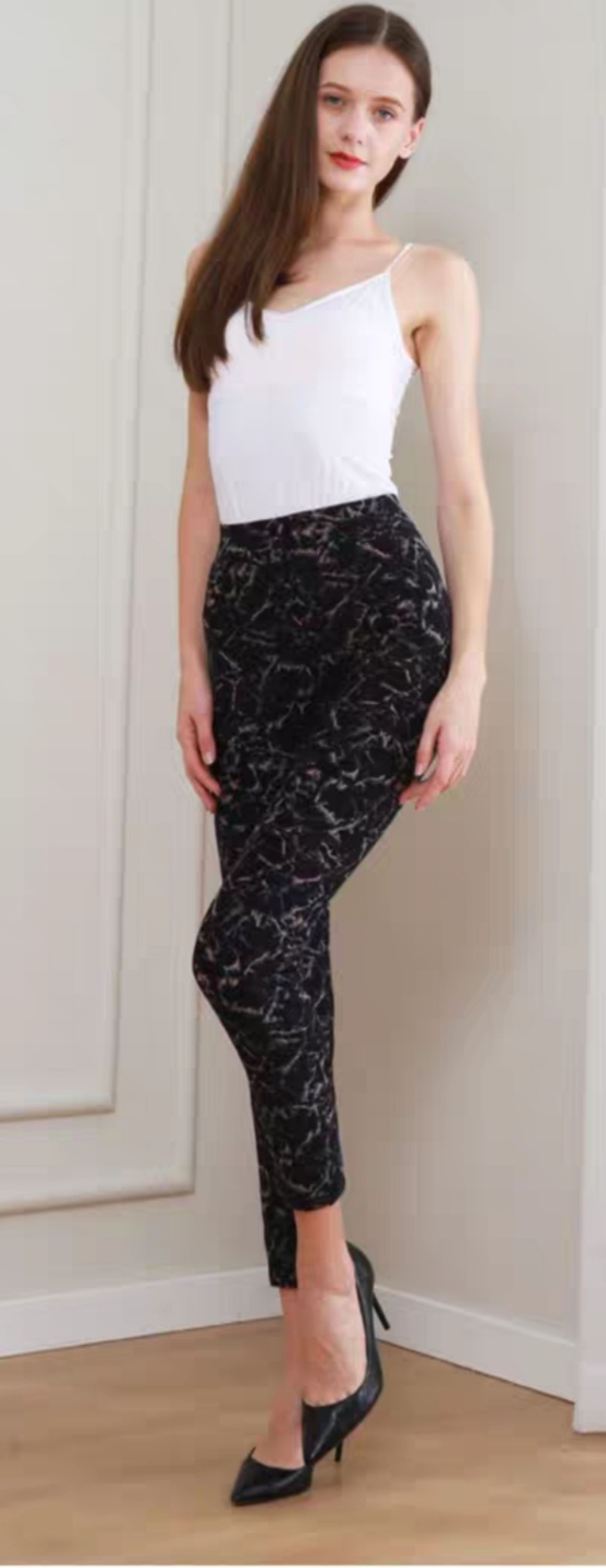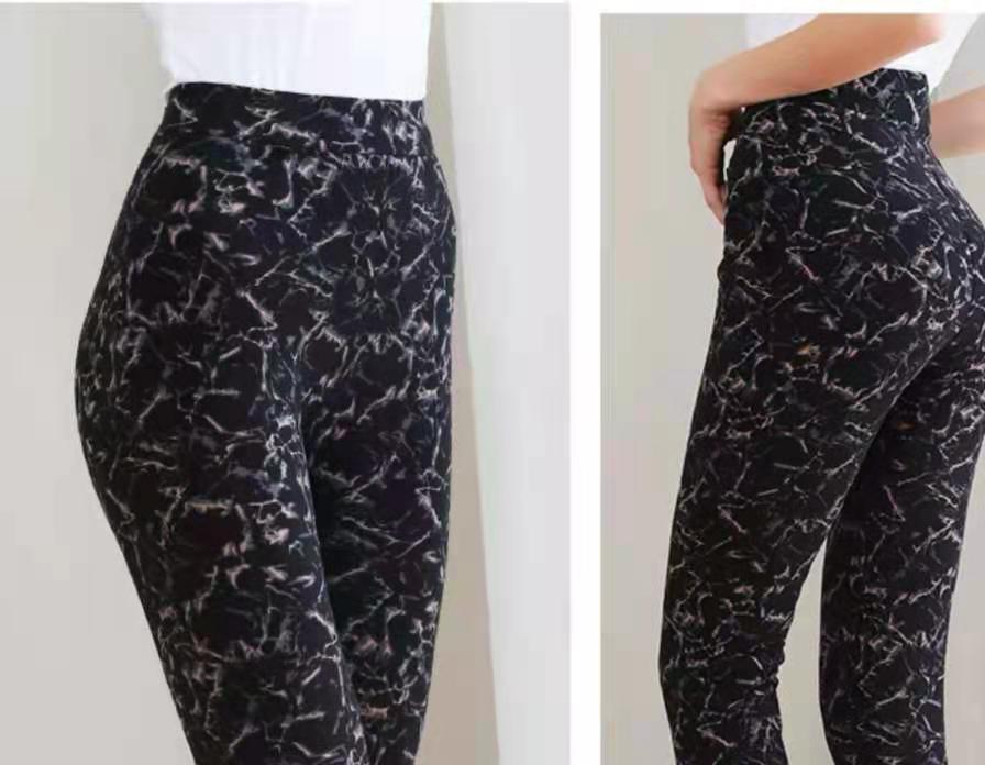 九鹿羊羊毛裤7602,黑色印花图案,填充物含有73%羊毛25%的桑蚕丝2%的其它,面料89%聚酯纤维11%氨纶,从80斤到140左右都可以穿着,编码04428843
