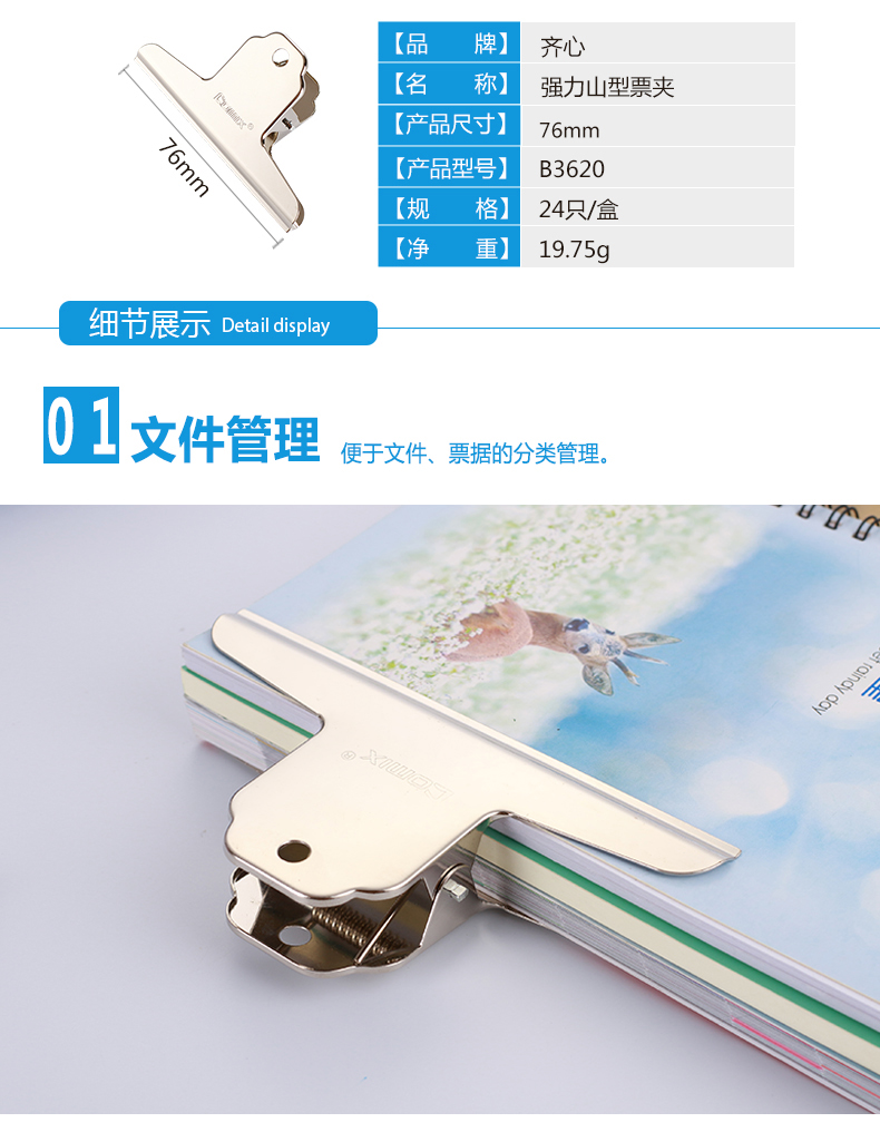 齐心强力山形票夹3号B3620