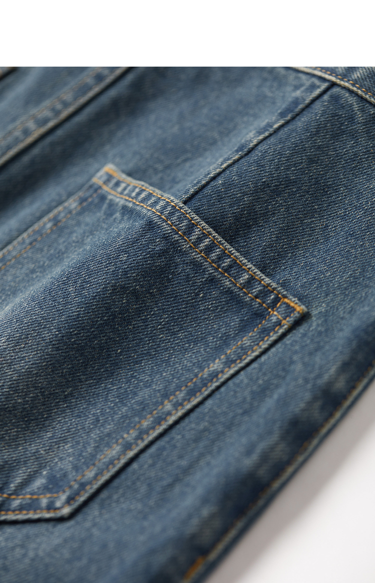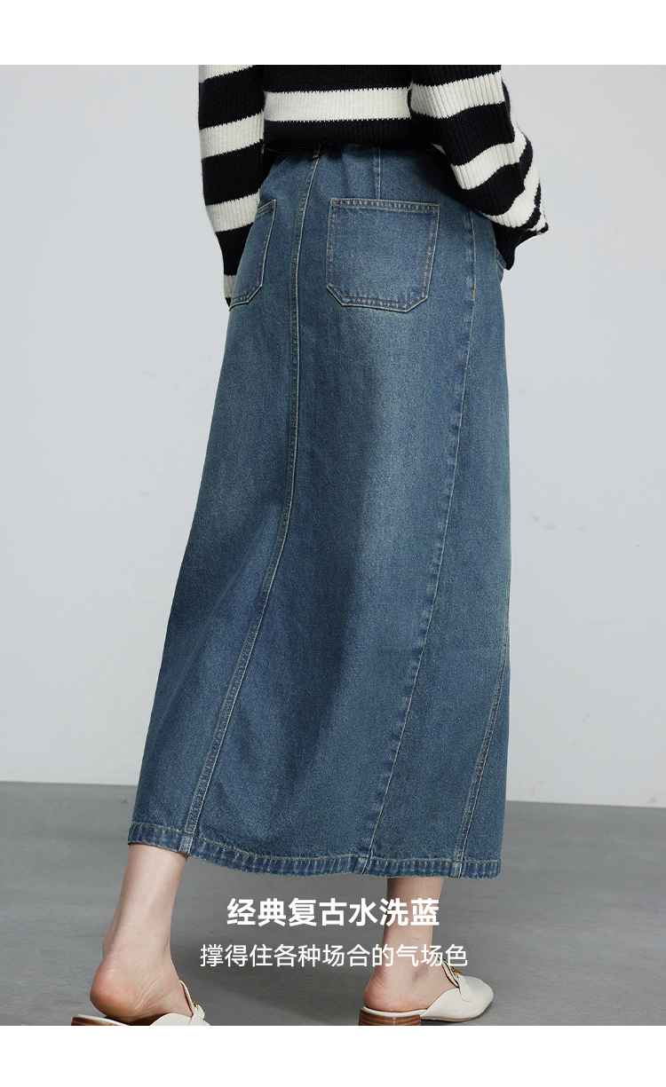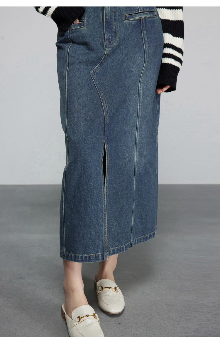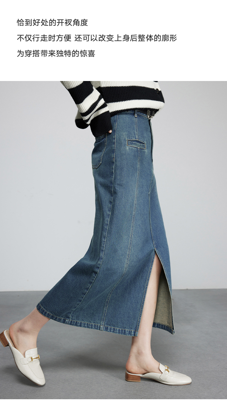 342617009棉仓复古水洗全棉牛仔裙女春新款拼接设计感半身裙中长款前开叉
