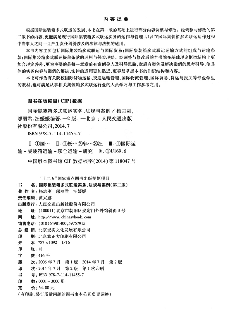 书名:国际集装箱多式联运实务、法规与案例(第二版)