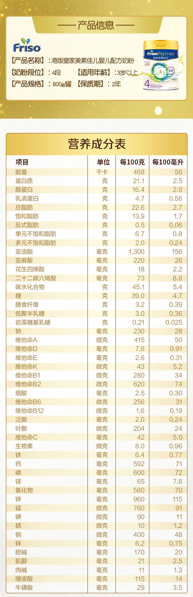 [大罐4段]港版 皇家美素佳儿Friso Prestige 成长配方奶粉4段(3岁以上)800g