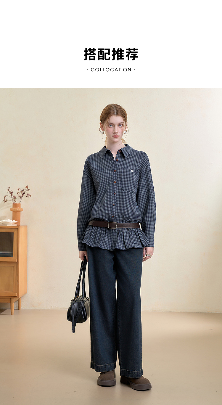 西遇复古蓝色格纹衬衫女秋季新款收腰荷叶边设计感衬衣外套V3655263