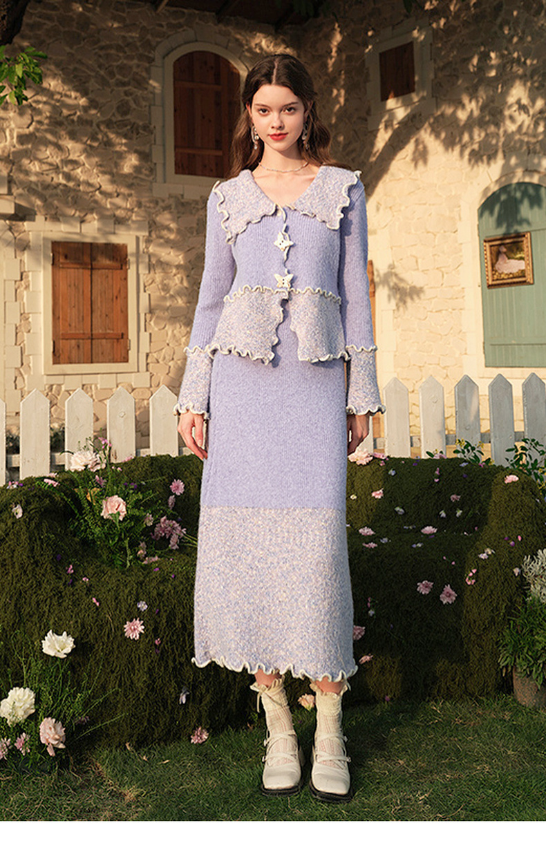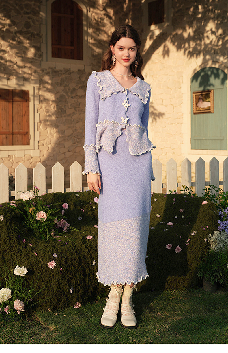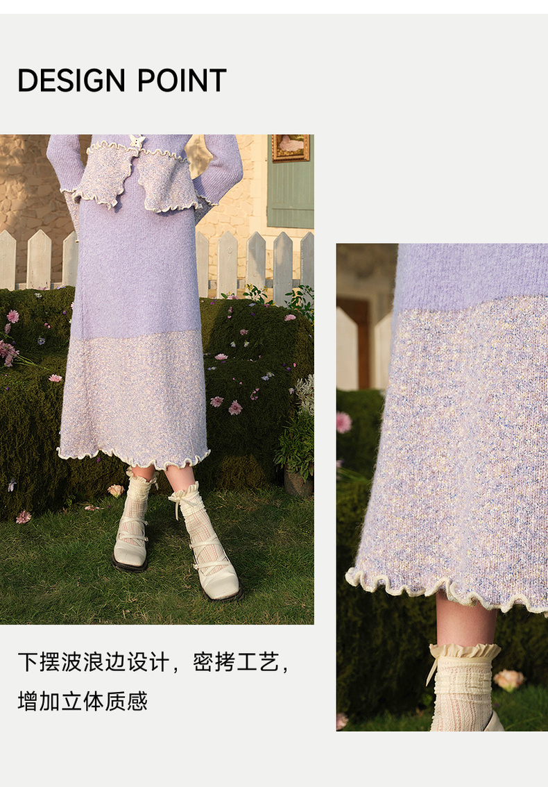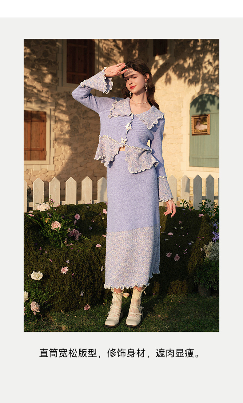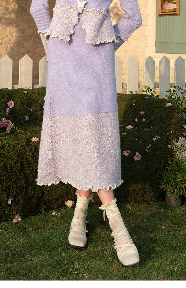 两三事薄雾藤萝2024冬季新款小清新拼色木耳边毛织半身裙气质长裙