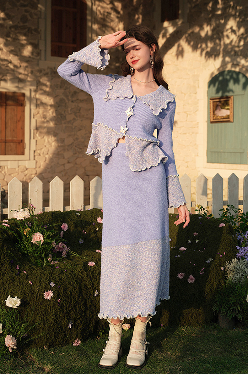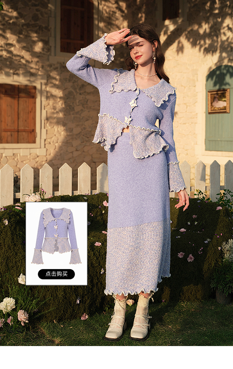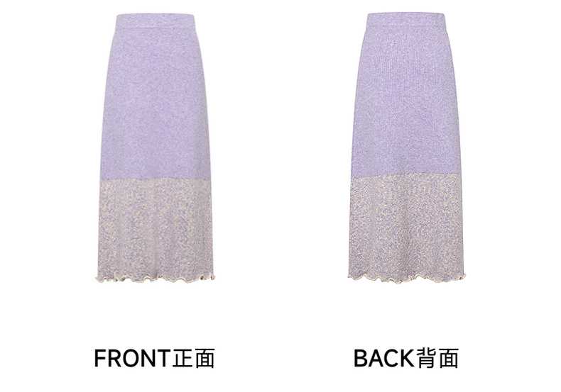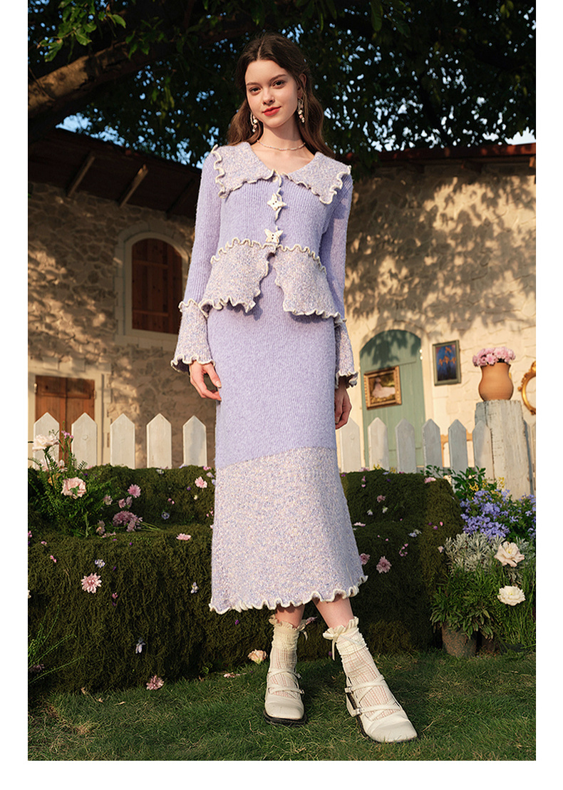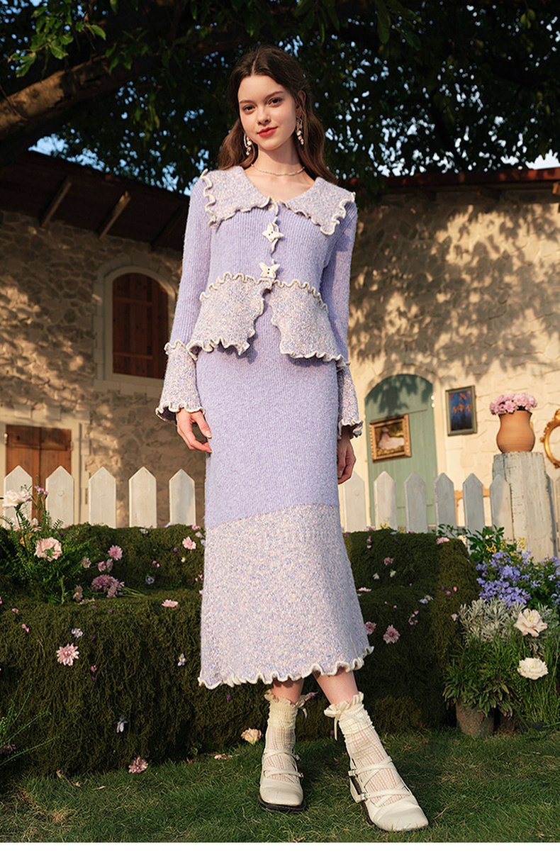 两三事薄雾藤萝2024冬季新款小清新拼色木耳边毛织半身裙气质长裙