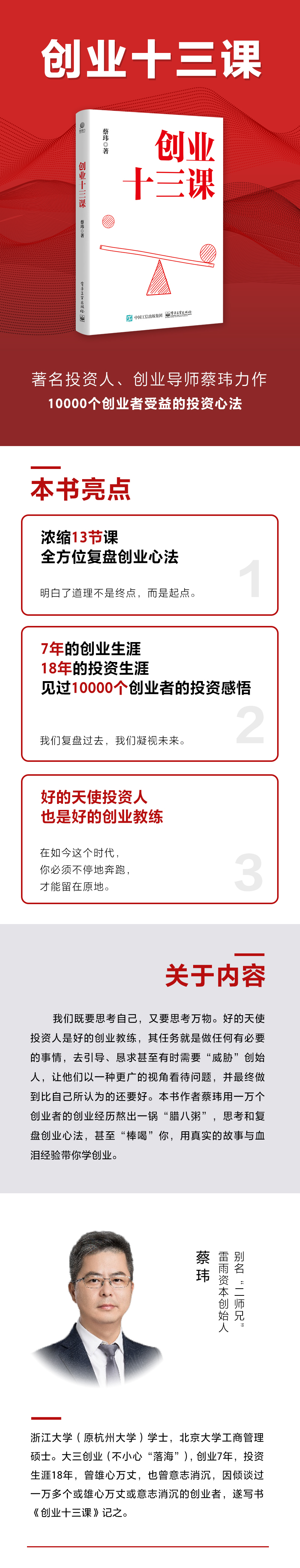 蔡玮别名“二师兄”,雷雨资本创始人。杭州大学本科,北京大学工商管理硕士。大三创业(不小心落海),创业7年,投资生涯18年,自己曾雄心万丈,也曾意志消沉,因倾谈过一万多个或雄心万丈或意志消沉的创业者,遂写书《创业十三课》记之。