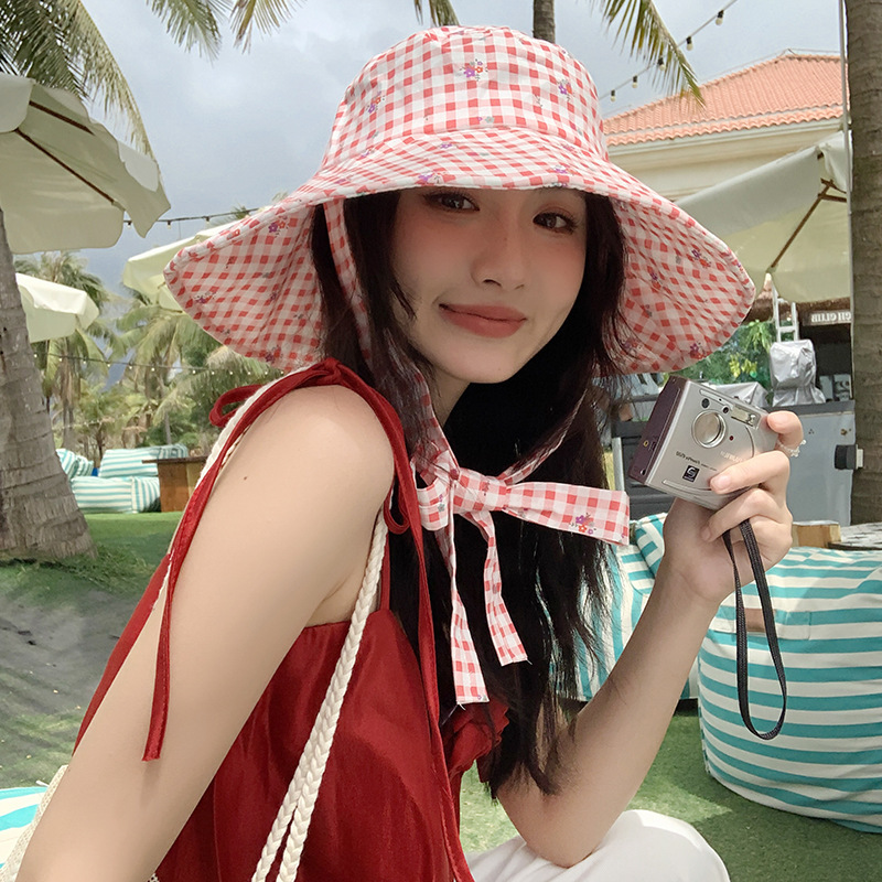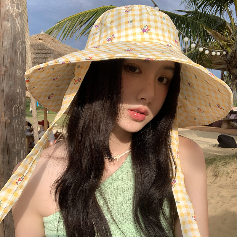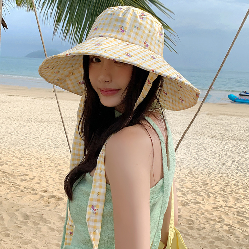 【新款韩版ins格纹系带渔夫帽】夏日户外出游大帽檐 双面防晒遮阳帽子