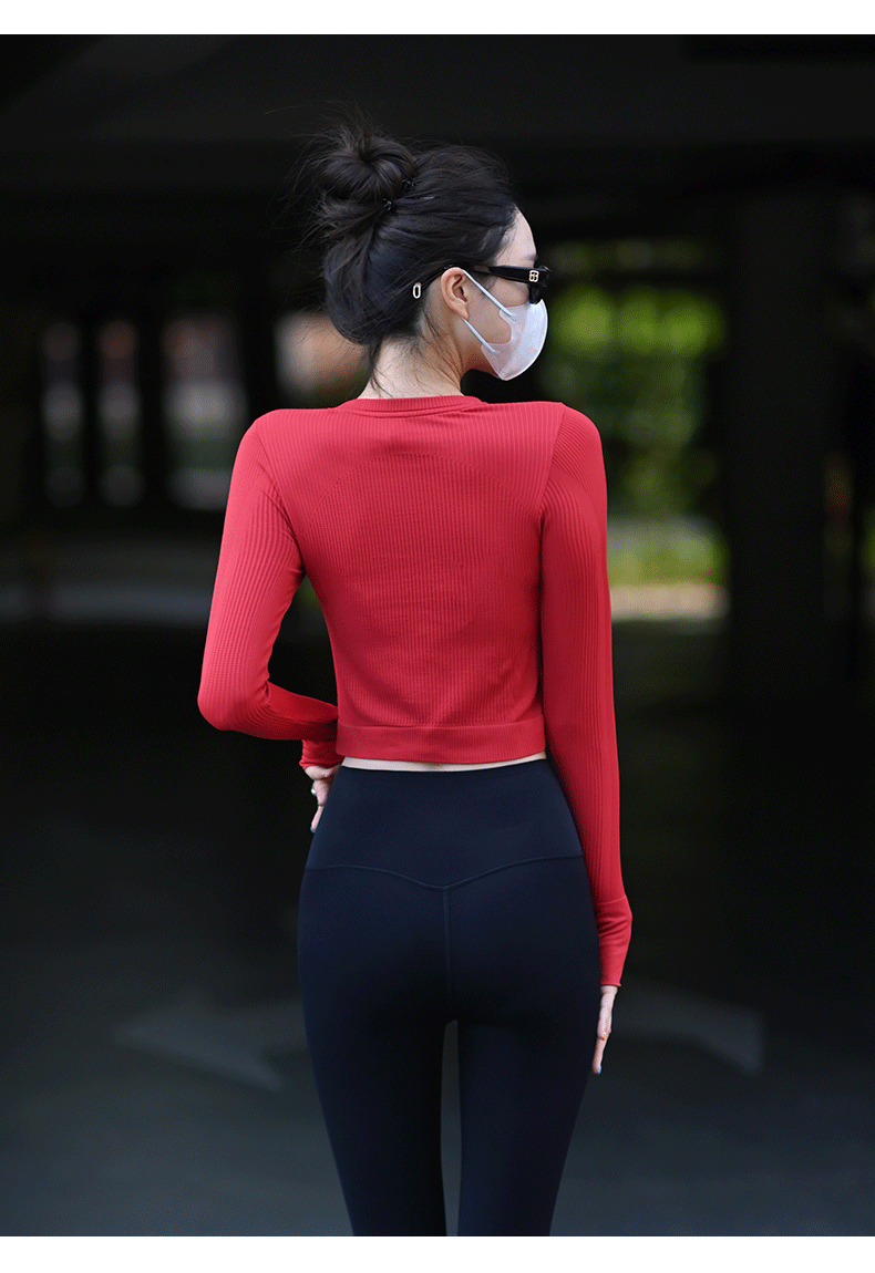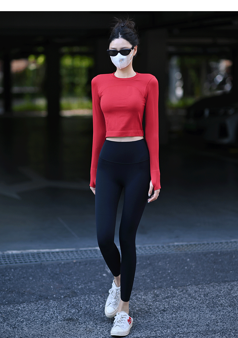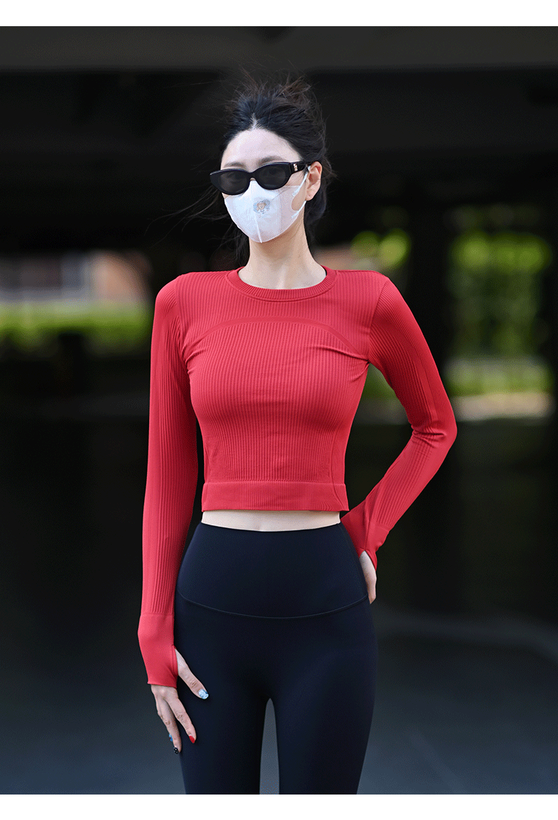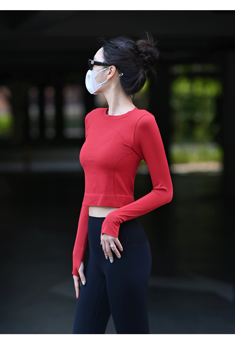 Beemen新款女式华夫格瑜伽上衣 长袖运动款修身紧身 速干透气健身服 户外室内瑜伽训练服