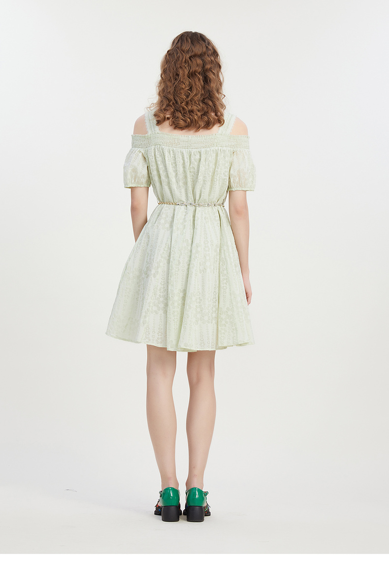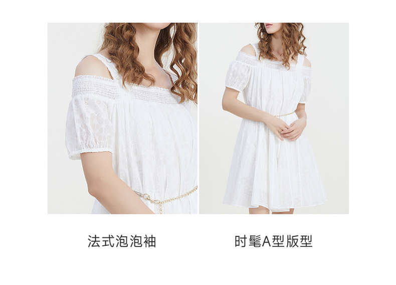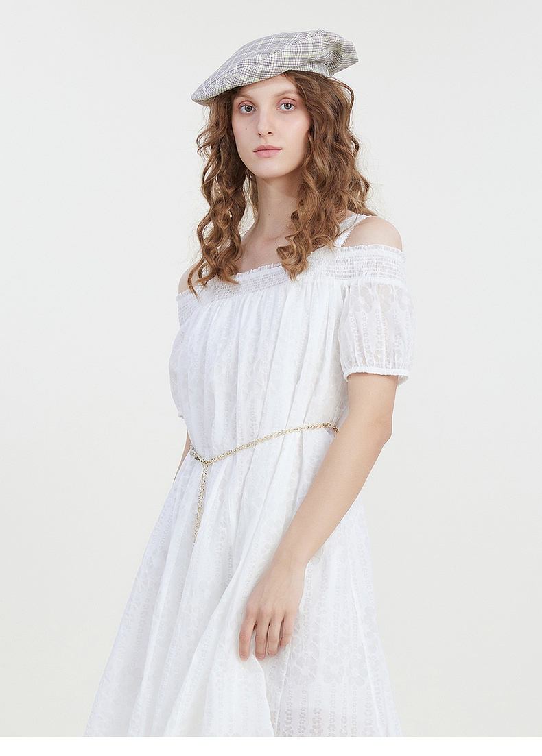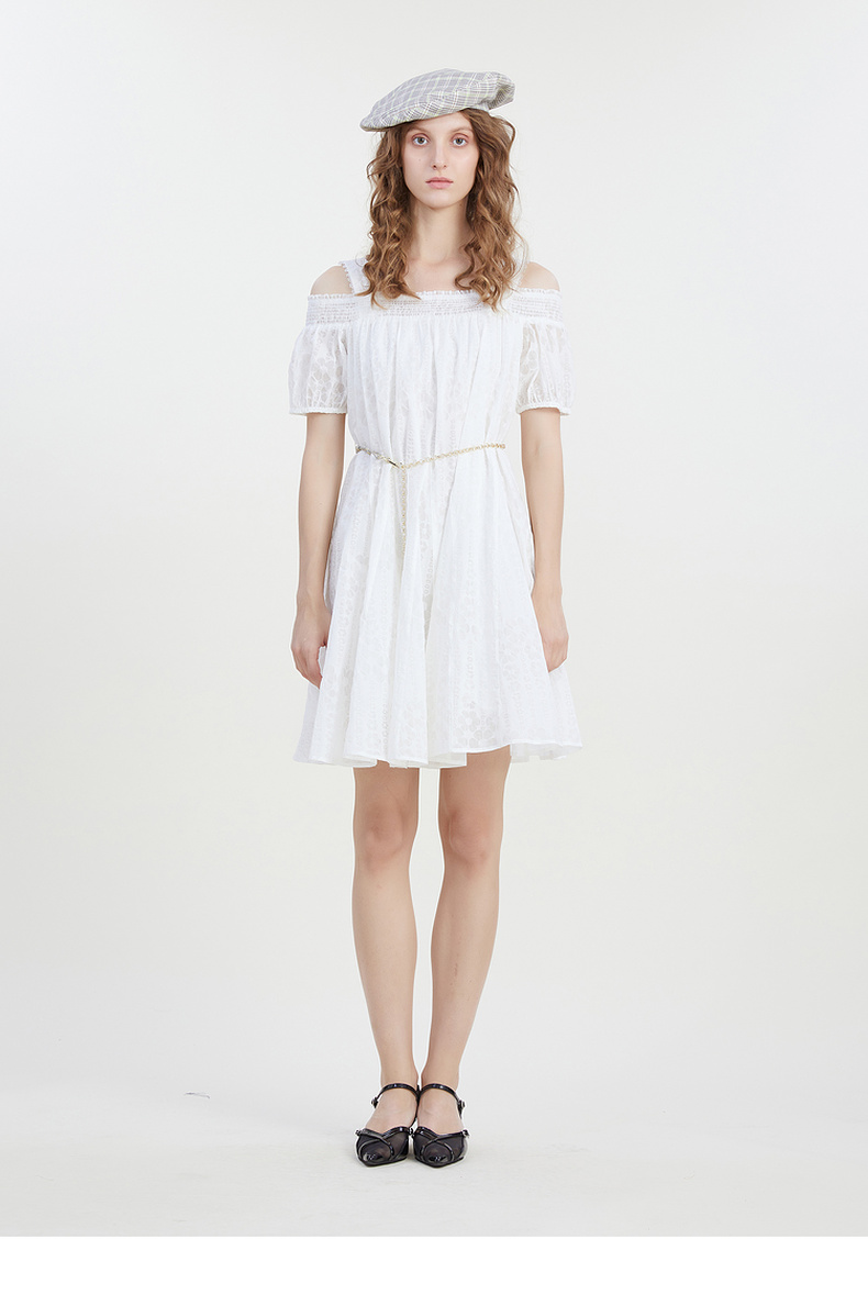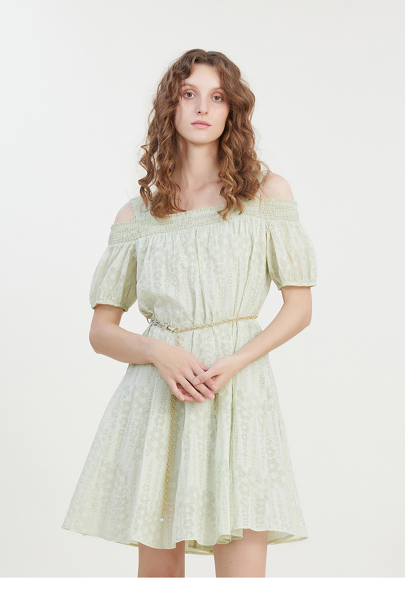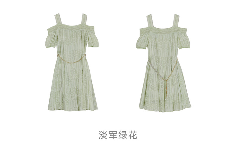 谜底吊带连衣裙短袖2023夏新款提花一字肩中长裙配腰带232ML0648