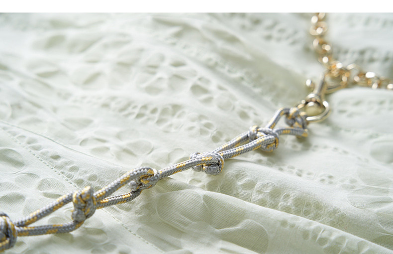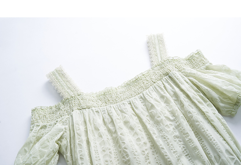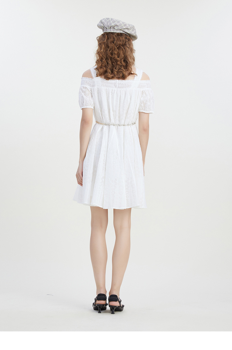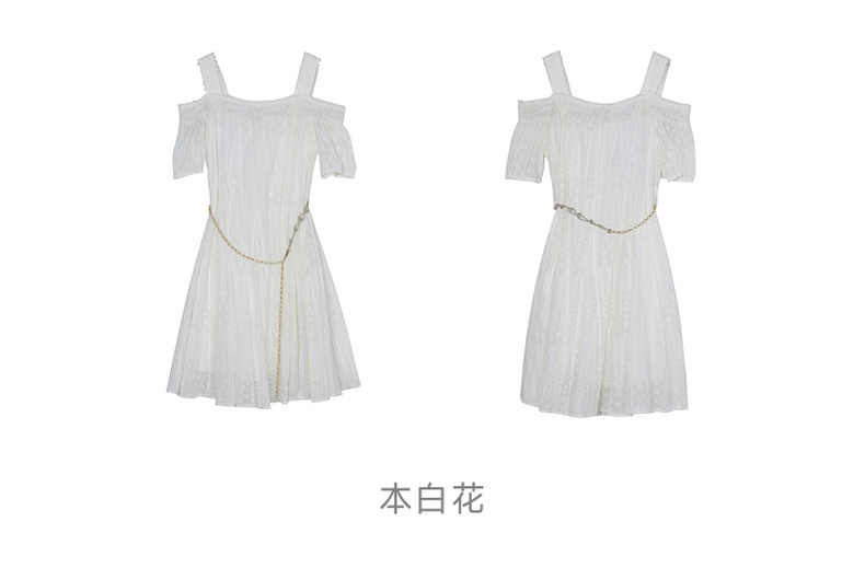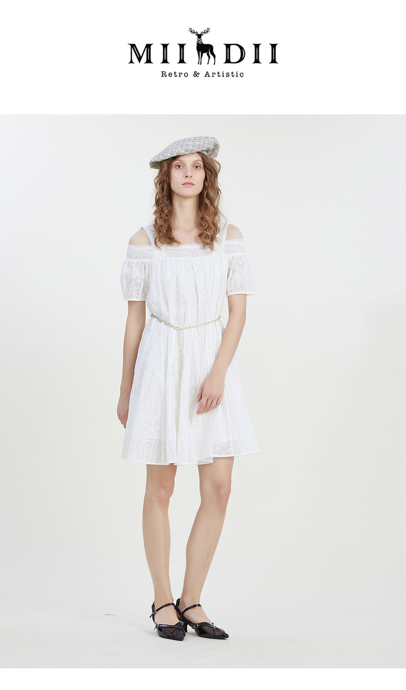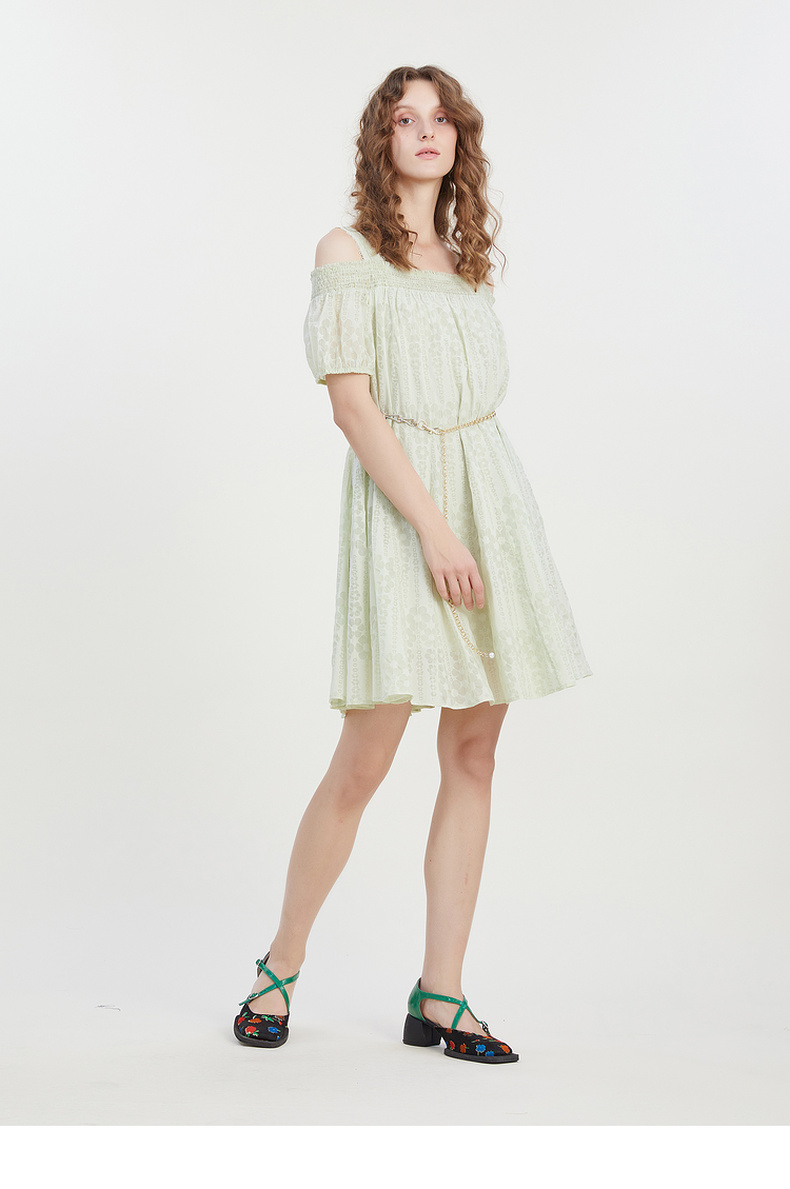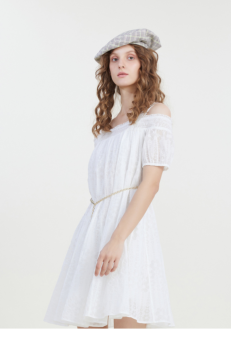 谜底吊带连衣裙短袖2023夏新款提花一字肩中长裙配腰带232ML0648