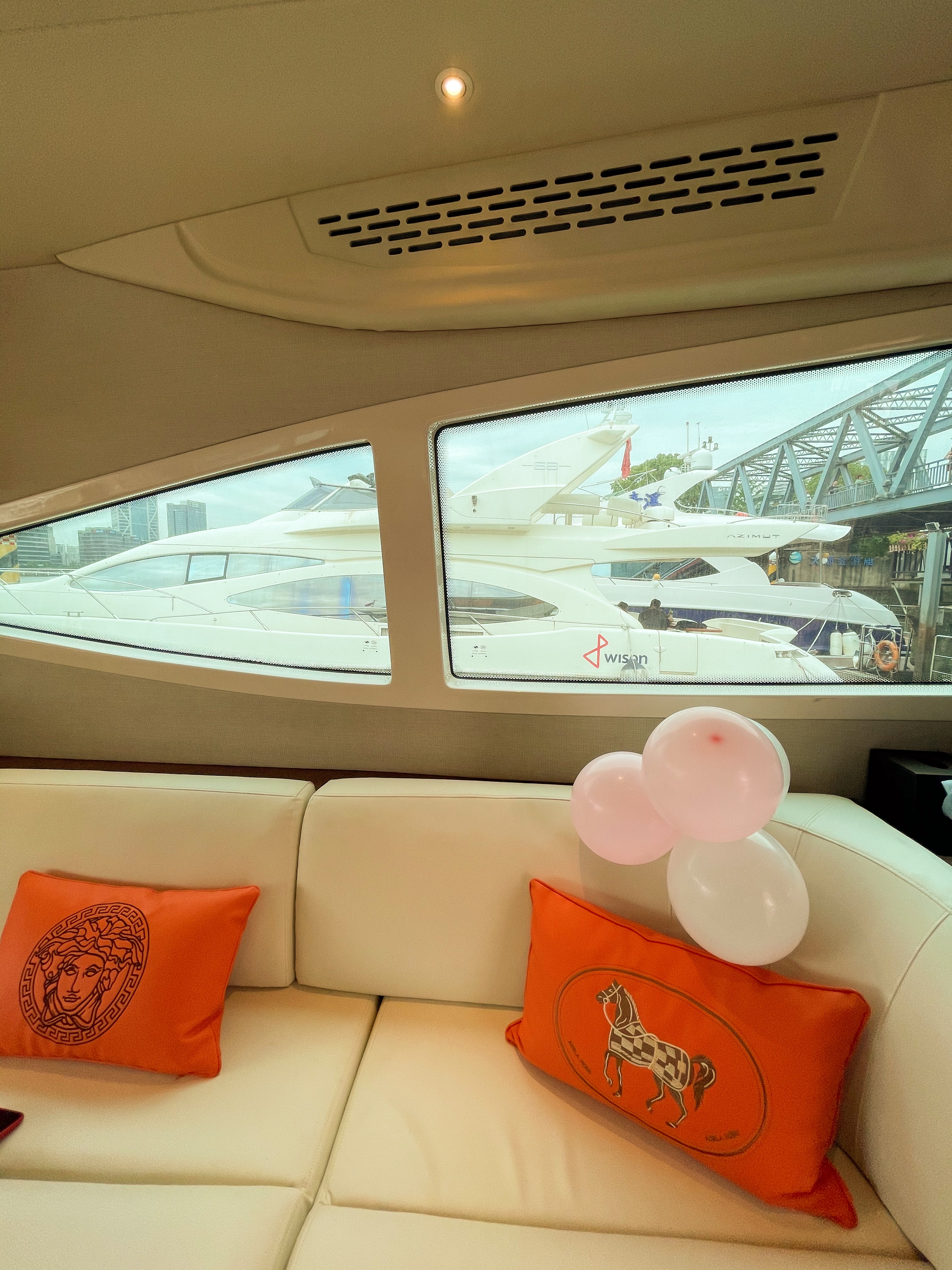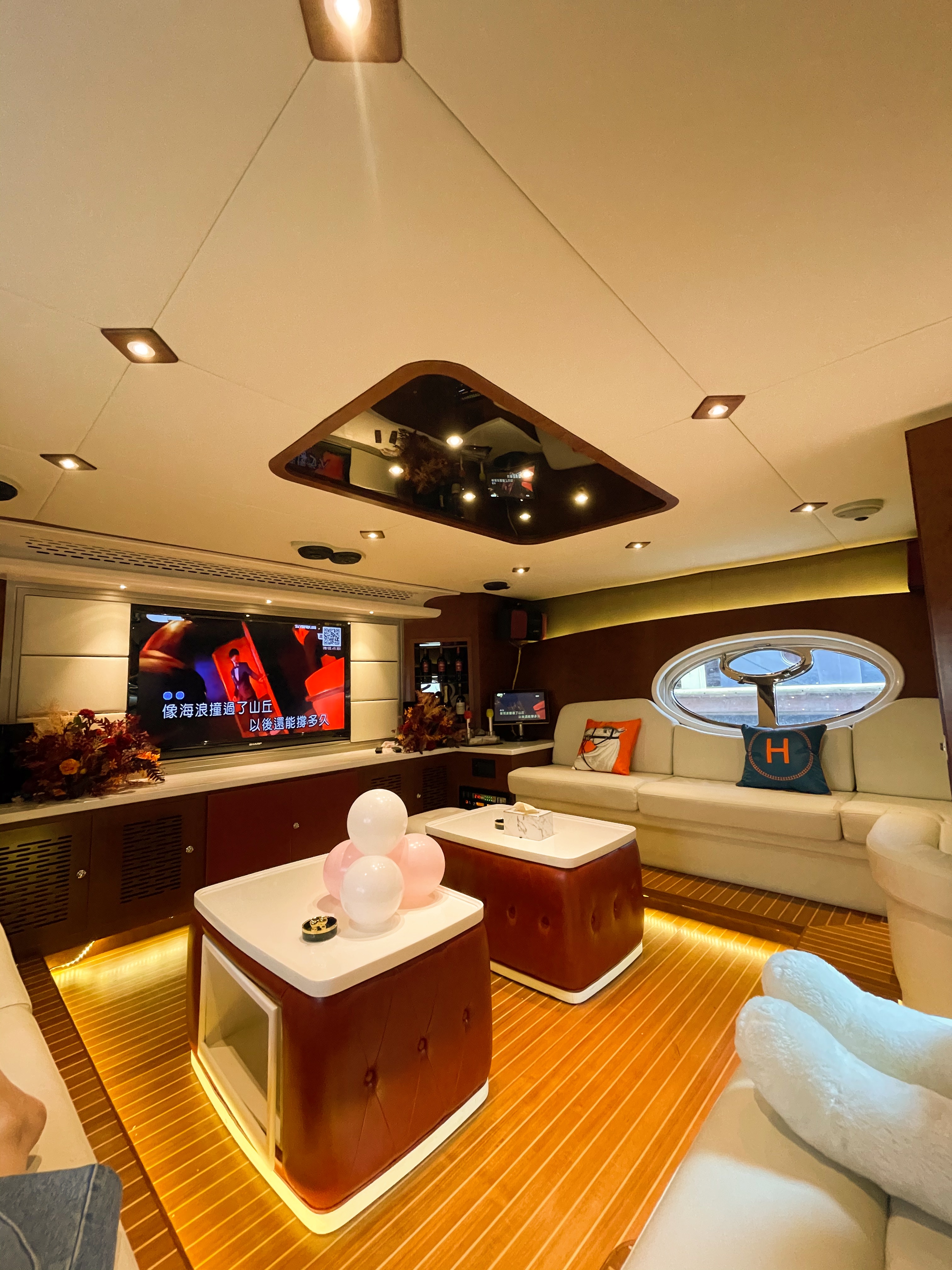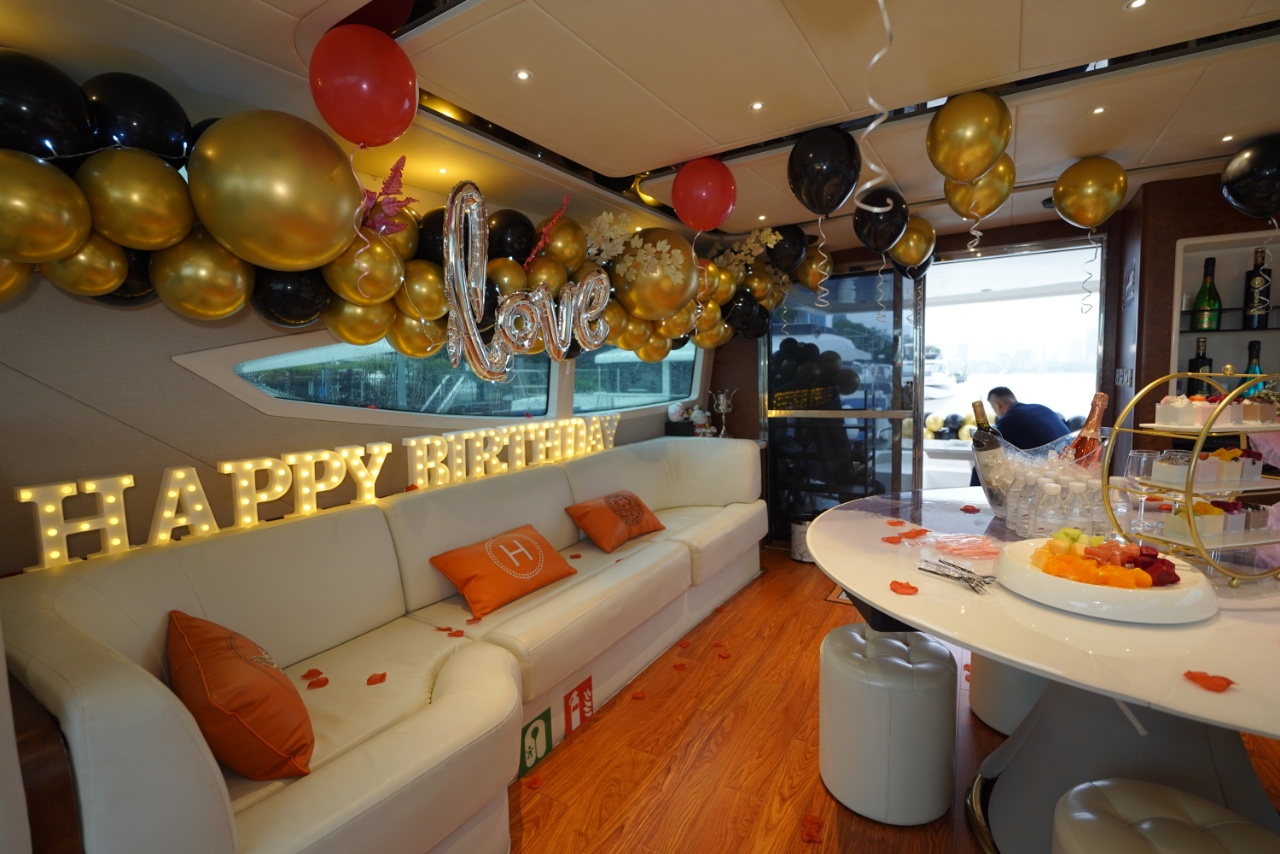 游艇基础设施:上下三层、船上配置客厅、卧室、沙发、洗手间、厨房、KTV、360度露天观景平台。