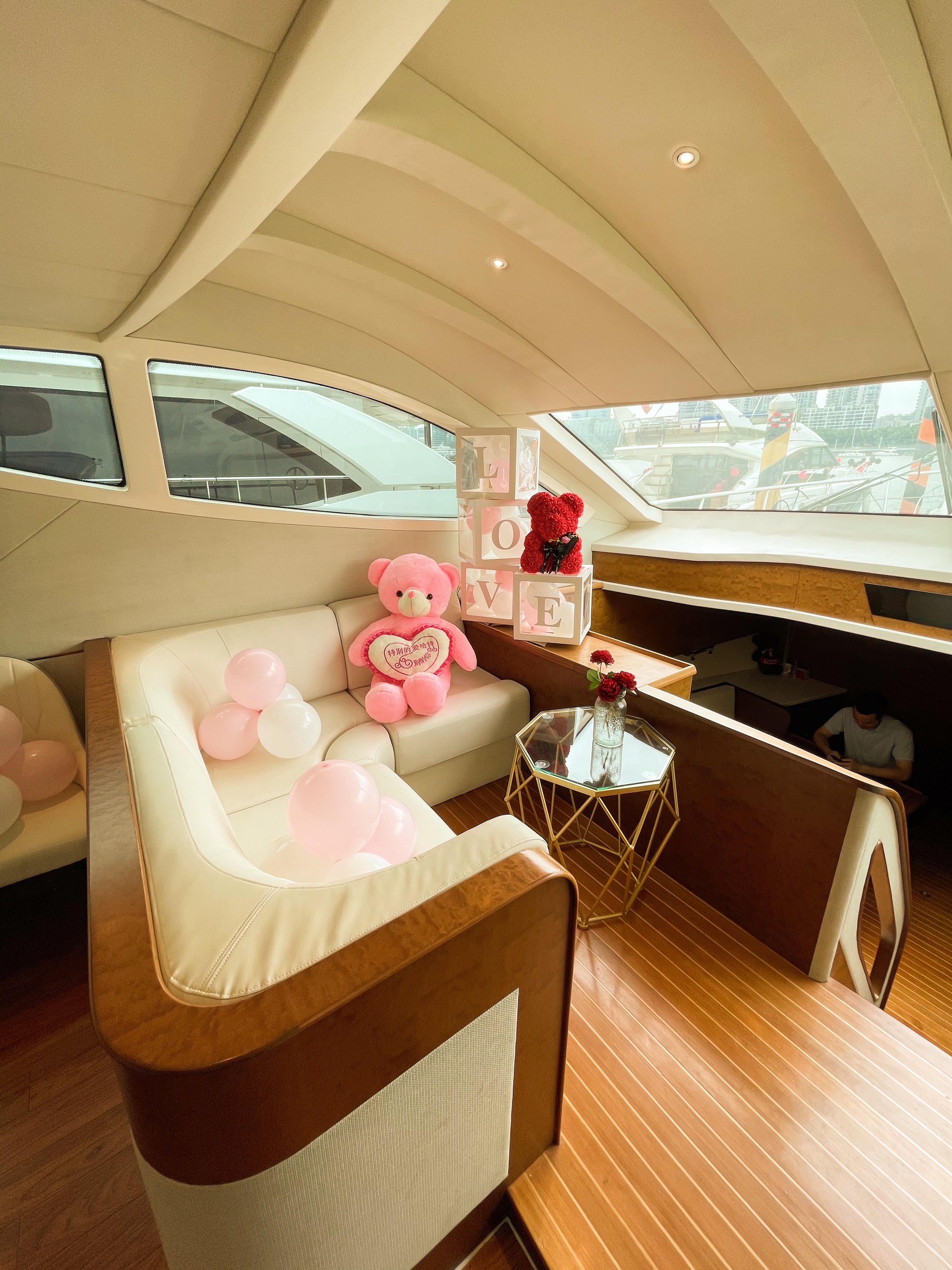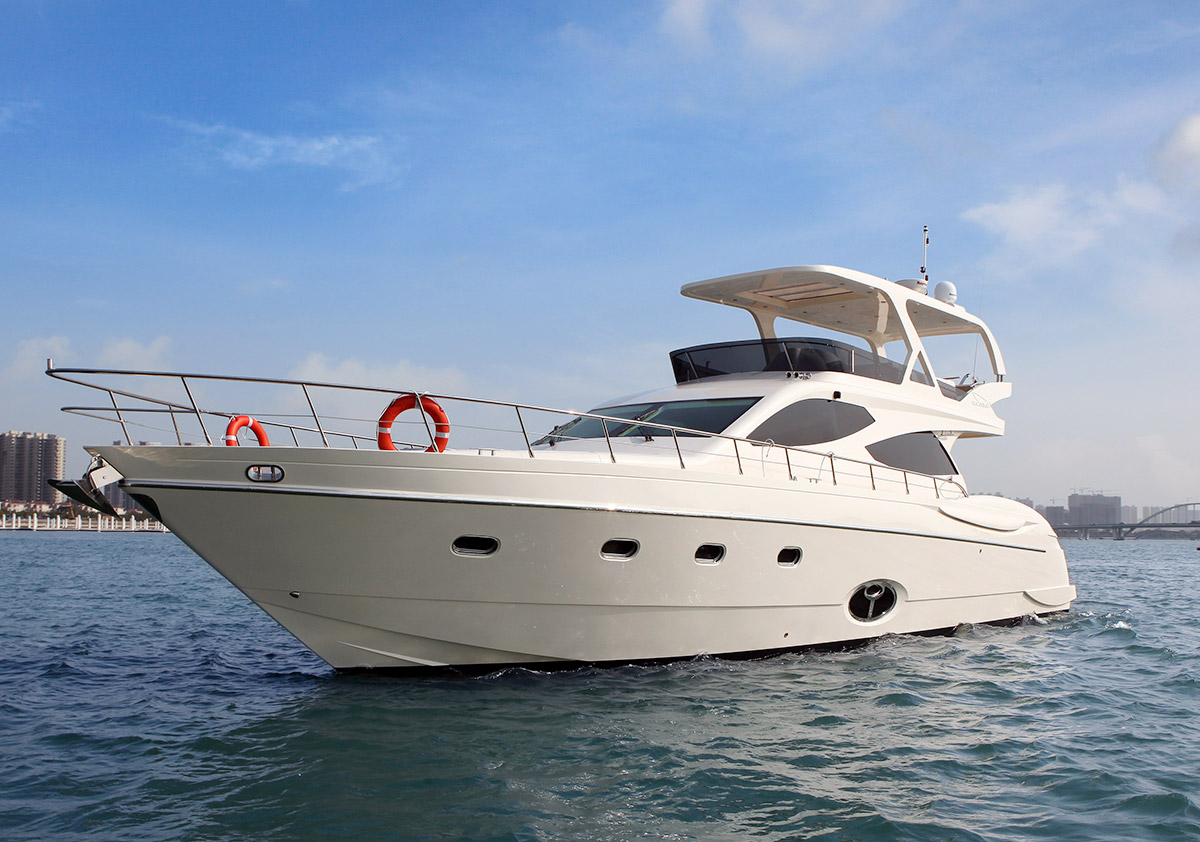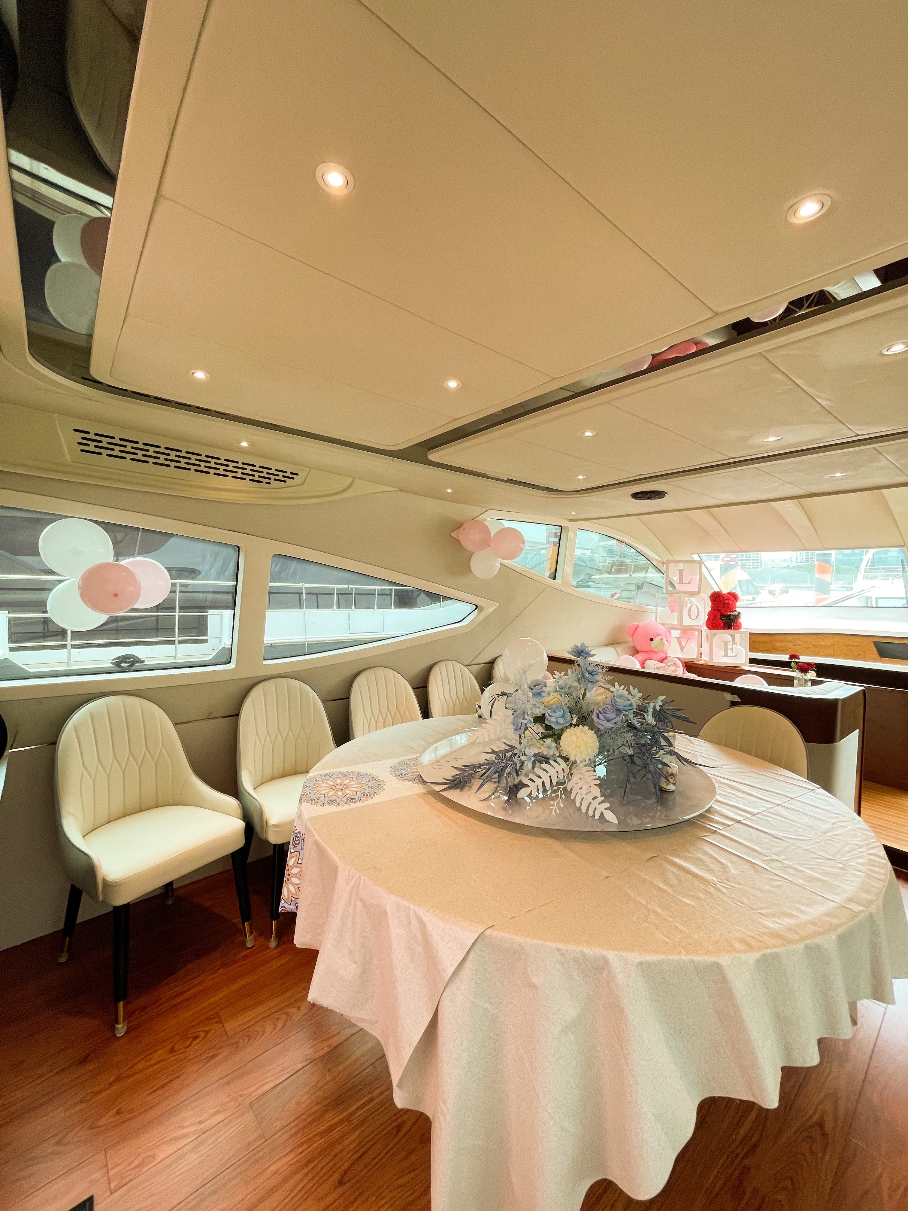 游艇基础设施:上下三层、船上配置客厅、卧室、沙发、洗手间、厨房、KTV、360度露天观景平台。