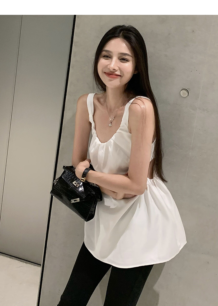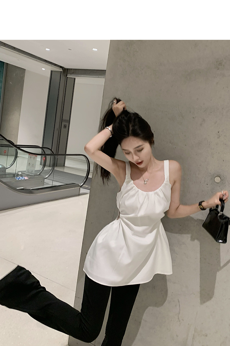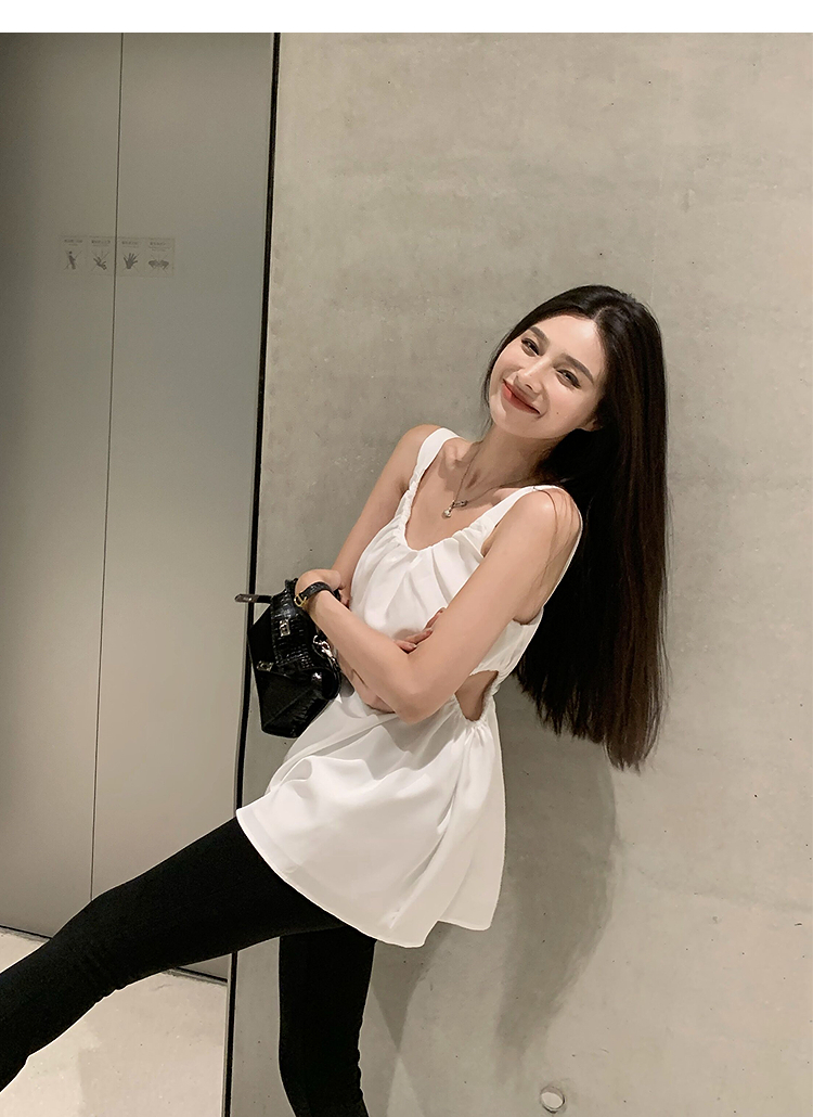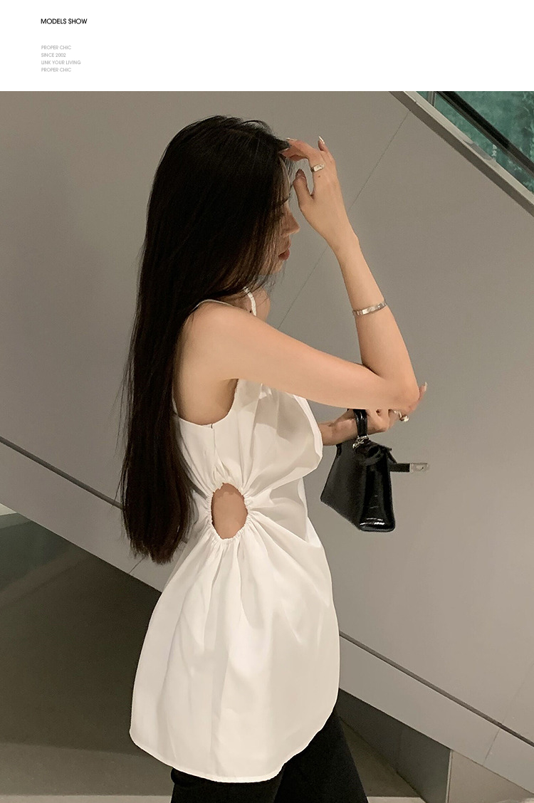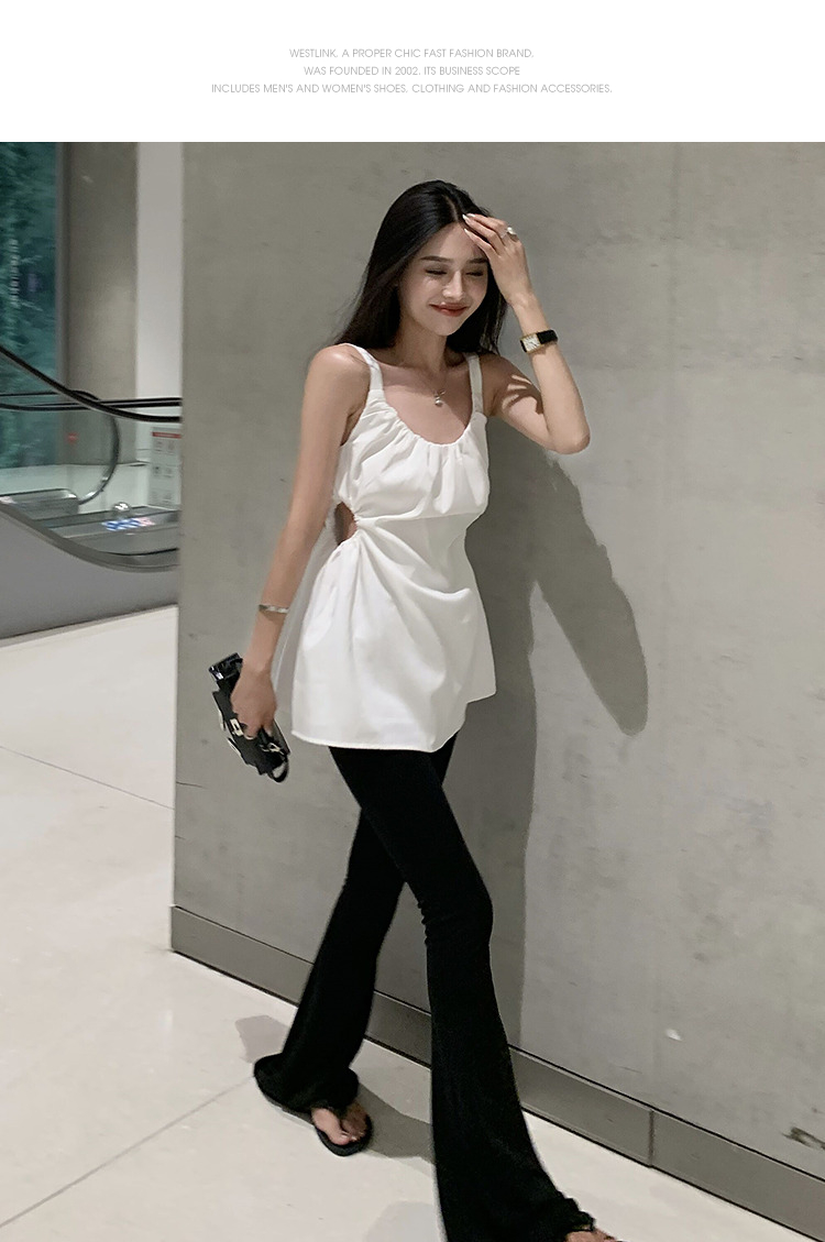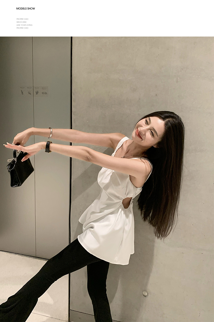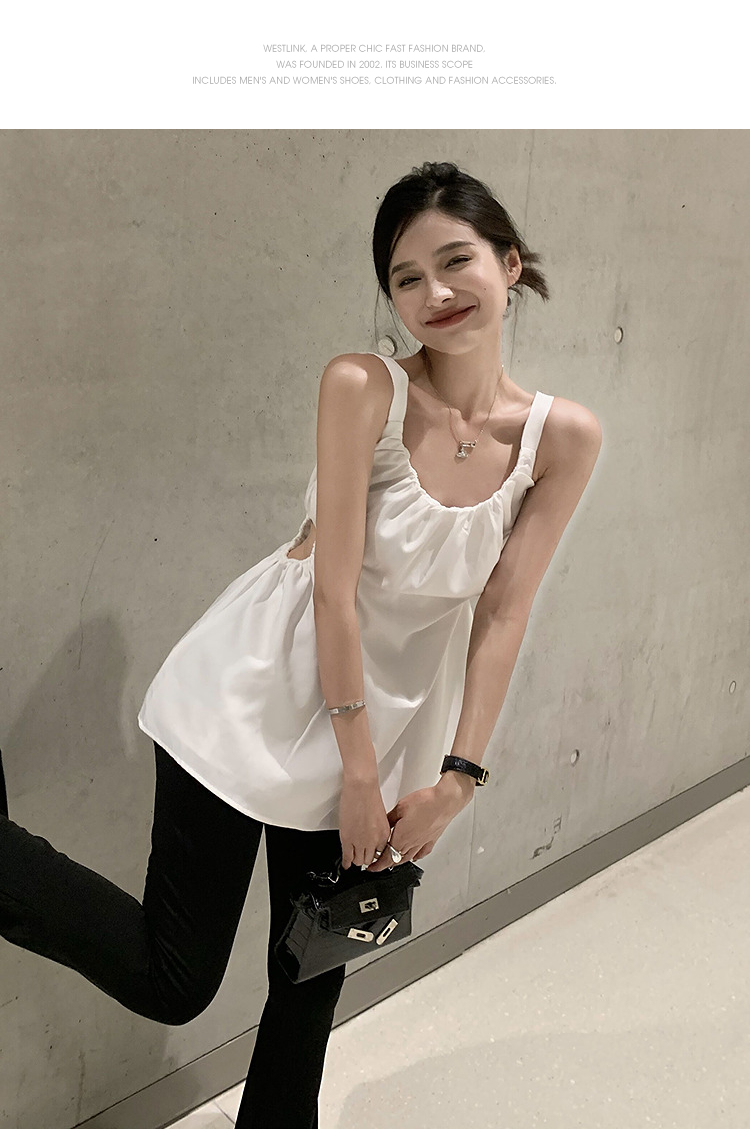 西遇方领衬衣女春夏新款白色纯欲露肩镂空收腰设计无袖上衣SS150311