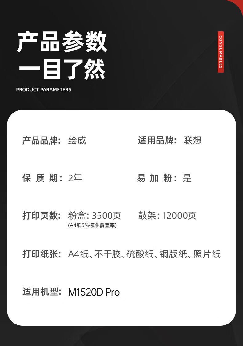 绘威适用联想(Lenovo)M1520D Pro粉盒M1520D打印机专用墨盒硒鼓 墨粉盒