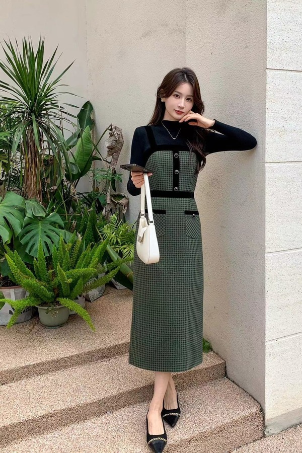 Le Malene 黑色吊带千鸟格连衣裙套装 19301