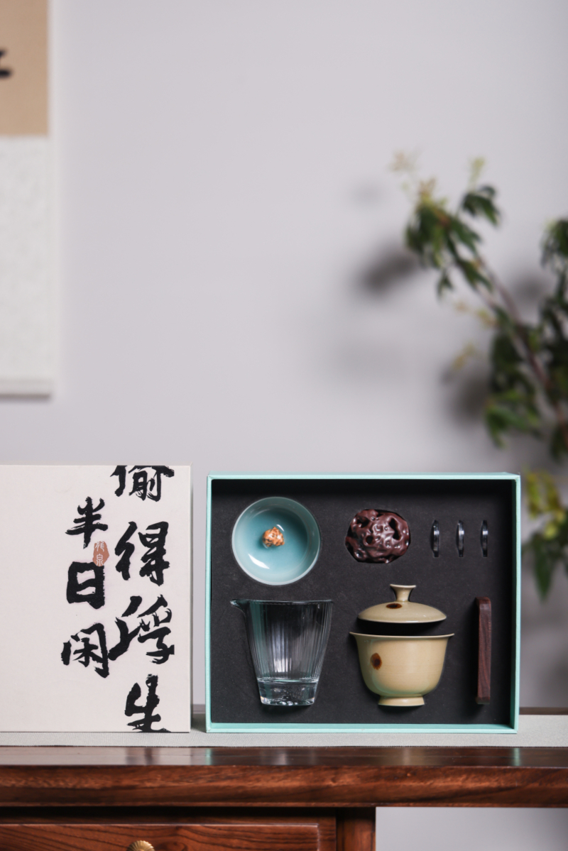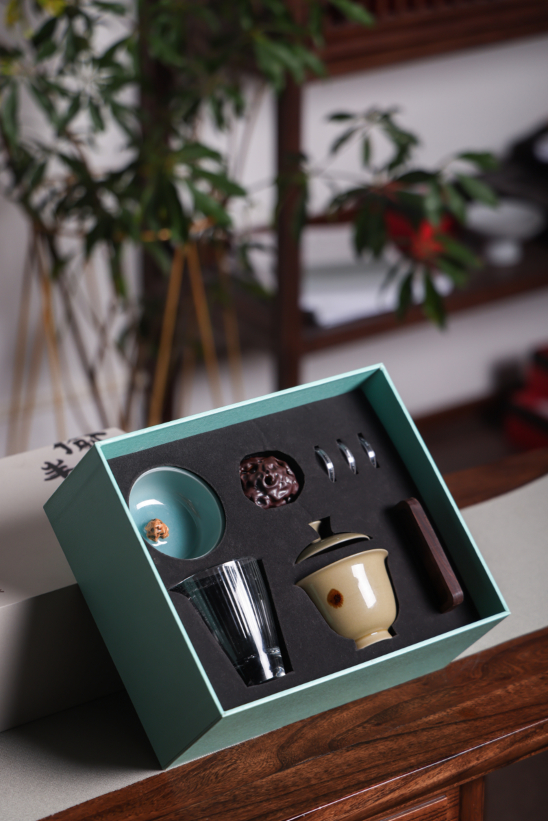 两才盖碗*1,公道杯*1,主人杯*1,香薰炉*1,香片*3,礼盒