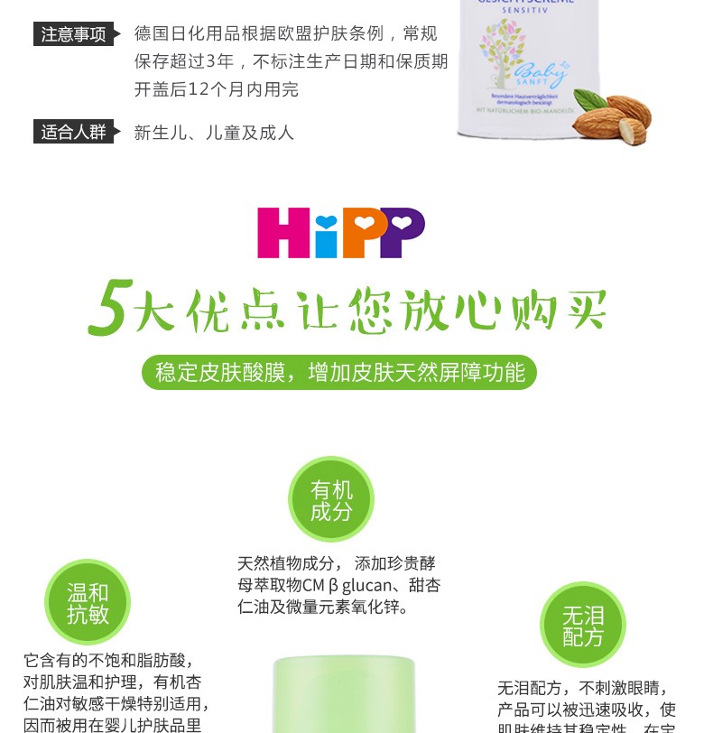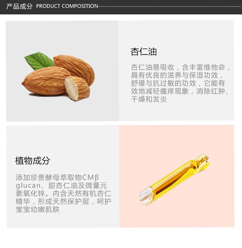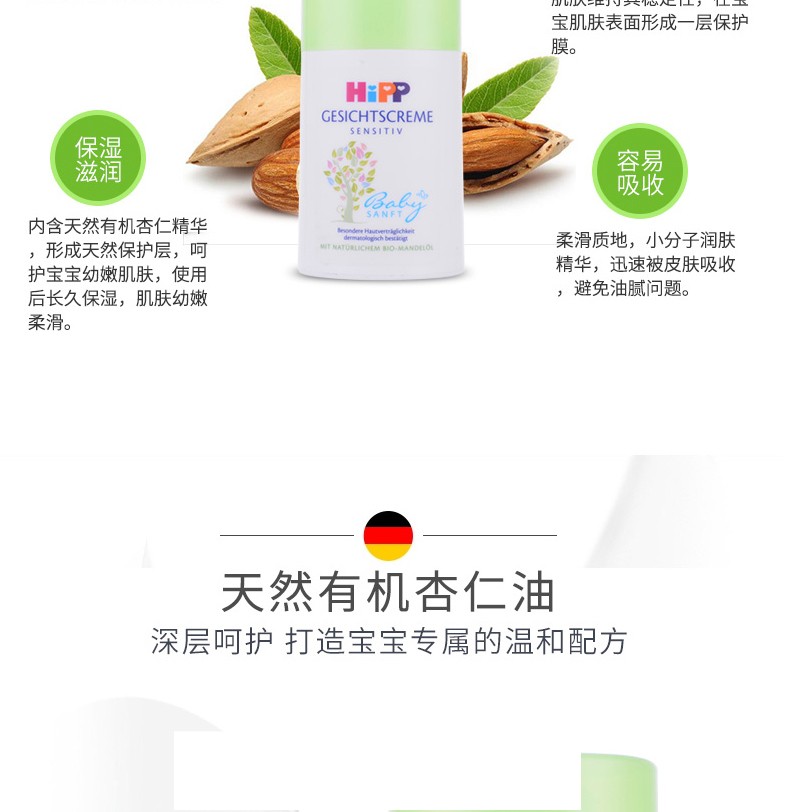 (新老版本随机发货)给予宝宝幼嫩肌肤自然保护和滋润。 产品富含有机杏仁油能舒缓干燥肌肤,本产品不含石蜡油,