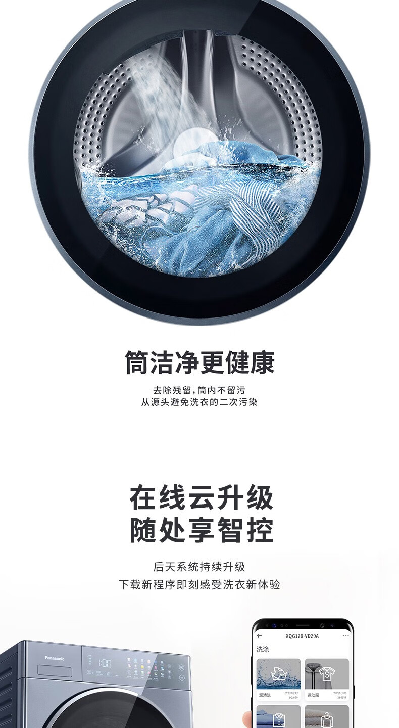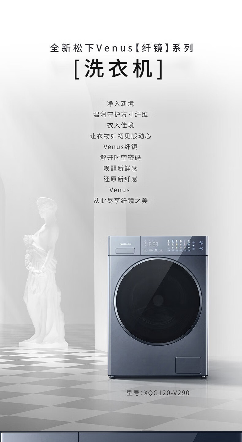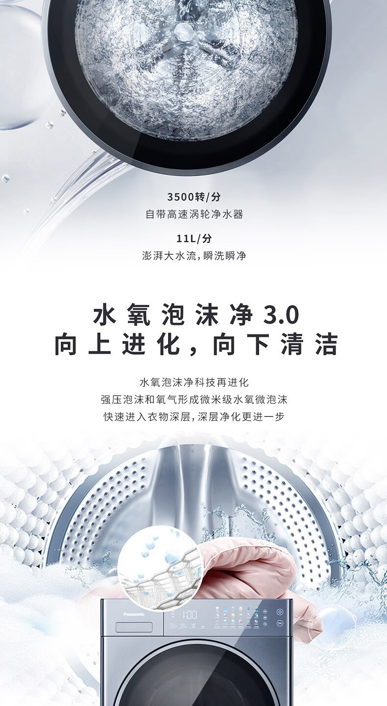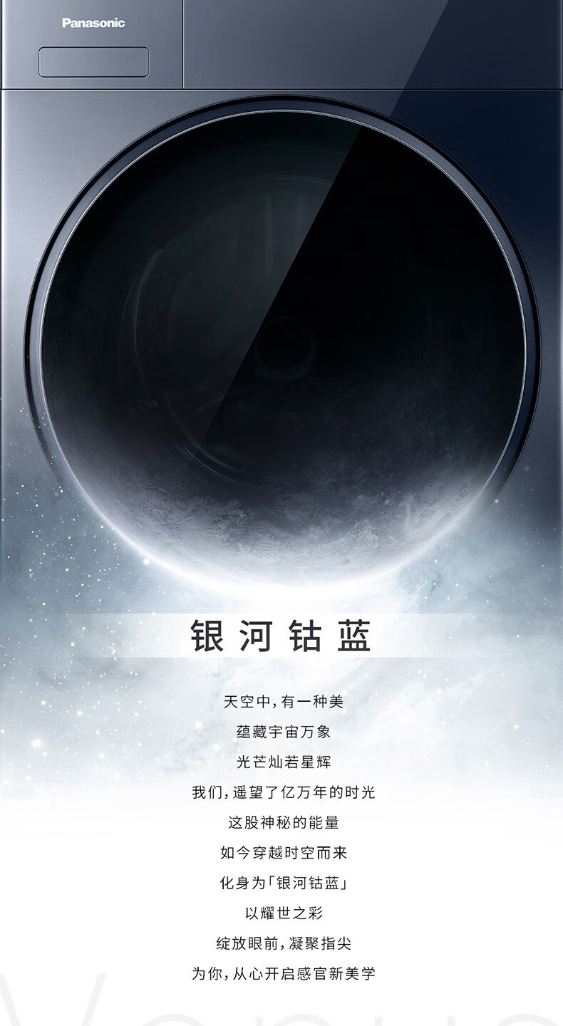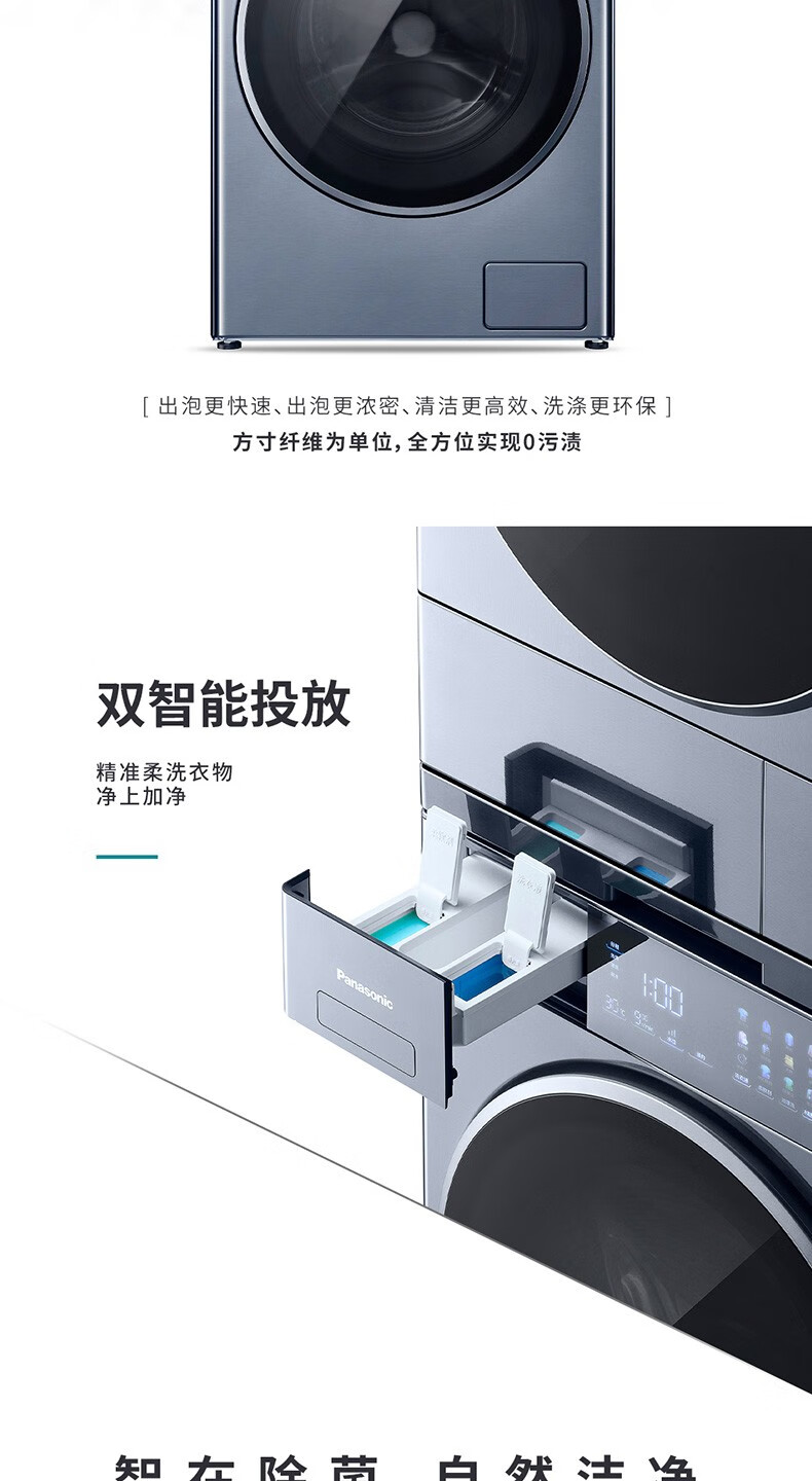 松下(Panasonic)纤镜12kg大容量净水洗智能投放水氧泡沫净光动银除菌触控镜面彩屏全自动变频滚筒洗衣机 银河钴蓝 XQG120-V290