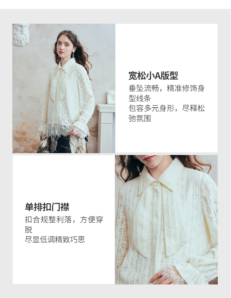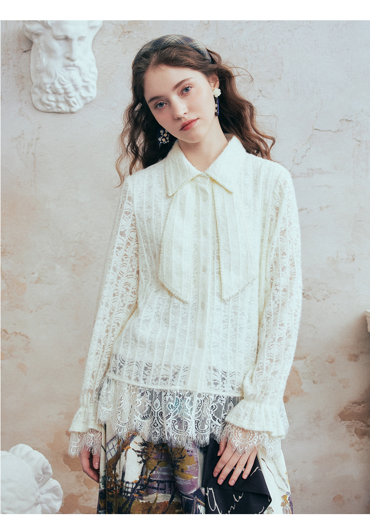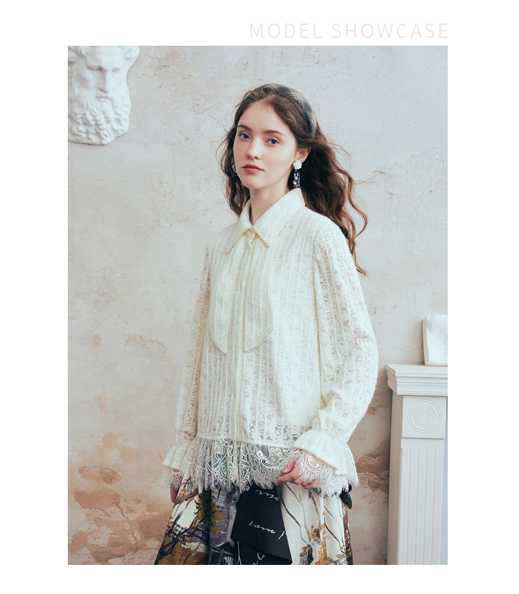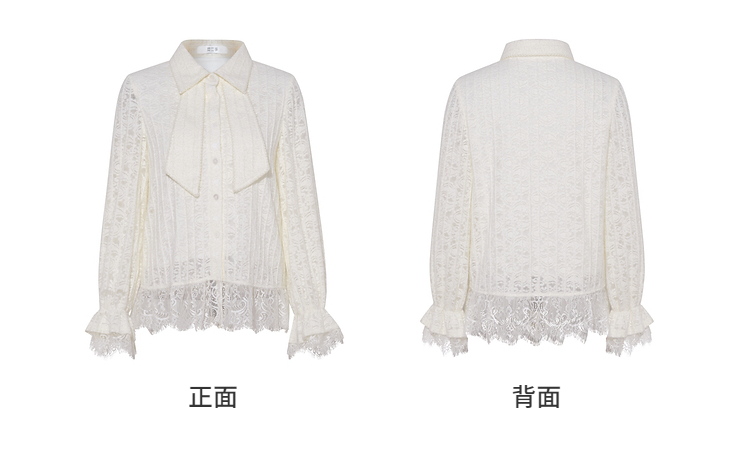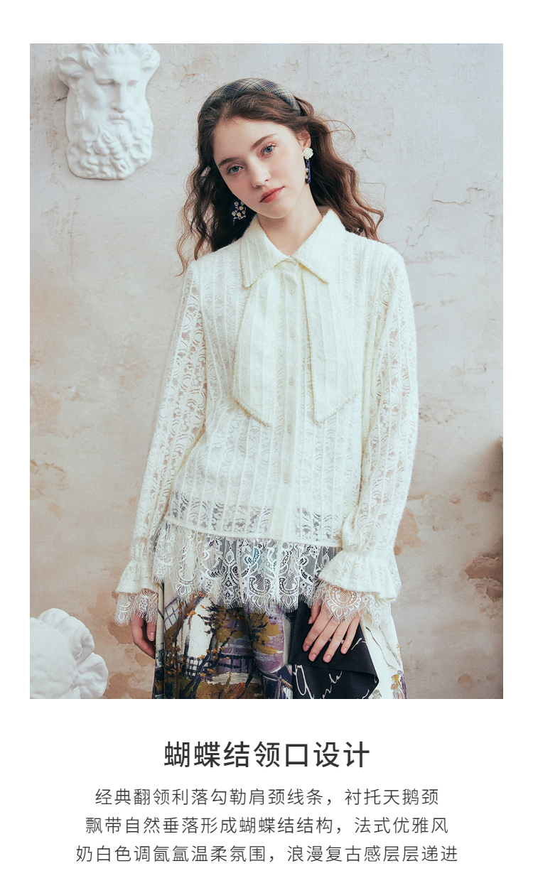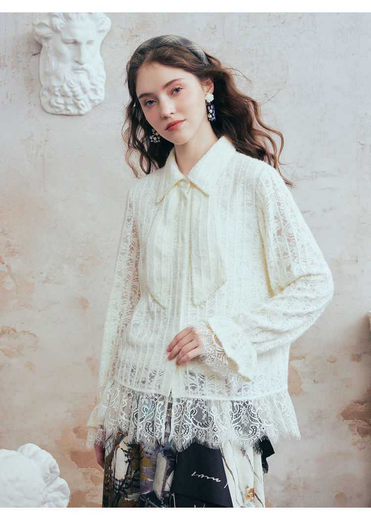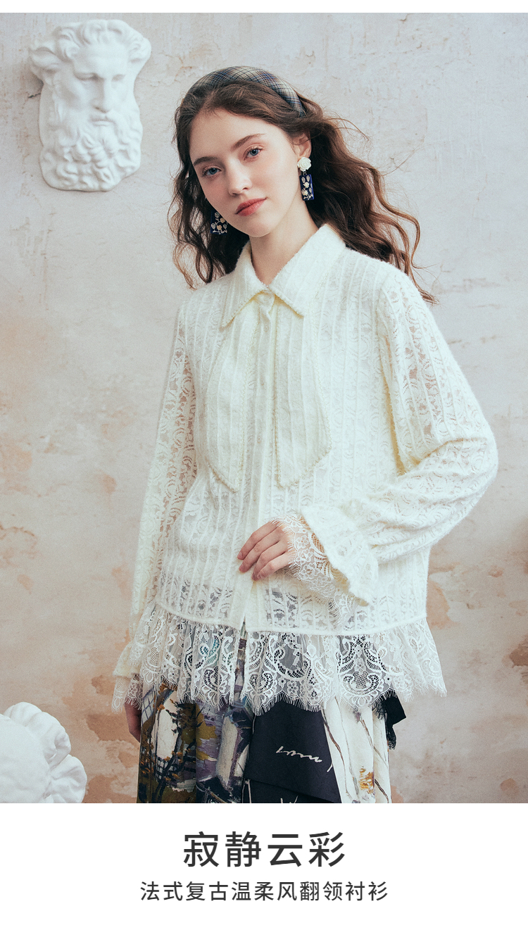 两三事 寂静云彩 2026春季新款复古蝴蝶结翻领镂空蕾丝长袖衬衫女