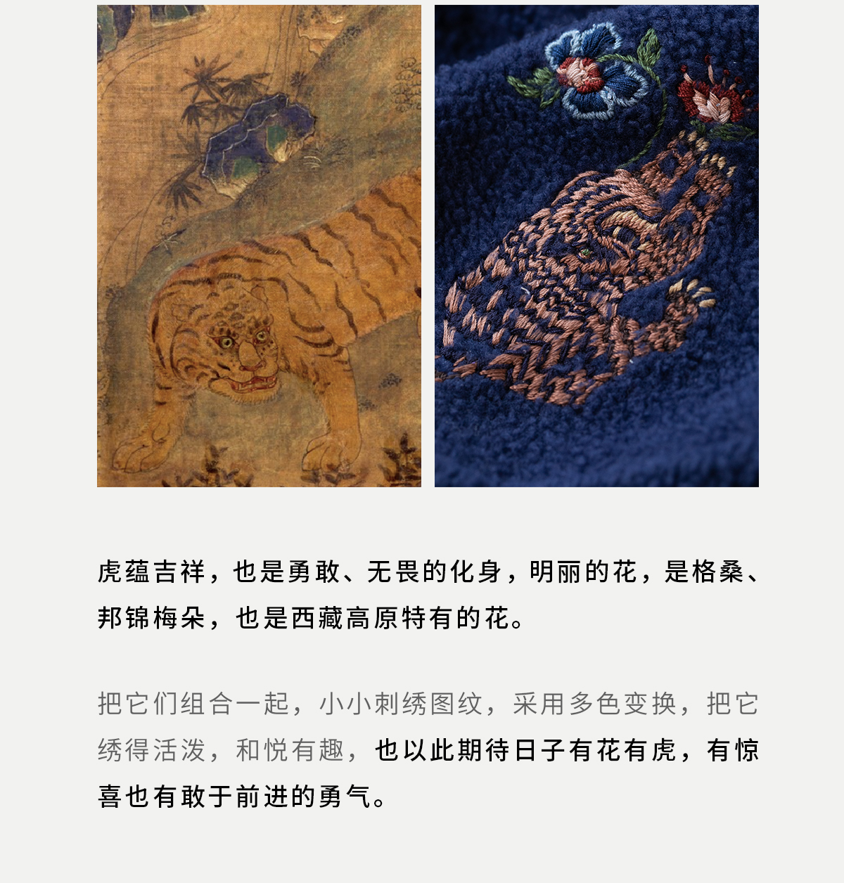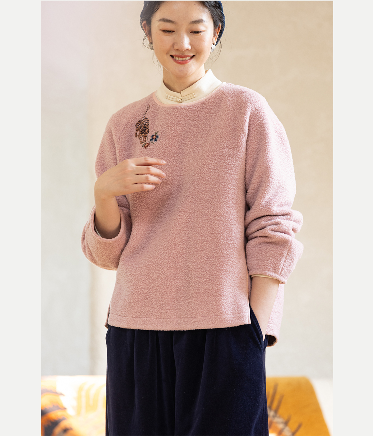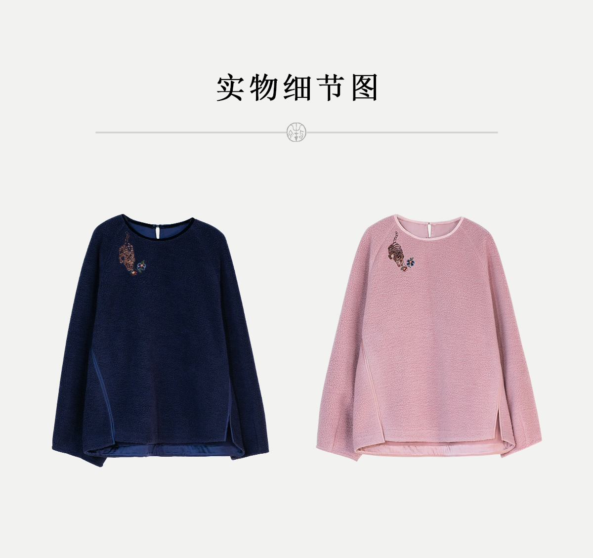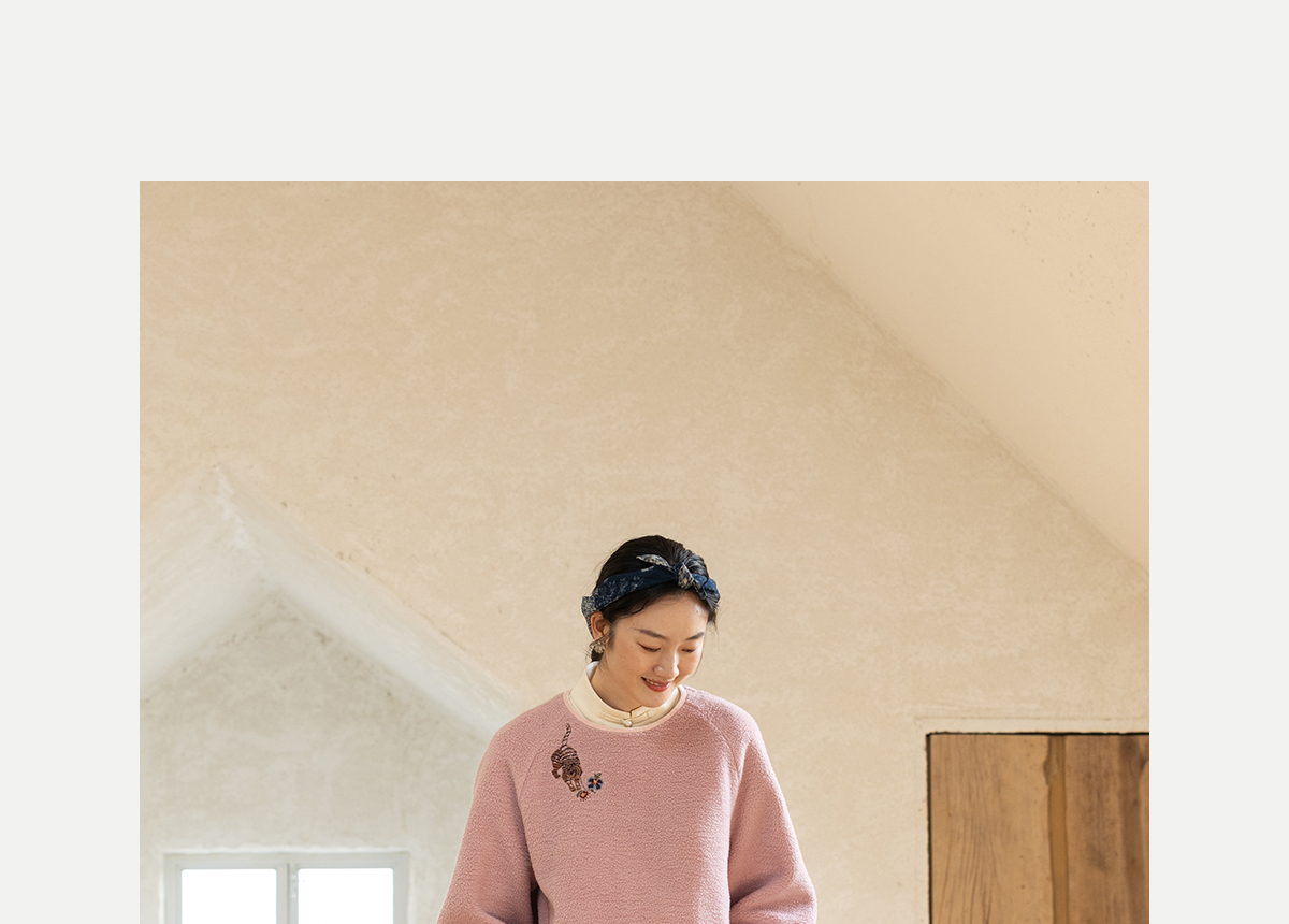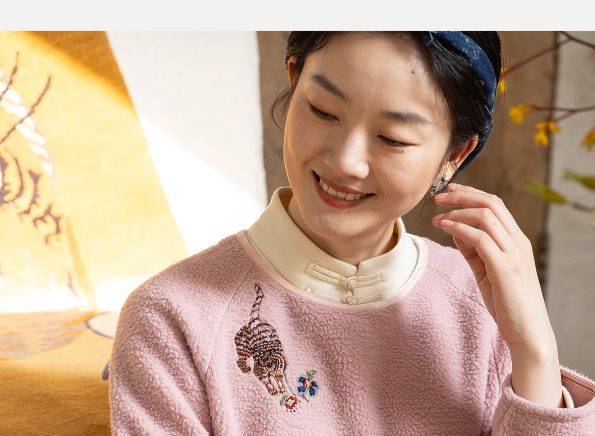 牧衣游原创 老虎与花手工刺绣卫衣冬舒适圆领宽松保暖上衣 松木白