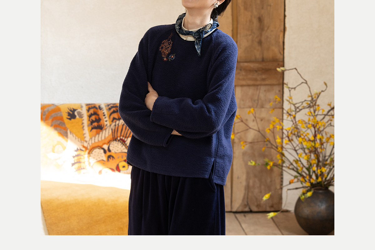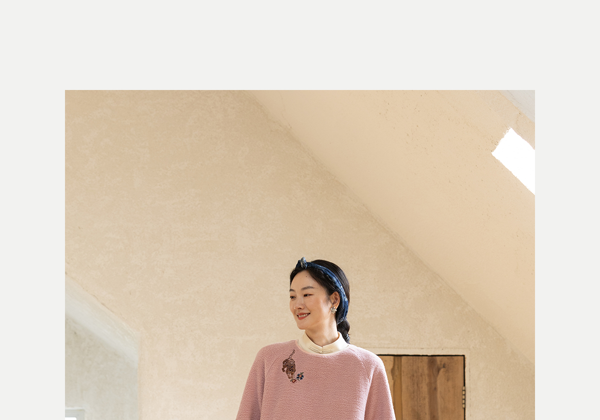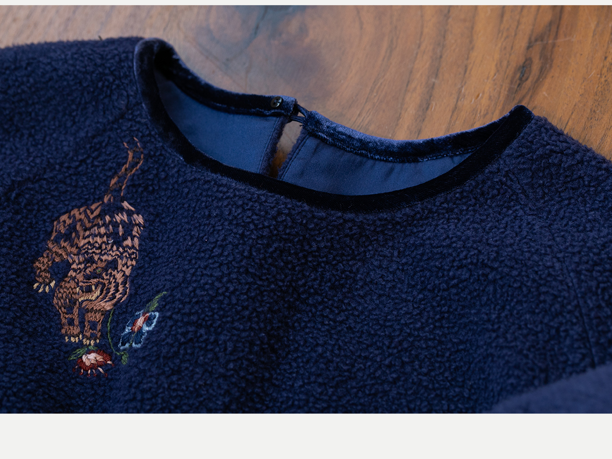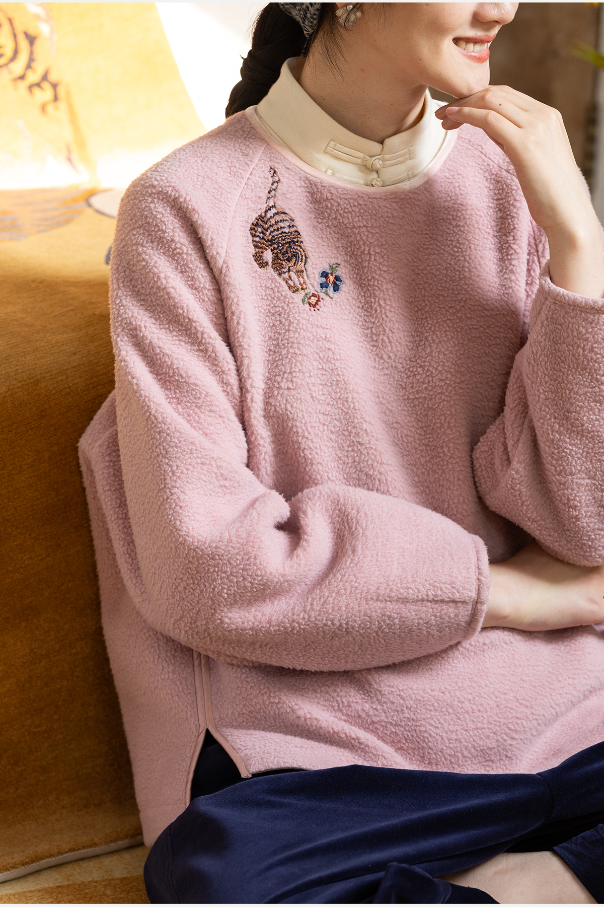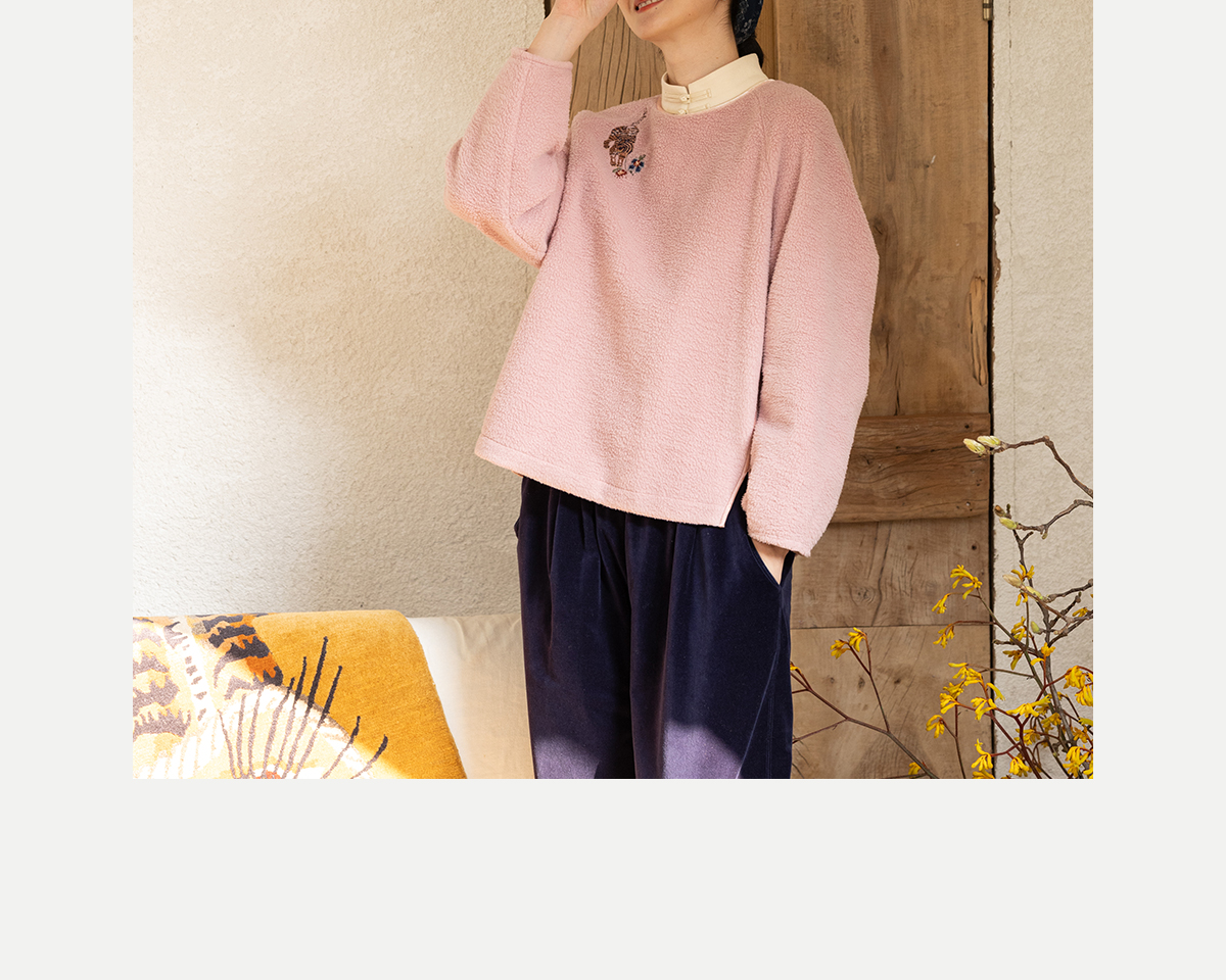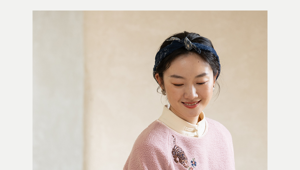 牧衣游原创 老虎与花手工刺绣卫衣冬舒适圆领宽松保暖上衣 松木白