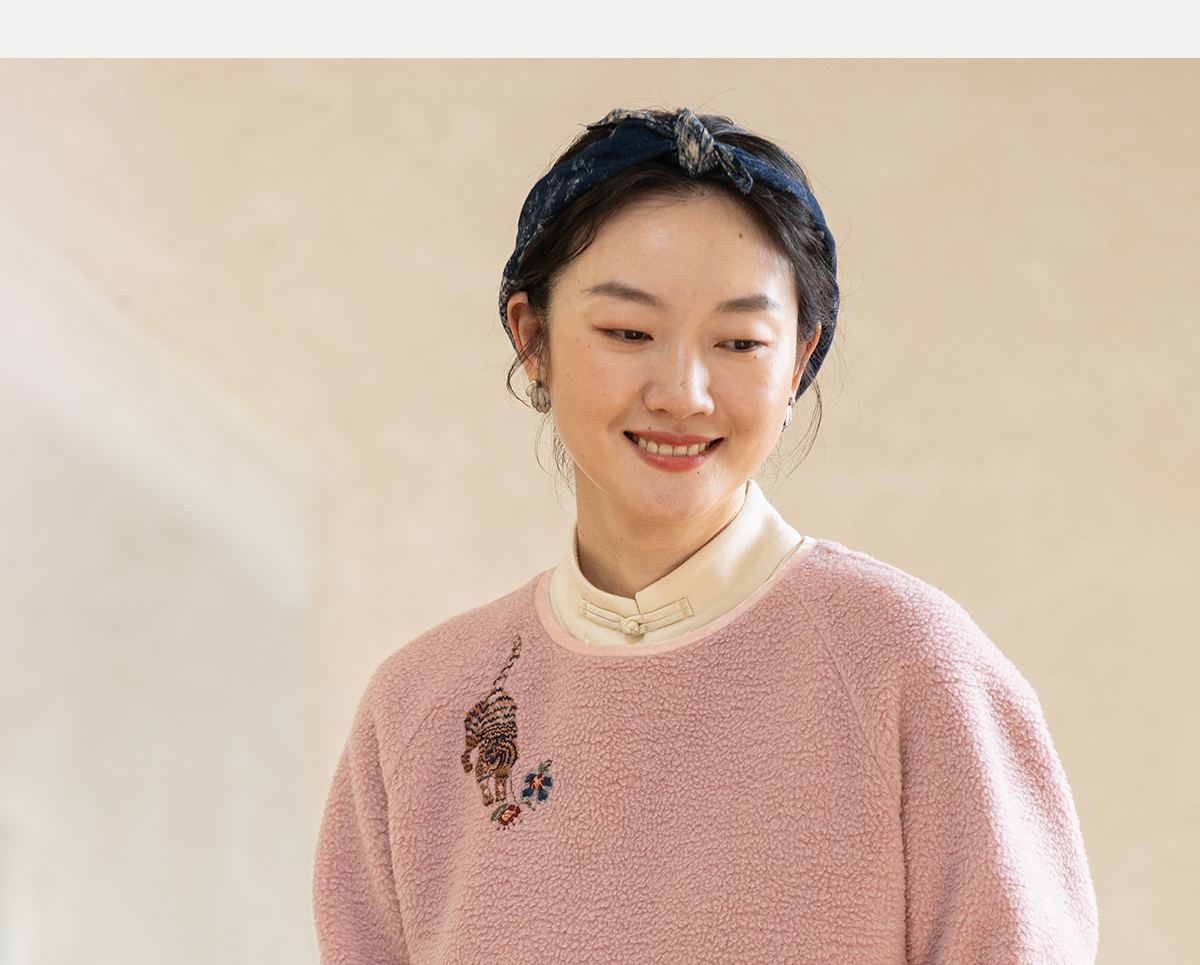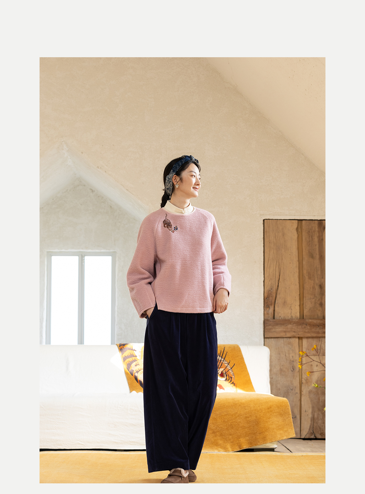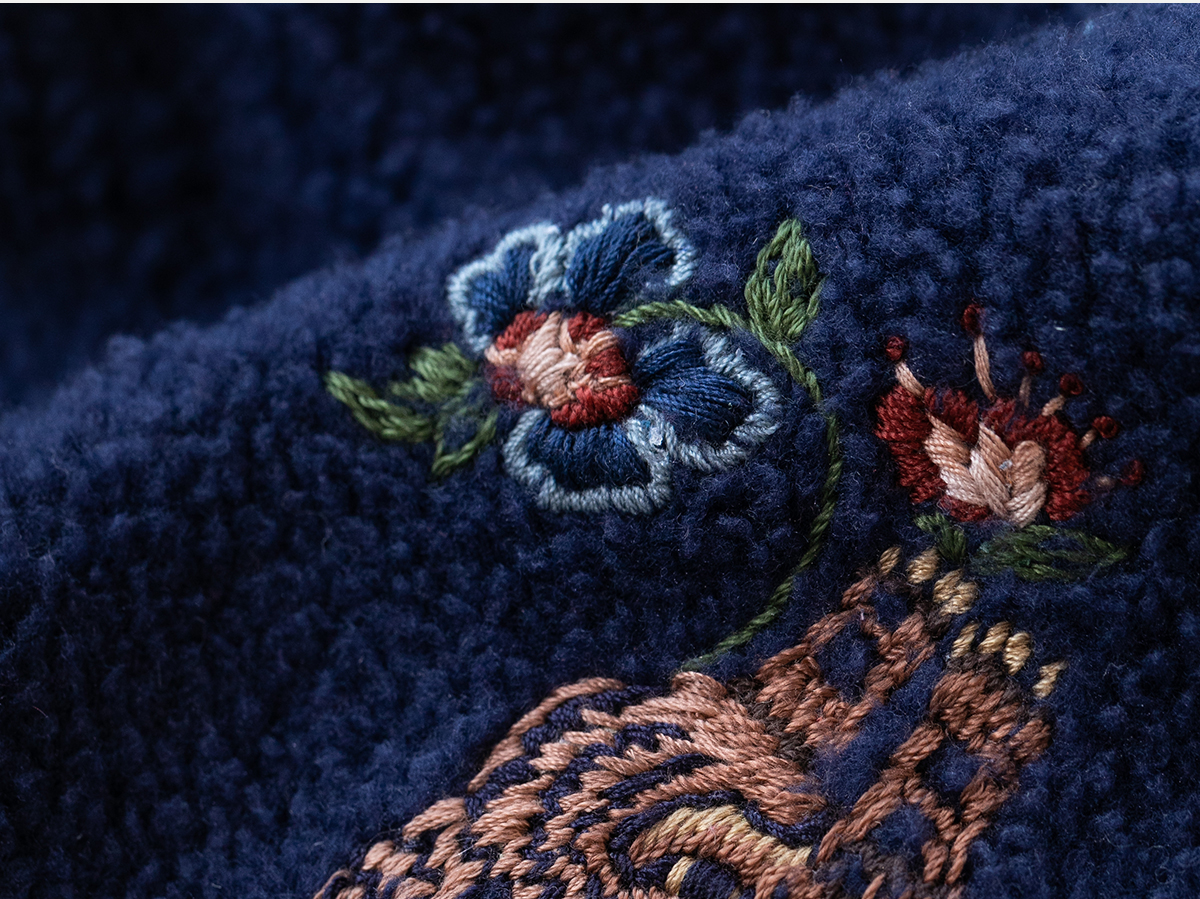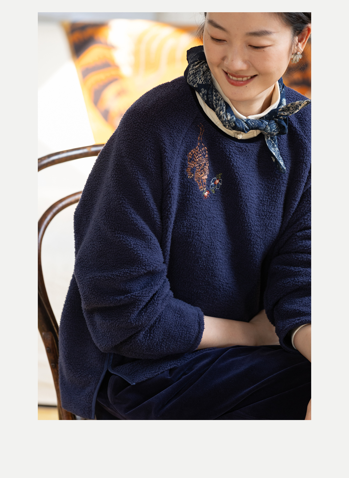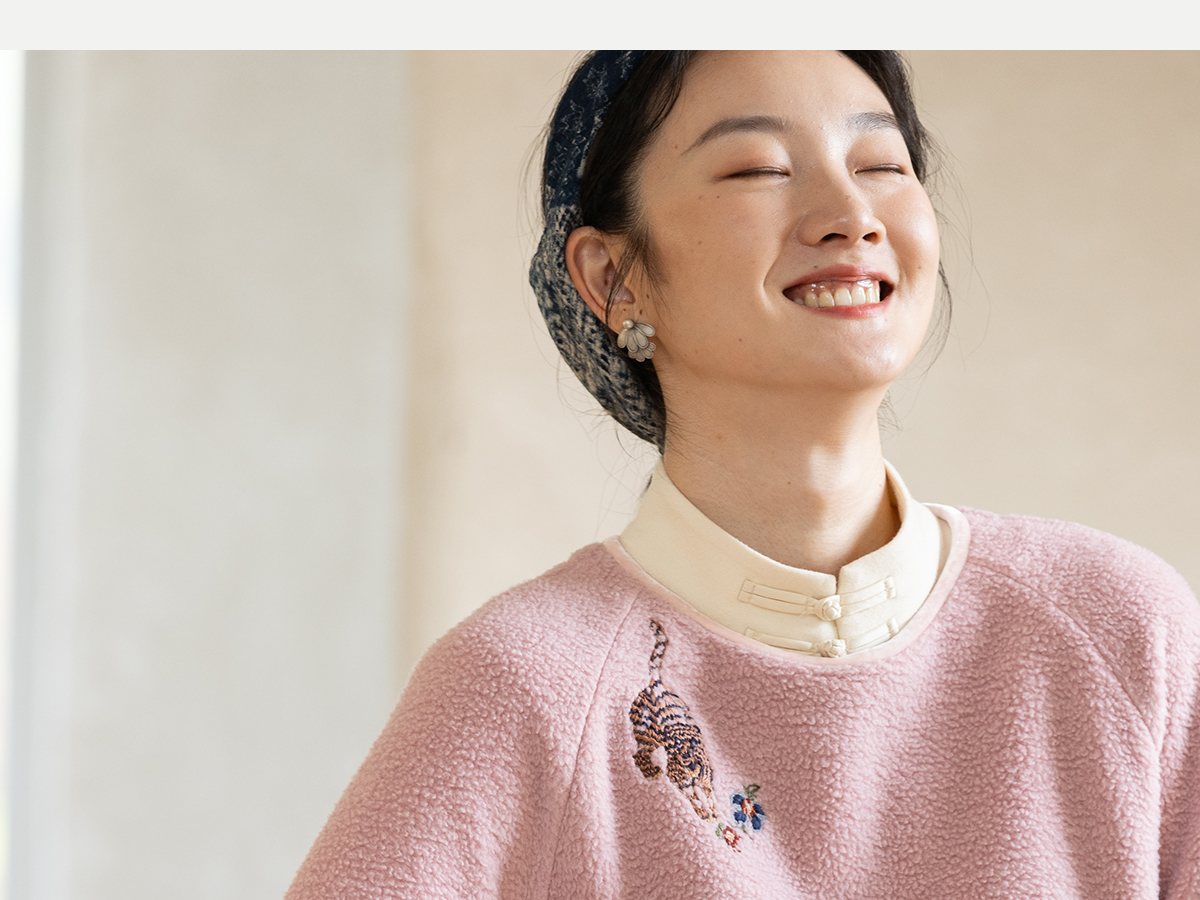 牧衣游原创 老虎与花手工刺绣卫衣冬舒适圆领宽松保暖上衣 松木白