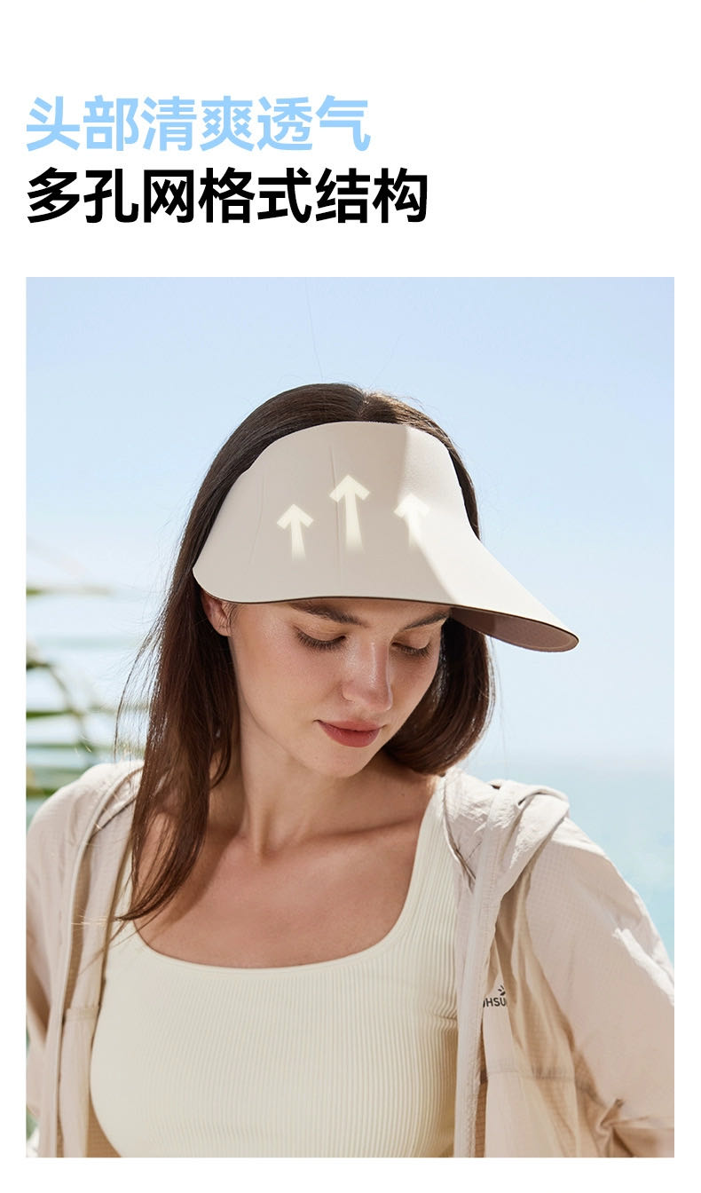 头部清爽透气,多孔网格式结构,面料循环透气,持续散热,全天都干爽舒适,帽子约62-65g,体感轻盈。