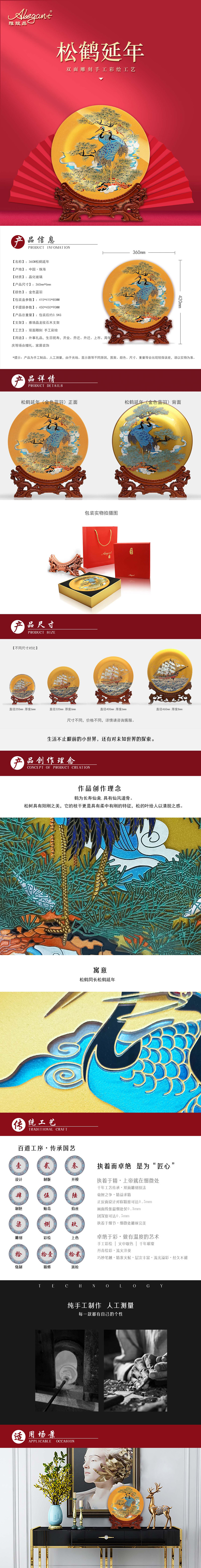 鹤为长寿仙禽,具有仙风道骨,据说,鹤寿无量,与龟一样被视为长寿之王,后世常以“鹤寿”、“鹤龄”、“鹤算”作为祝寿之词.鹤常为仙人所骑,老寿星也常以驾鹤翔云的形象出现.仙鹤独立,翘首远望,姿态优美,色彩不艳不娇,高雅大方。松树具有阳刚之美,它的枝干更是具有柔中有刚的特征,松的叶给人以清脱之感。它是我们民族心目中的吉祥树,是常青不老的象征。松树,有的像虬龙,故称虬松,其枝干多变,直处坦率,弯曲内含,显出龙探青山之状;也有的曲中有直,变化非凡,似蛟龙入海之态;有的巨臂遮天,挺拔刚毅,有拔地钻云腾飞之势也。
