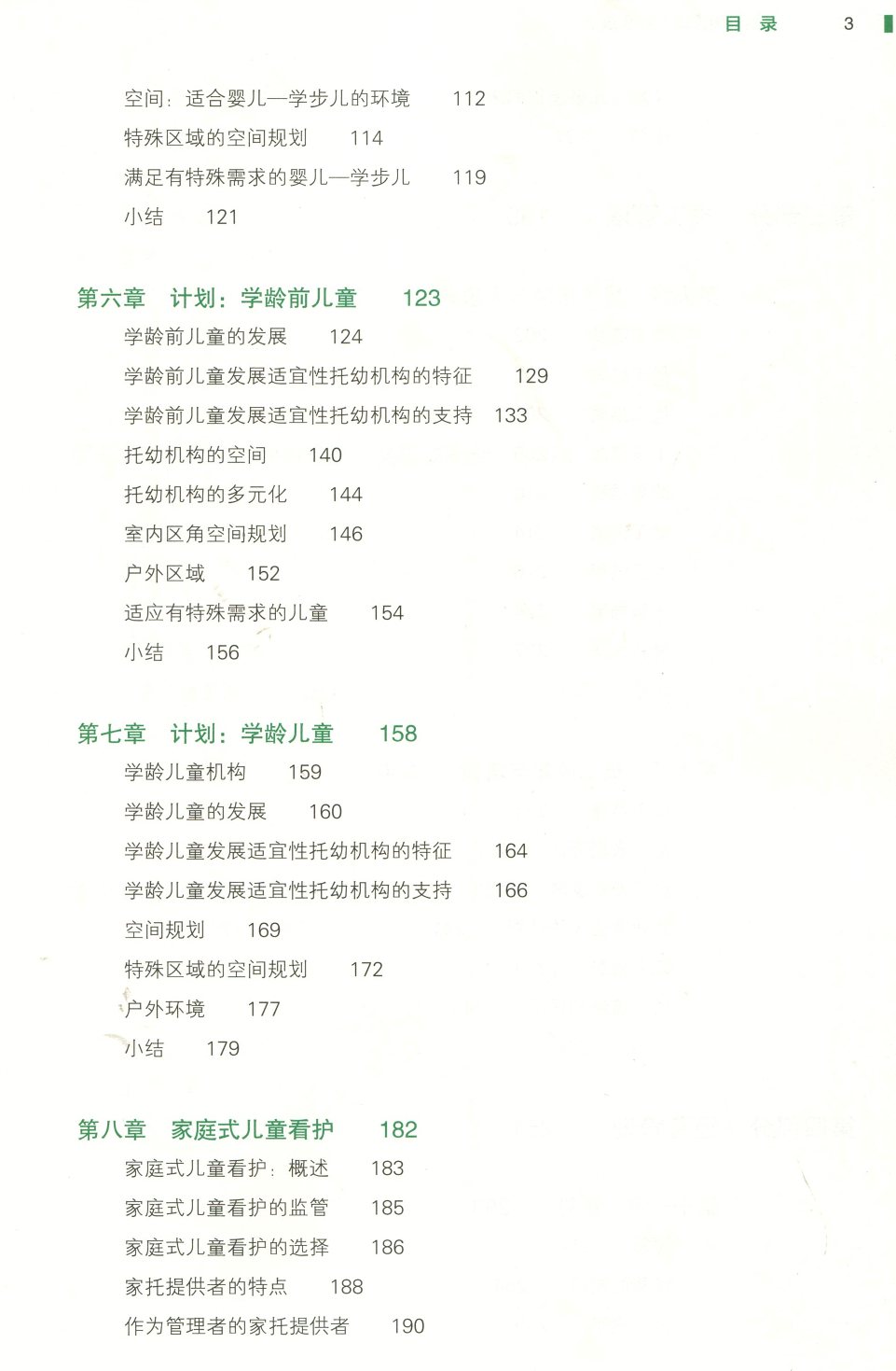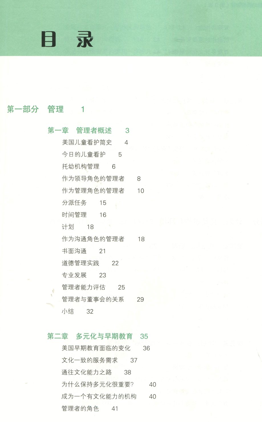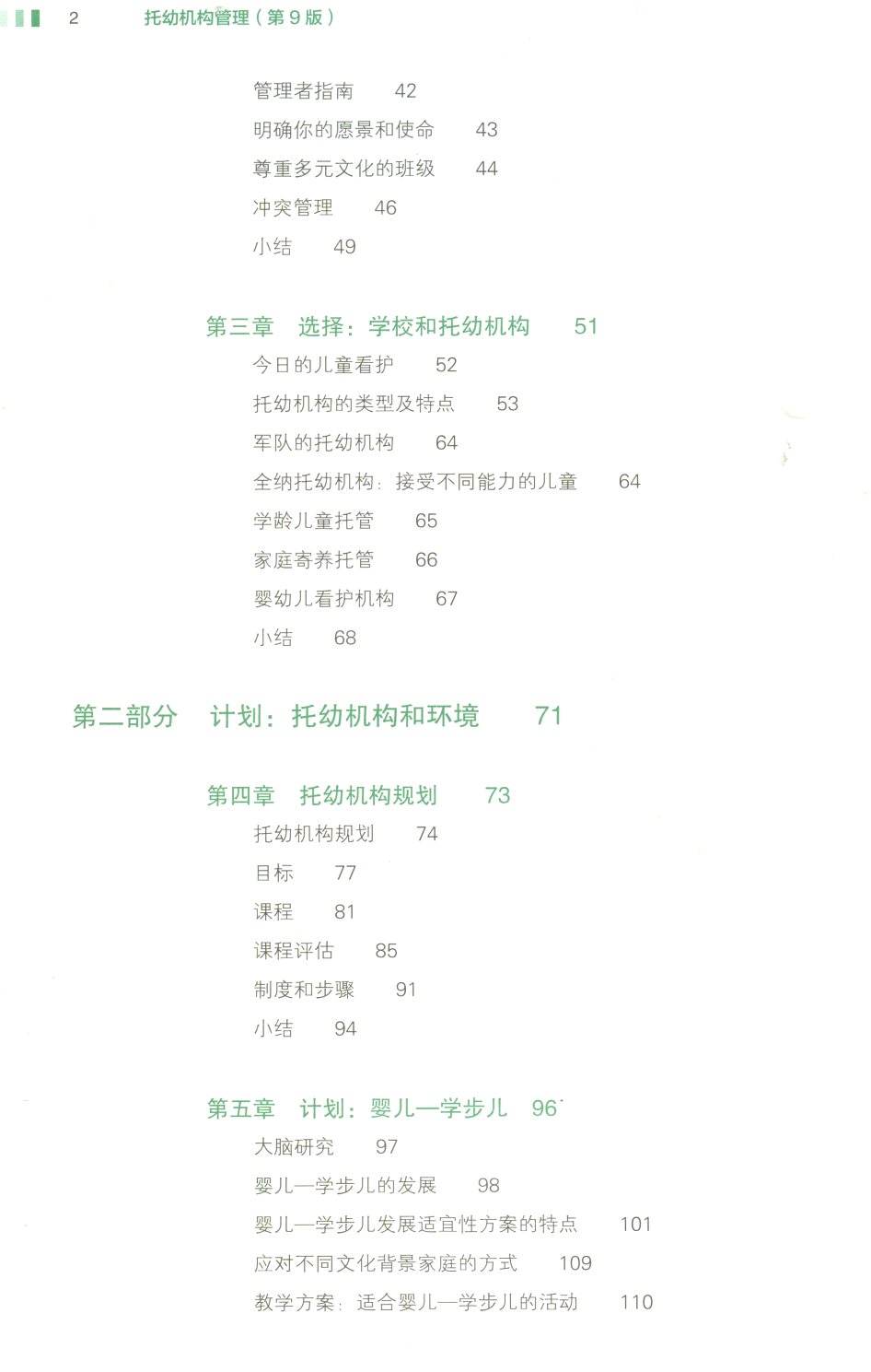 本教材目前已经出版至第9版,分为五个部分。第一部分为管理。这部分讨论了管理者担负的主要责任,介绍了不同类型的托幼机构。第二部分是计划:托幼机构和环境。这部分重点讲述了如何设计组织并建造一个完备的托幼机构,包括课程设计及目标确定,婴儿和学步儿、学龄前儿童、学龄儿童三个年龄段的课程设置,有助于读者形成规划各年龄段课程的总体概念。第三部分论及员工管理的问题,包括员工选聘与制定有助于保持员工稳定性的用人政策。第四部分是经营管理,包括成功运营一个托幼机构所必须采取的措施。第五部分是园所外部公共关系,可使读者将视野从机构内部转到影响机构的外部环境上来。总体而言,本书注重从托幼机构管理的实务工作需要出发进行阐述和分析,而不是停留在对问题的理论探讨上,而且还提供了技术性策略。每章后都提供大量联系实际思考的问题或实践操作练习,并附有案例帮助读者应用本章知识作出分析,以增强对所学内容的理解。