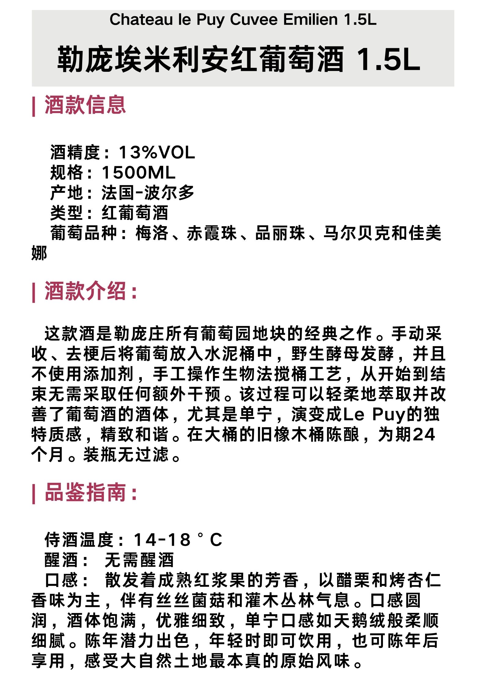 勒庞庄园 传统红葡萄酒1.5L Le Puy Emilien1.5L