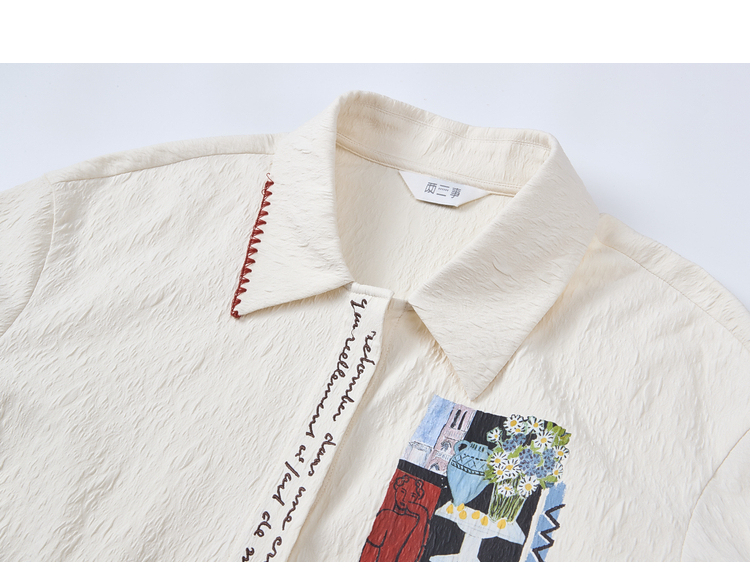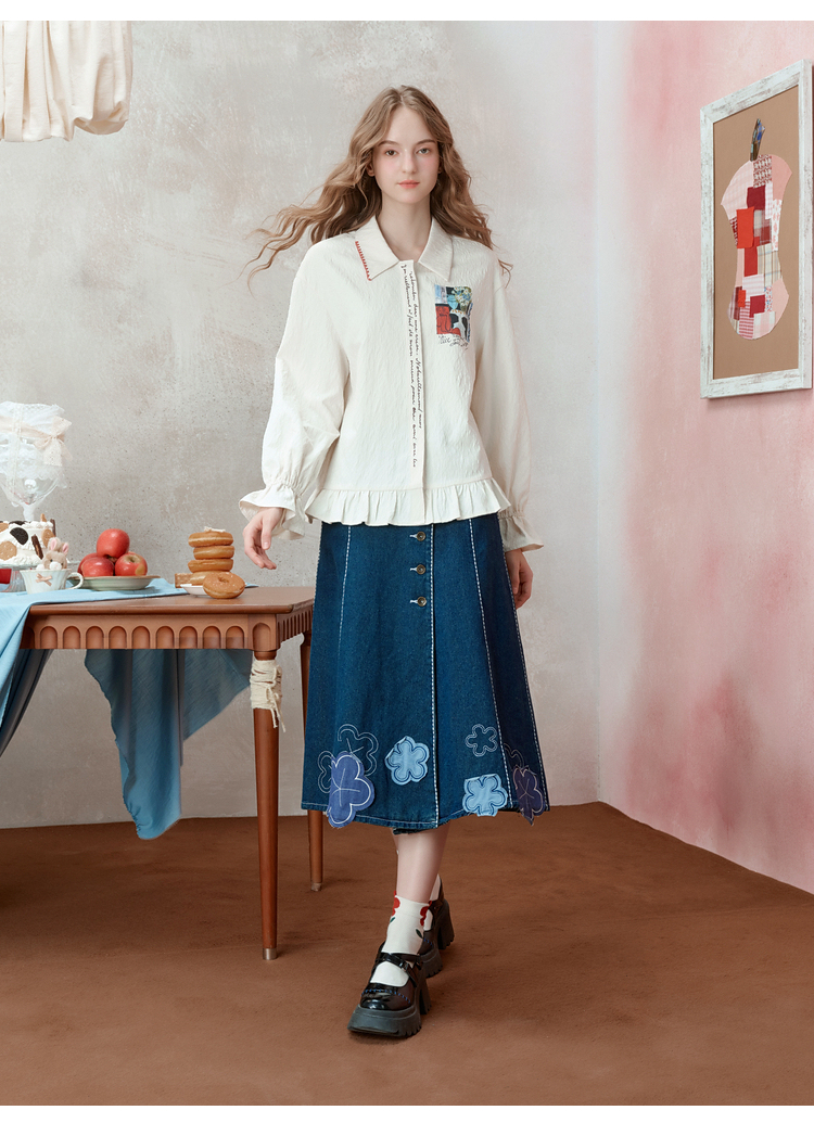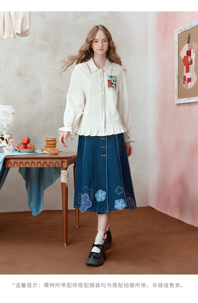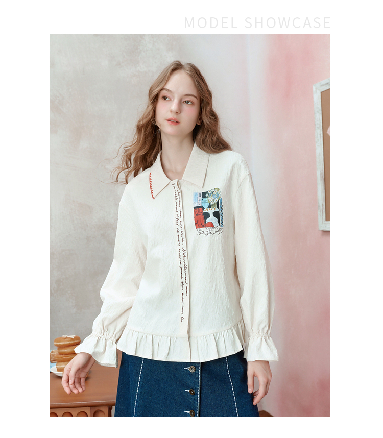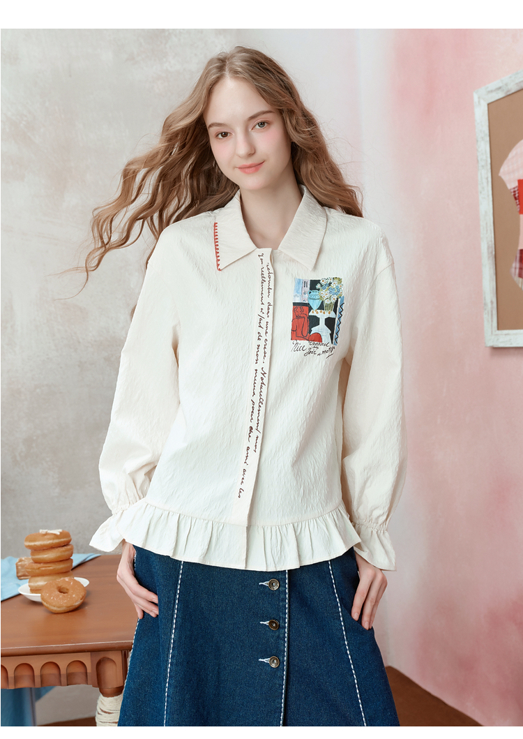 两三事追风日记2025冬季新款文艺风荷叶边下摆刺绣门襟印花衬衫女