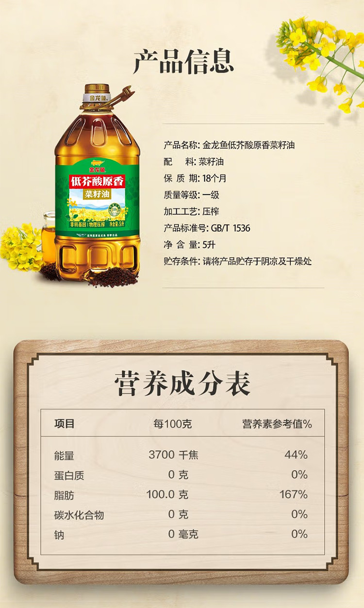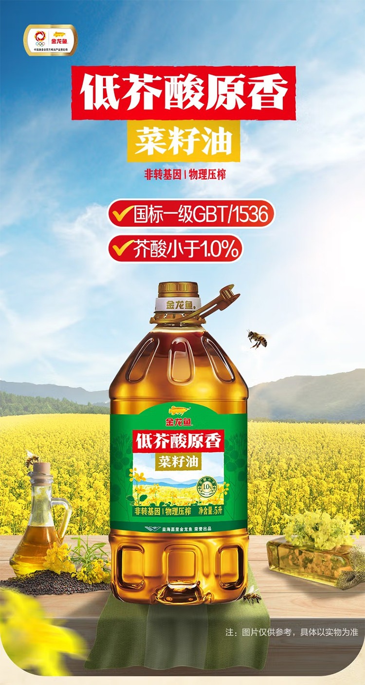 金龙鱼低芥酸原香菜籽油非转压榨一级5L