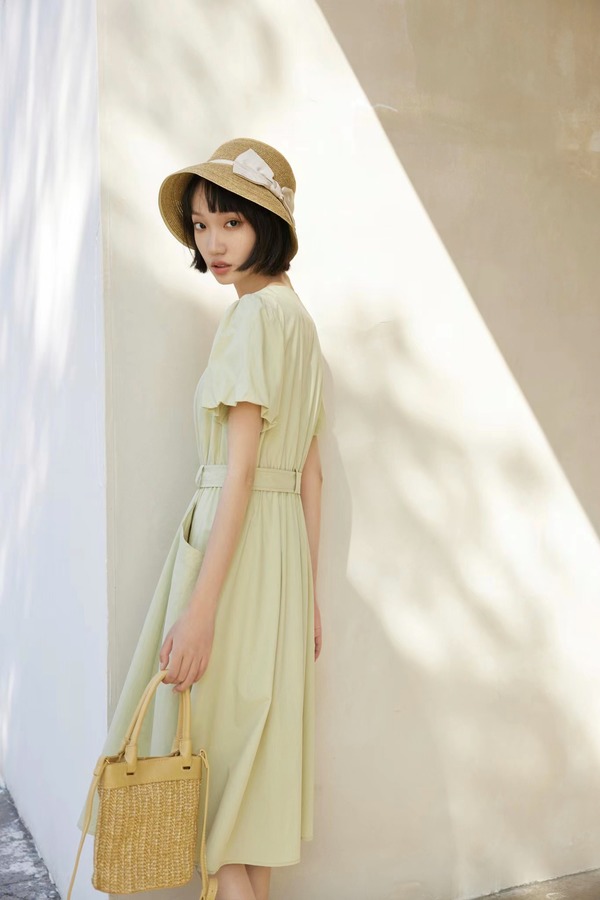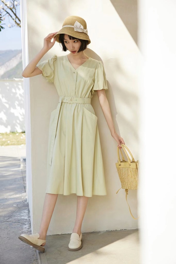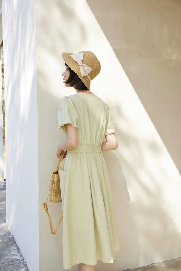 Le Malene 气质舒适淡绿色泡泡袖收腰显瘦连衣裙 18196