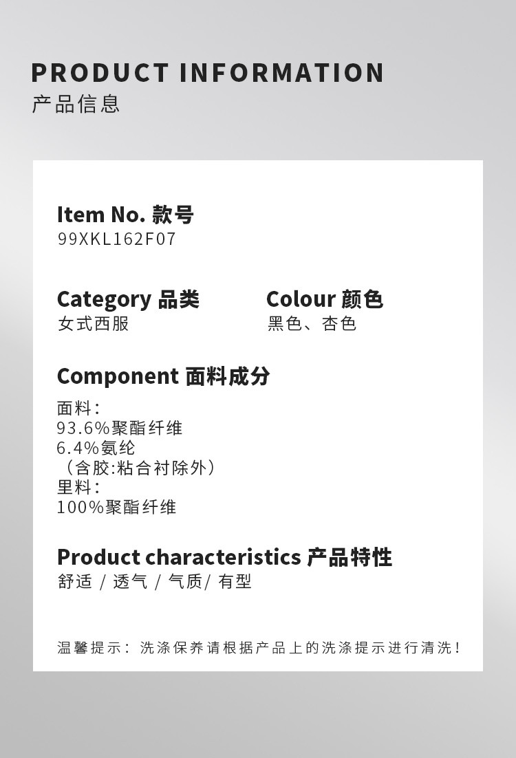 面料:93.6%聚酯纤维 6.4%氨纶 (含胶:粘合衬除外) 里料:100%聚酯纤维