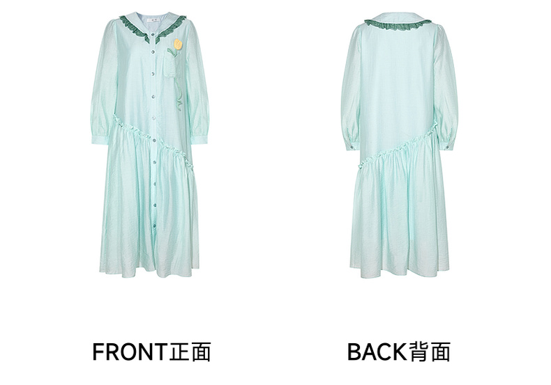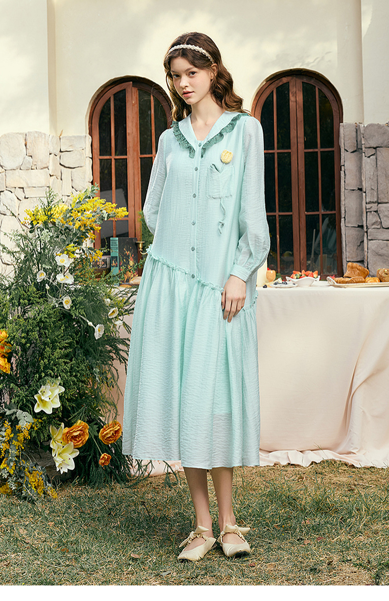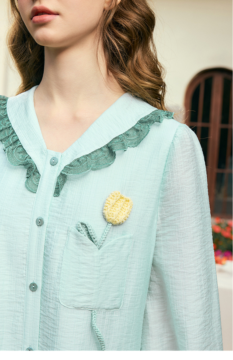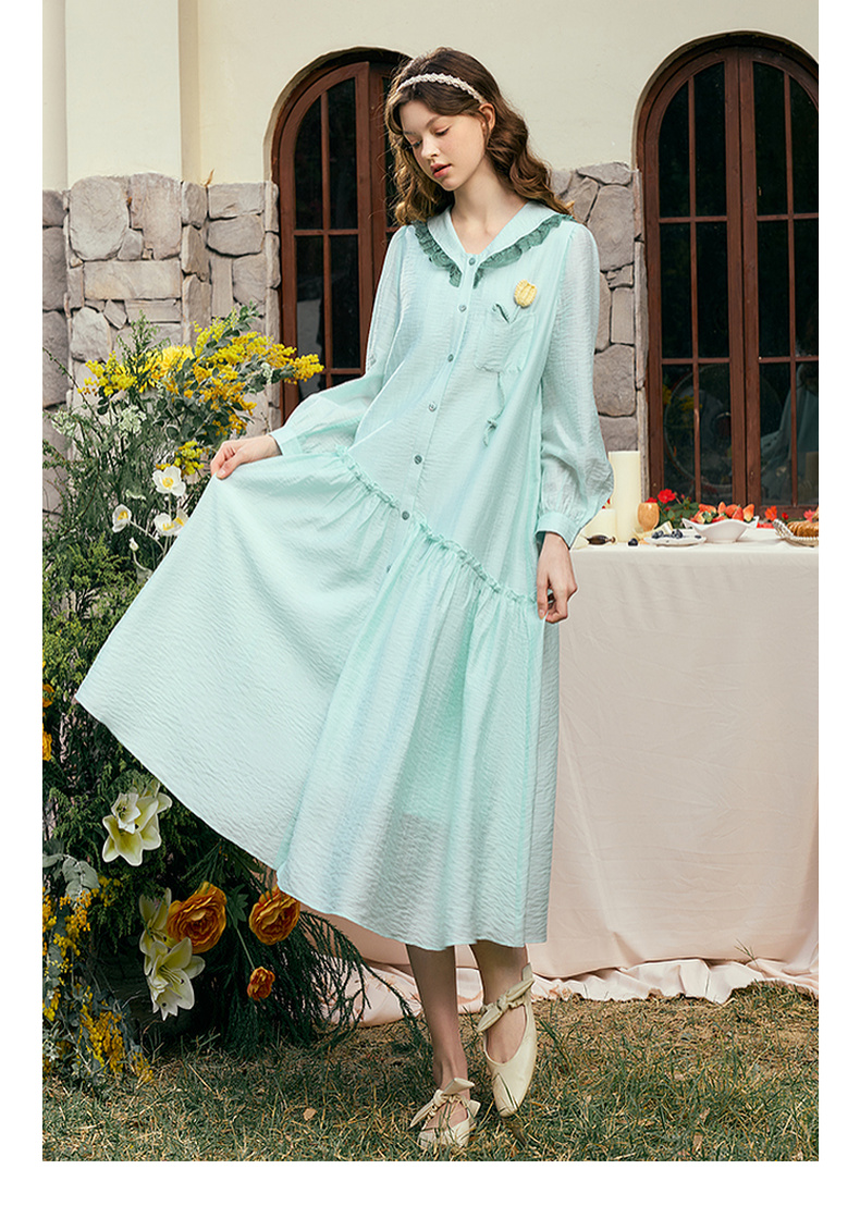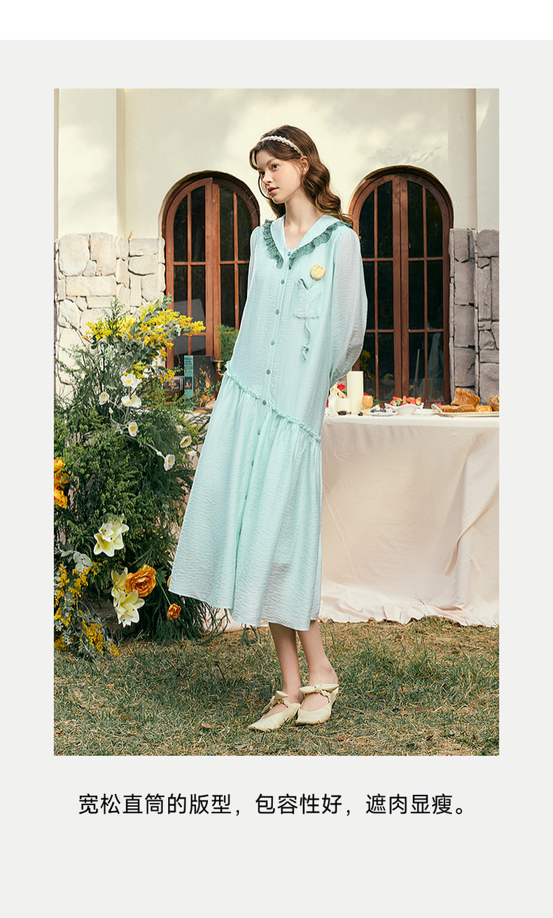 两三事 与春有约 2025春季新款小清新立体花朵蕾丝拼接翻领连衣裙