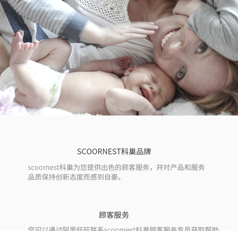 - Scoornest始终秉承给每一位宝宝送去科学的、关心的、创新的成长体验,通过提供商品和服务,使顾客形成守护、发展、巩固这种弥足珍贵的亲情的爱。