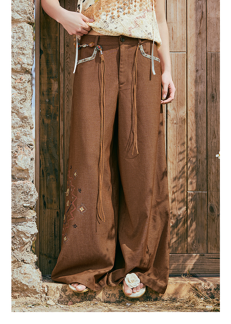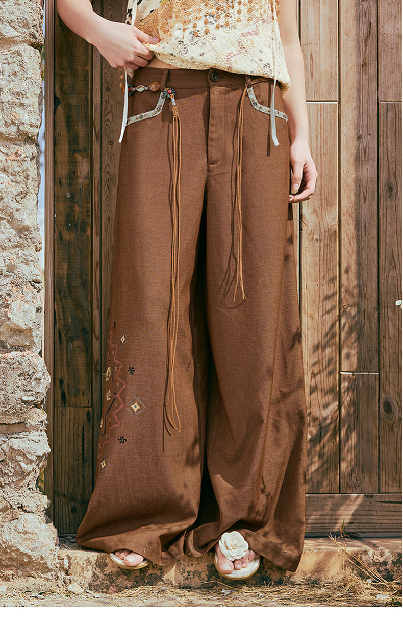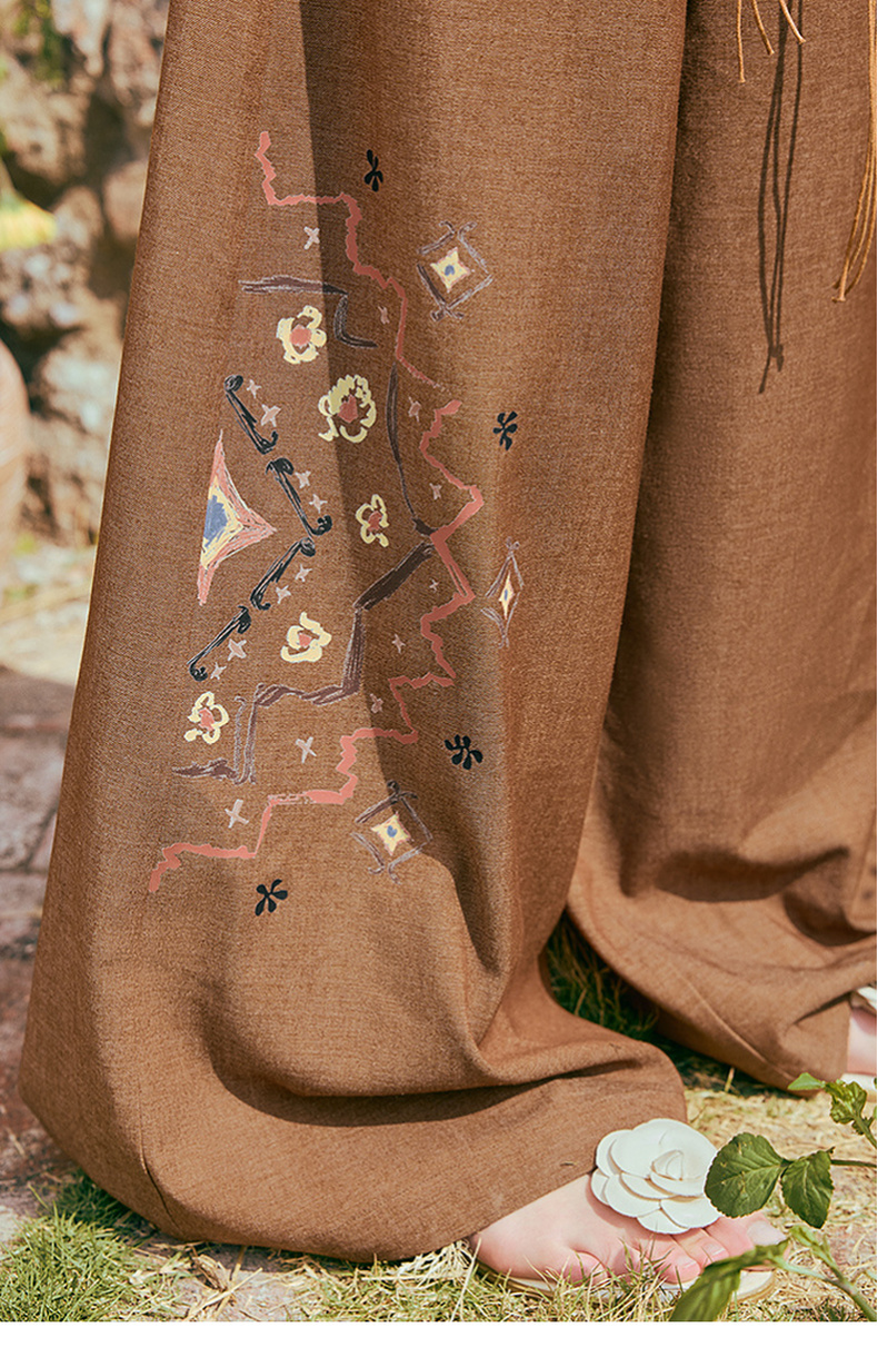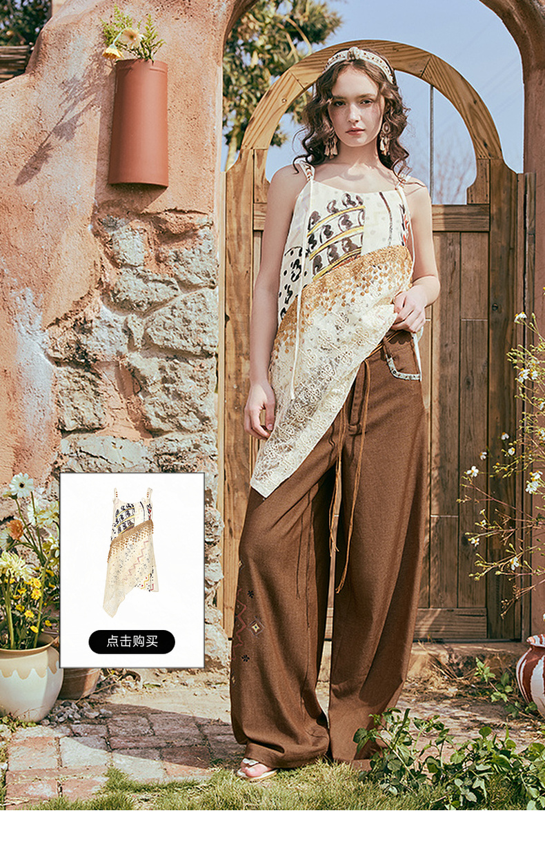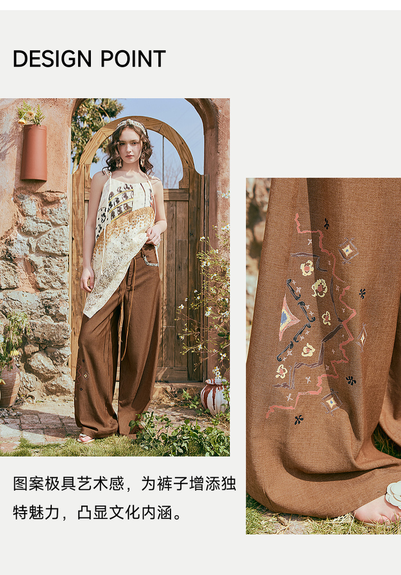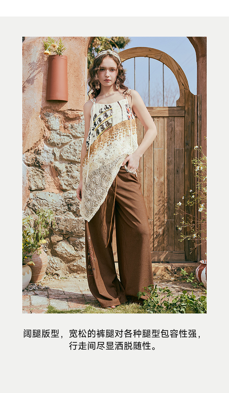 两三事 浪游波嬉 2025夏季新款文艺风印花织带拼接阔腿休闲裤女