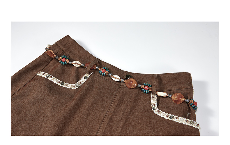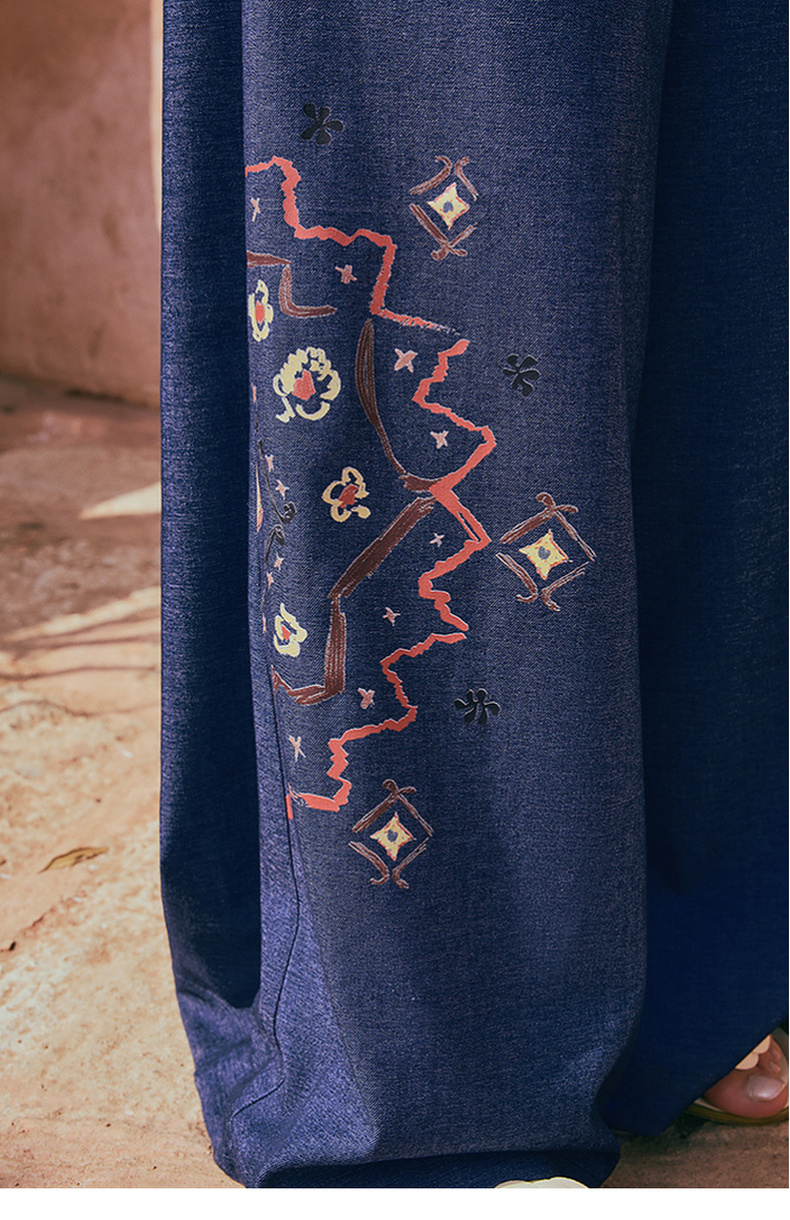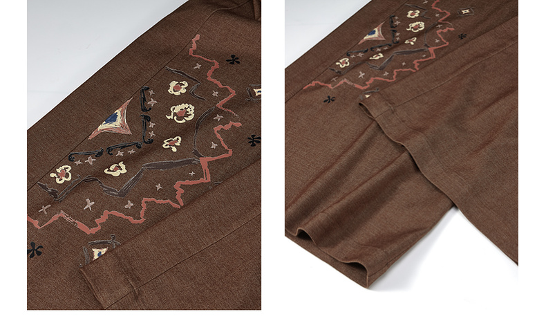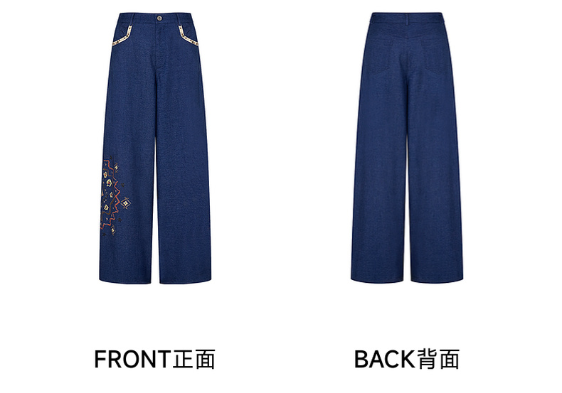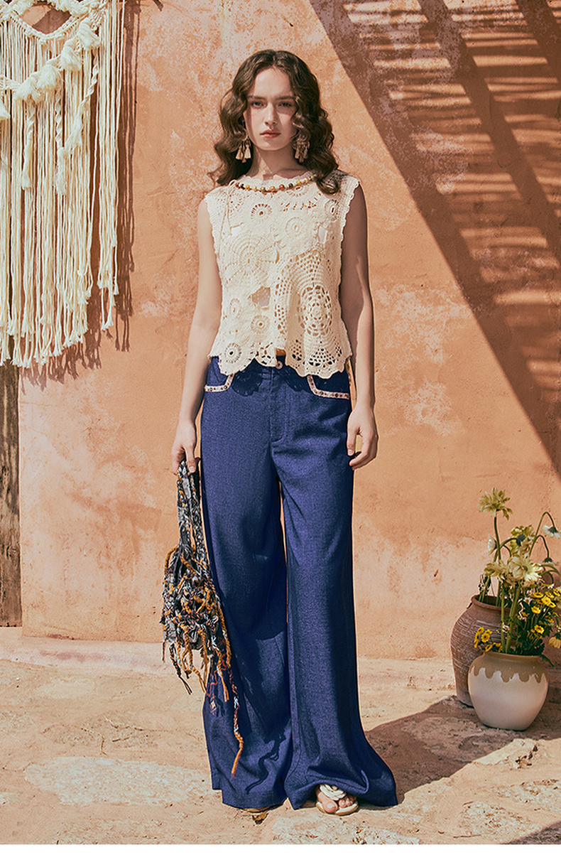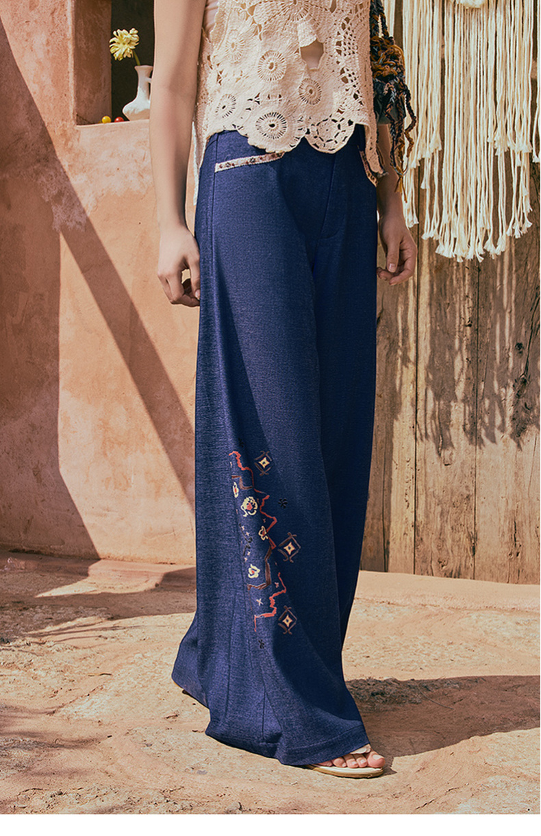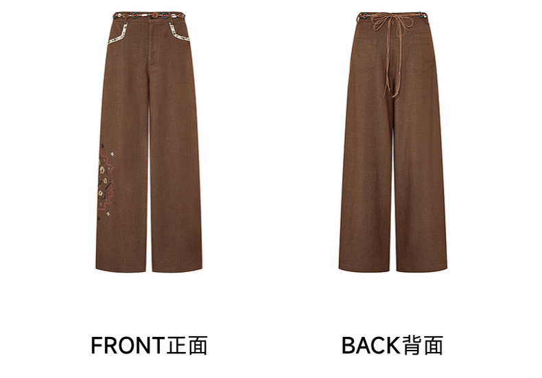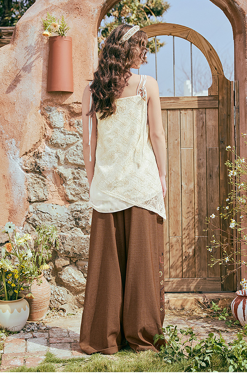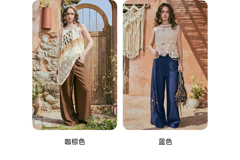两三事 浪游波嬉 2025夏季新款文艺风印花织带拼接阔腿休闲裤女