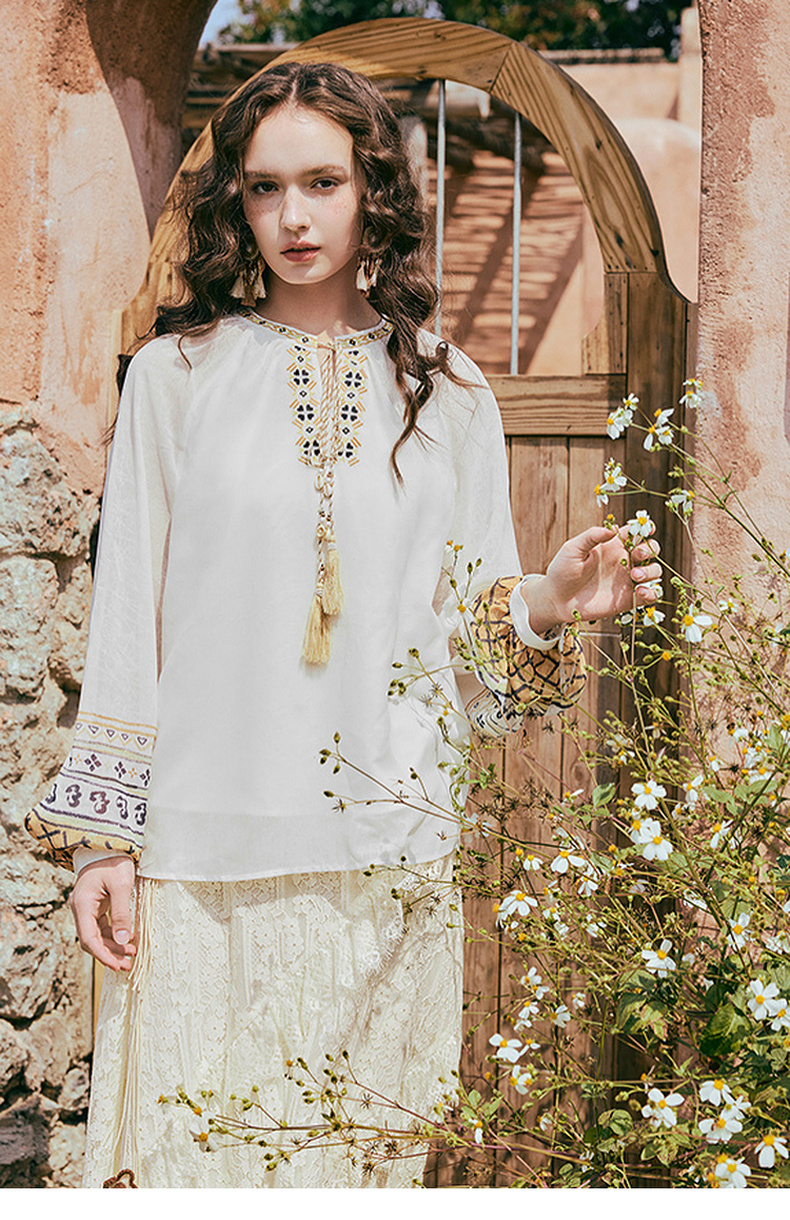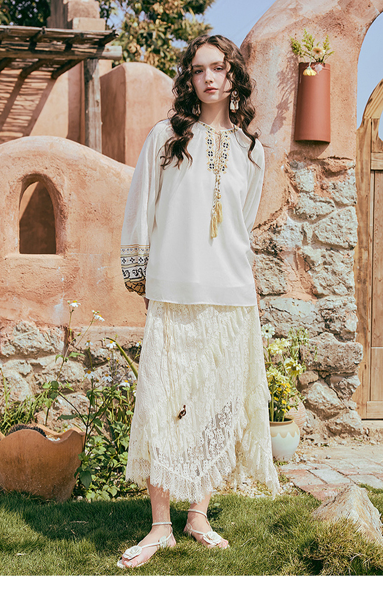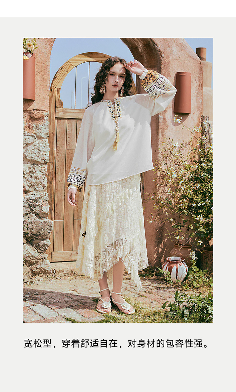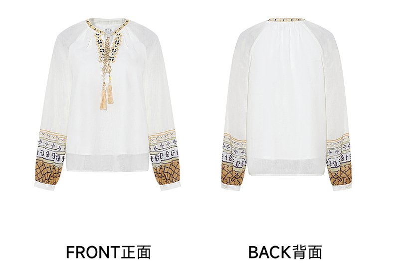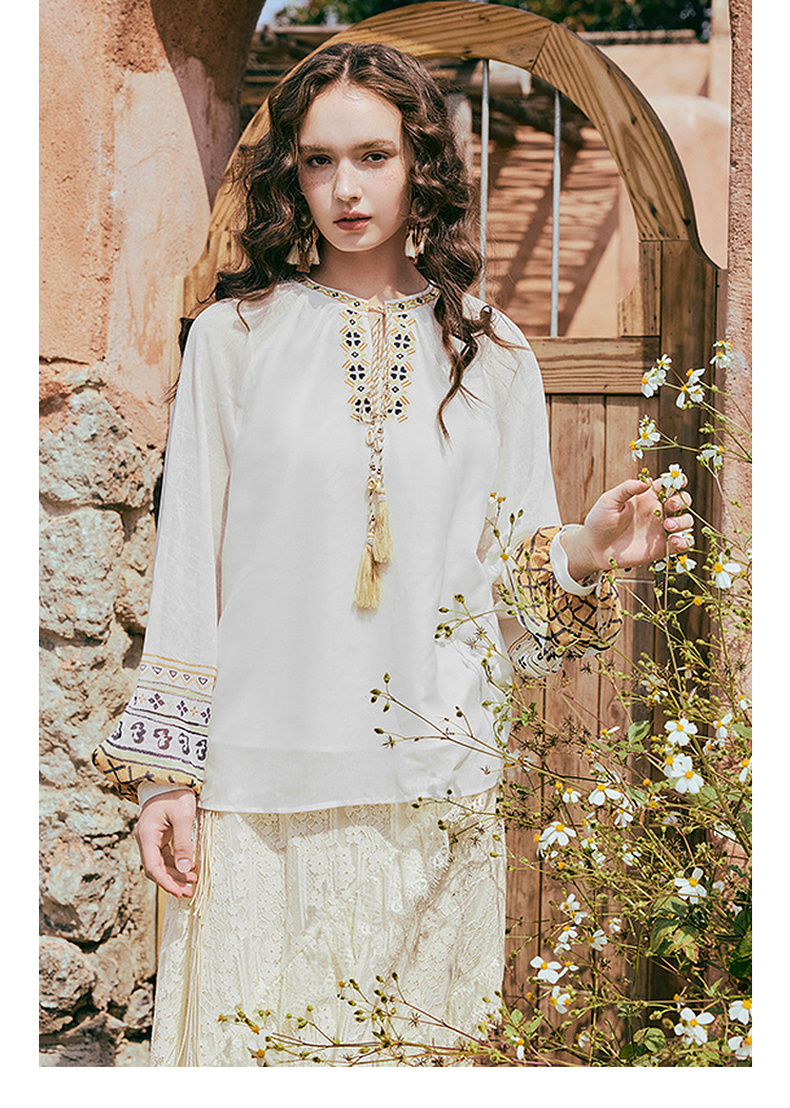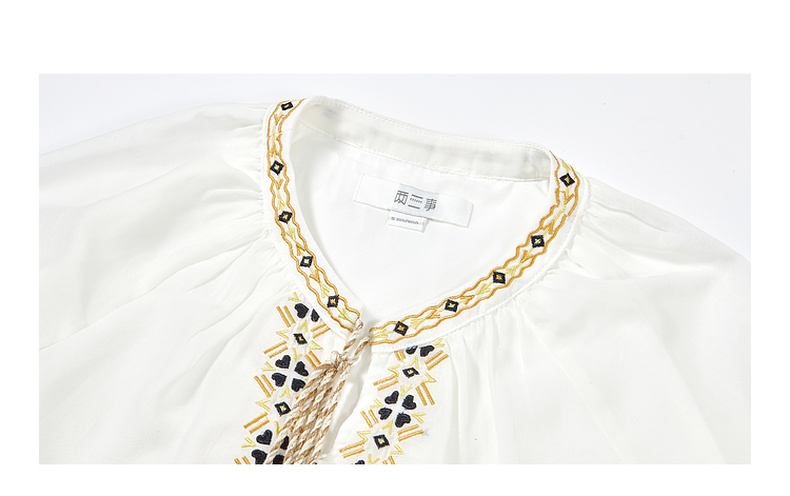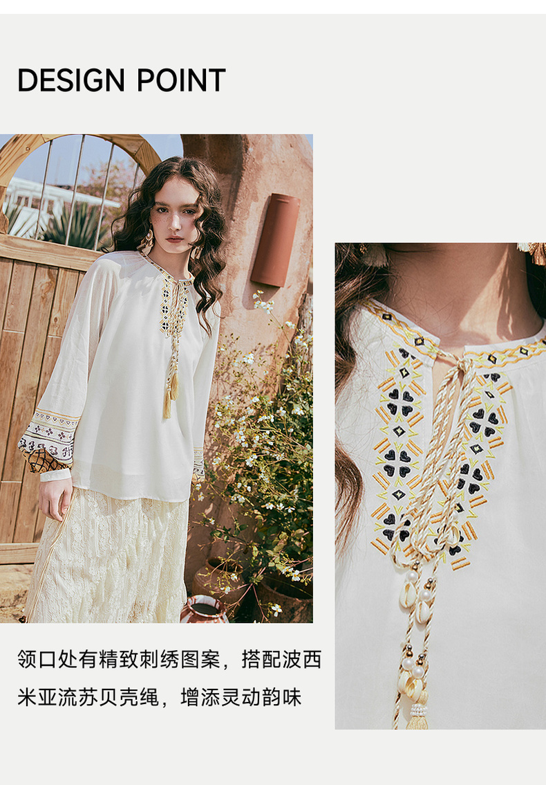 两三事 云沙鎏谣 2025夏季新款民族风刺绣流苏绑带印花袖雪纺衫女