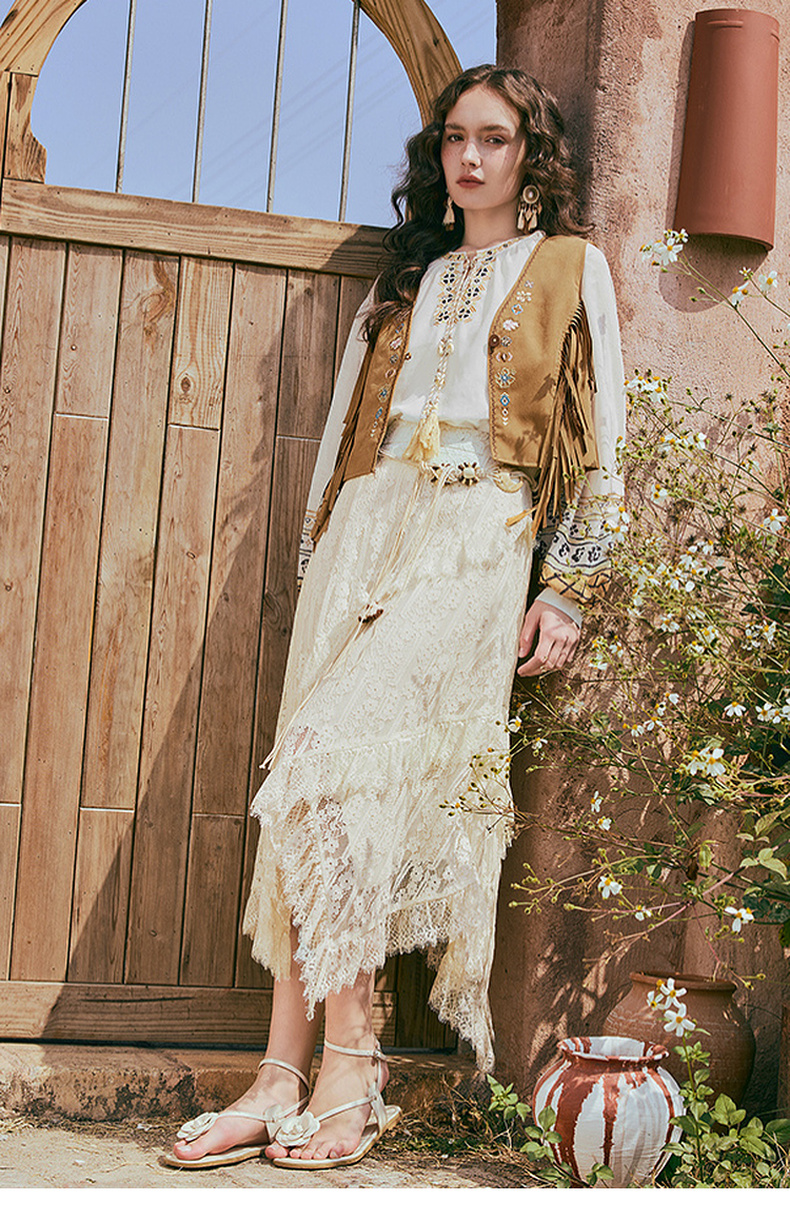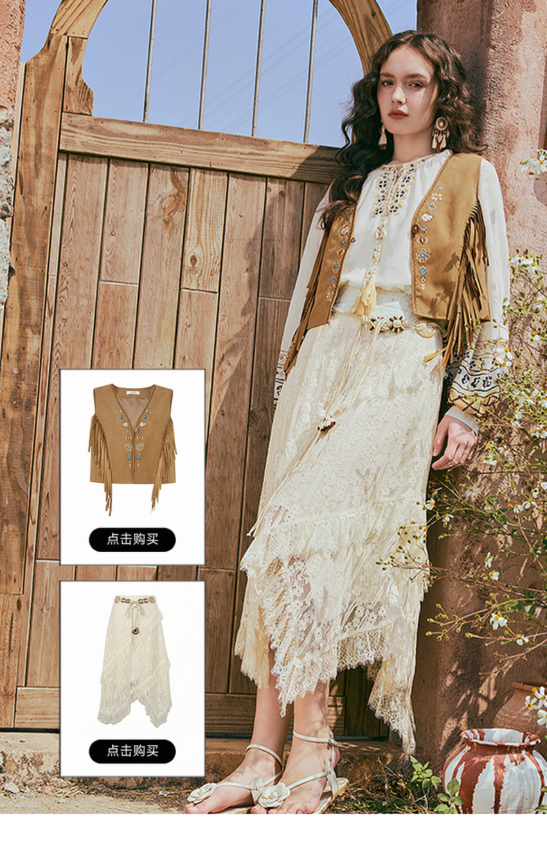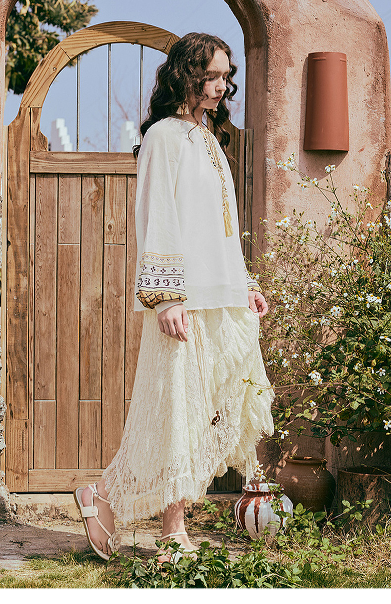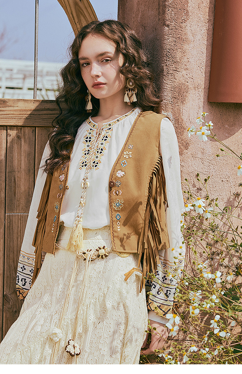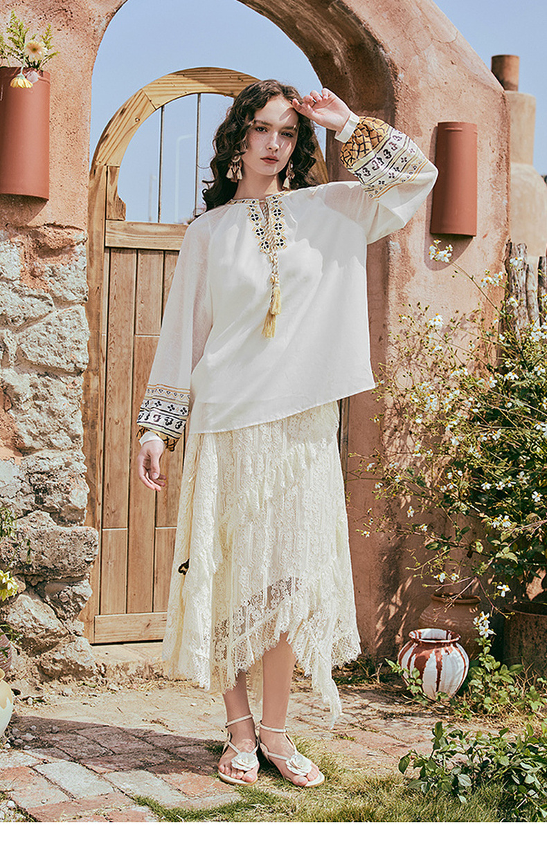 两三事 云沙鎏谣 2025夏季新款民族风刺绣流苏绑带印花袖雪纺衫女